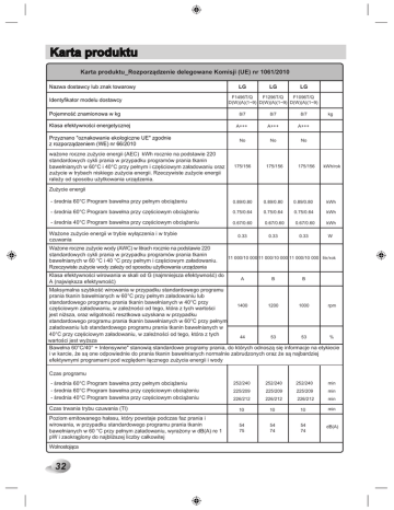 Karta produktu Karta produktu_Rozporządzenie delegowane Komisji (UE) nr 1061/2010 Nazwa dostawcy lub znak towarowy Identyfikator modelu dostawcy Pojemność znamionowa w kg Klasa efektywności energetycznej Przyznano "oznakowanie ekologiczne UE" zgodnie z rozporządzeniem (WE) nr 66/2010 ważone roczne zużycie energii (AEC) kWh rocznie na podstawie 220 standardowych cykli prania w przypadku programów prania tkanin bawełnianych w 60°C i 40°C przy pełnym i częściowym załadowaniu oraz zużycie w trybach niskiego zużycia energii. Rzeczywiste zużycie energii rależy od sposobu użytkowania urządzenia. LG LG LG F1496T/Q F1296T/Q F1096T/Q D(W)(A)(1~9) D(W)(A)(1~9) D(W)(A)(1~9) 8/7 8/7 8/7 A+++ A+++ A+++ No No No 175/156 175/156 175/156 kg kWh/rok Zużycie energii - średnia 60°C Program bawełna przy pełnym obciążeniu 0.89/0.80 0.89/0.80 0.89/0.80 kWh - średnia 60°C Program bawełna przy częściowym obciążeniu 0.75/0.64 0.75/0.64 0.75/0.64 kWh - średnia 40°C Program bawełna przy częściowym obciążeniu 0.67/0.60 0.67/0.60 0.67/0.60 kWh 0.33 0.33 0.33 W Ważone zużycie energii w trybie wyłączenia i w trybie czuwania Ważone roczne zużycie wody (AWC) w litrach rocznie na podstawie 220 standardowych cykli prania w przypadku programów prania tkanin bawełnianych w 60 °C i 40 °C przy pełnym i częściowym załadowaniu. Rzeczywiste zużycie wody zależy od sposobu użytkowania urządzenia Klasa efektywności wirowania w skali od G (najmniejsza efektywność) do A (największa efektywność) 11 000/10 000 11 000/10 000 11 000/10 000 litr/rok A B B Maksymalna szybkość wirowania w przypadku standardowego programu prania tkanin bawełnianych w 60°C przy pełnym załadowaniu lub standardowego programu prania tkanin bawełnianych w 40°C przy rpm 1400 1200 1000 częściowym załadowaniu, w zależności od tego, która z tych wartości jest niższa, oraz wilgotność resztkowa uzyskana w przypadku standardowego programu prania tkanin bawełnianych w 60°C przy pełnym załadowaniu lub standardowego programu prania tkanin bawełnianych w 40°C przy częściowym załadowaniu, w zależności od tego, która z tych % 44 53 53 wartości jest wyższa Bawełna 60°C/40° + Intensywne" stanowią standardowe programy prania, do których odnoszą się informacje na etykiecie i w karcie, że są one odpowiednie do prania tkanin bawełnianych normalnie zabrudzonych oraz że są najbardziej efektywnymi programami pod względem łącznego zużycia energii i wody Czas programu - średnia 60°C Program bawełna przy pełnym obciążeniu - średnia 60°C Program bawełna przy częściowym obciążeniu - średnia 40°C Program bawełna przy częściowym obciążeniu 252/240 252/240 252/240 min 225/209 225/209 225/209 min 226/212 226/212 226/212 min Czas trwania trybu czuwania (Tl) 10 10 10 min Poziom emitowanego hałasu, który powstaje podczas faz prania i wirowania, w przypadku standardowego programu prania tkanin bawełnianych w 60 °C przy pełnym załadowaniu, wyrażony w dB(A) re 1 pW i zaokrąglony do najbliższej liczby całkowitej 54 75 54 74 54 74 dB(A) Wolnostojąca 32