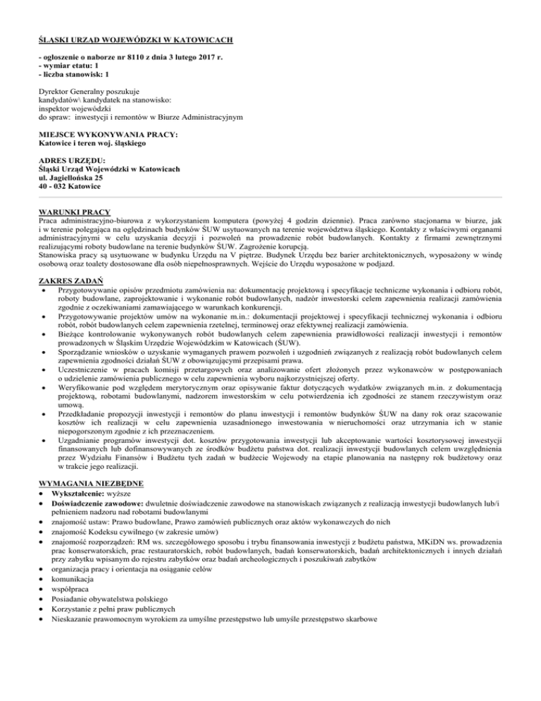 ŚLĄSKI URZĄD WOJEWÓDZKI W KATOWICACH - ogłoszenie o naborze nr 8110 z dnia 3 lutego 2017 r. - wymiar etatu: 1 - liczba stanowisk: 1 Dyrektor Generalny poszukuje kandydatów\ kandydatek na stanowisko: inspektor wojewódzki do spraw: inwestycji i remontów w Biurze Administracyjnym MIEJSCE WYKONYWANIA PRACY: Katowice i teren woj. śląskiego ADRES URZĘDU: Śląski Urząd Wojewódzki w Katowicach ul. Jagiellońska 25 40 - 032 Katowice WARUNKI PRACY Praca administracyjno-biurowa z wykorzystaniem komputera (powyżej 4 godzin dziennie). Praca zarówno stacjonarna w biurze, jak i w terenie polegająca na oględzinach budynków ŚUW usytuowanych na terenie województwa śląskiego. Kontakty z właściwymi organami administracyjnymi w celu uzyskania decyzji i pozwoleń na prowadzenie robót budowlanych. Kontakty z firmami zewnętrznymi realizującymi roboty budowlane na terenie budynków ŚUW. Zagrożenie korupcją. Stanowiska pracy są usytuowane w budynku Urzędu na V piętrze. Budynek Urzędu bez barier architektonicznych, wyposażony w windę osobową oraz toalety dostosowane dla osób niepełnosprawnych. Wejście do Urzędu wyposażone w podjazd. ZAKRES ZADAŃ Przygotowywanie opisów przedmiotu zamówienia na: dokumentację projektową i specyfikacje techniczne wykonania i odbioru robót, roboty budowlane, zaprojektowanie i wykonanie robót budowlanych, nadzór inwestorski celem zapewnienia realizacji zamówienia zgodnie z oczekiwaniami zamawiającego w warunkach konkurencji. Przygotowywanie projektów umów na wykonanie m.in.: dokumentacji projektowej i specyfikacji technicznej wykonania i odbioru robót, robót budowlanych celem zapewnienia rzetelnej, terminowej oraz efektywnej realizacji zamówienia. Bieżące kontrolowanie wykonywanych robót budowlanych celem zapewnienia prawidłowości realizacji inwestycji i remontów prowadzonych w Śląskim Urzędzie Wojewódzkim w Katowicach (ŚUW). Sporządzanie wniosków o uzyskanie wymaganych prawem pozwoleń i uzgodnień związanych z realizacją robót budowlanych celem zapewnienia zgodności działań ŚUW z obowiązującymi przepisami prawa. Uczestniczenie w pracach komisji przetargowych oraz analizowanie ofert złożonych przez wykonawców w postępowaniach o udzielenie zamówienia publicznego w celu zapewnienia wyboru najkorzystniejszej oferty. Weryfikowanie pod względem merytorycznym oraz opisywanie faktur dotyczących wydatków związanych m.in. z dokumentacją projektową, robotami budowlanymi, nadzorem inwestorskim w celu potwierdzenia ich zgodności ze stanem rzeczywistym oraz umową. Przedkładanie propozycji inwestycji i remontów do planu inwestycji i remontów budynków ŚUW na dany rok oraz szacowanie kosztów ich realizacji w celu zapewnienia uzasadnionego inwestowania w nieruchomości oraz utrzymania ich w stanie niepogorszonym zgodnie z ich przeznaczeniem. Uzgadnianie programów inwestycji dot. kosztów przygotowania inwestycji lub akceptowanie wartości kosztorysowej inwestycji finansowanych lub dofinansowywanych ze środków budżetu państwa dot. realizacji inwestycji budowlanych celem uwzględnienia przez Wydziału Finansów i Budżetu tych zadań w budżecie Wojewody na etapie planowania na następny rok budżetowy oraz w trakcie jego realizacji. WYMAGANIA NIEZBĘDNE Wykształcenie: wyższe Doświadczenie zawodowe: dwuletnie doświadczenie zawodowe na stanowiskach związanych z realizacją inwestycji budowlanych lub/i pełnieniem nadzoru nad robotami budowlanymi znajomość ustaw: Prawo budowlane, Prawo zamówień publicznych oraz aktów wykonawczych do nich znajomość Kodeksu cywilnego (w zakresie umów) znajomość rozporządzeń: RM ws. szczegółowego sposobu i trybu finansowania inwestycji z budżetu państwa, MKiDN ws. prowadzenia prac konserwatorskich, prac restauratorskich, robót budowlanych, badań konserwatorskich, badań architektonicznych i innych działań przy zabytku wpisanym do rejestru zabytków oraz badań archeologicznych i poszukiwań zabytków organizacja pracy i orientacja na osiąganie celów komunikacja współpraca Posiadanie obywatelstwa polskiego Korzystanie z pełni praw publicznych Nieskazanie prawomocnym wyrokiem za umyślne przestępstwo lub umyśle przestępstwo skarbowe WYMAGANIA DODATKOWE Wykształcenie: wyższe na kierunku budownictwo lub architektura lub urbanistyka lub energetyka Doświadczenie zawodowe: roczne doświadczenie zawodowe w administracji publicznej na stanowiskach urzędniczych związanych z realizacją inwestycji budowlanych lub/i pełnieniem nadzoru nad robotami budowlanymi znajomość ustawy o odpowiedzialności za naruszenie dyscypliny finansów publicznych (w zakresie naruszeń przepisów o zamówieniach publicznych) znajomość Statutu Śląskiego Urzędu Wojewódzkiego w Katowicach znajomość ustawy o służbie cywilnej w zakresie statusu członka korpusu służby cywilnej znajomość ustawy o wojewodzie i administracji rządowej w województwie kreatywność radzenie sobie w sytuacjach kryzysowych negocjowanie myślenie analityczne DOKUMENTY I OŚWIADCZENIA NIEZBĘDNE Życiorys/CV i list motywacyjny Kopie dokumentów potwierdzających spełnienie wymagania niezbędnego w zakresie wykształcenia Kopie dokumentów potwierdzających spełnienie wymagania niezbędnego w zakresie doświadczenia zawodowego / stażu pracy Oświadczenie o posiadaniu obywatelstwa polskiego albo kopia dokumentu potwierdzającego posiadanie polskiego obywatelstwa Oświadczenie o wyrażeniu zgody na przetwarzanie danych osobowych do celów naboru Oświadczenie o korzystaniu z pełni praw publicznych Oświadczenie o nieskazaniu prawomocnym wyrokiem za umyślne przestępstwo lub umyślne przestępstwo skarbowe DOKUMENTY I OŚWIADCZENIA DODATKOWE kopia dokumentu potwierdzającego niepełnosprawność - w przypadku kandydatek/kandydatów, zamierzających skorzystać z pierwszeństwa w zatrudnieniu w przypadku, gdy znajdą się w gronie najlepszych kandydatek/kandydatów Kopie dokumentów