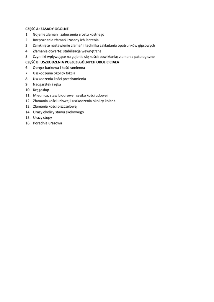 CZĘŚĆ A: ZASADY OGÓLNE 1. Gojenie złamań i zaburzenia zrostu kostnego 2. Rozpoznanie złamań i zasady ich leczenia 3. Zamknięte nastawienie złamań i technika zakładania opatrunków gipsowych 4. Złamania otwarte: stabilizacja wewnętrzna 5. Czynniki wpływające na gojenie się kości; powikłania; złamania patologiczne CZĘŚĆ B: USZKODZENIA POSZCZEGÓLNYCH OKOLIC CIAŁA 6. Obręcz barkowa i kość ramienna 7. Uszkodzenia okolicy łokcia 8. Uszkodzenia kości przedramienia 9. Nadgarstek i ręka 10. Kręgosłup 11. Miednica, staw biodrowy i szyjka kości udowej 12. Złamania kości udowej i uszkodzenia okolicy kolana 13. Złamania kości piszczelowej 14. Urazy okolicy stawu skokowego 15. Urazy stopy 16. Poradnia urazowa
