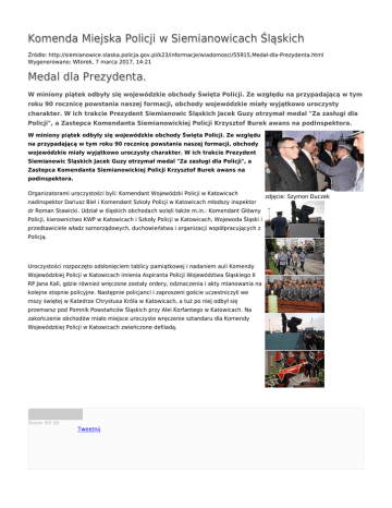 Komenda Miejska Policji w Siemianowicach Śląskich Źródło: http://siemianowice.slaska.policja.gov.pl/k23/informacje/wiadomosci/55915,Medal-dla-Prezydenta.html Wygenerowano: Wtorek, 7 marca 2017, 14:21 Medal dla Prezydenta. W miniony piątek odbyły się wojewódzkie obchody Święta Policji. Ze względu na przypadającą w tym roku 90 rocznicę powstania naszej formacji, obchody wojewódzkie miały wyjątkowo uroczysty charakter. W ich trakcie Prezydent Siemianowic Śląskich Jacek Guzy otrzymał medal "Za zasługi dla Policji", a Zastepca Komendanta Siemianowickiej Policji Krzysztof Burek awans na podinspektora. W miniony piątek odbyły się wojewódzkie obchody Święta Policji. Ze względu na przypadającą w tym roku 90 rocznicę powstania naszej formacji, obchody wojewódzkie miały wyjątkowo uroczysty charakter. W ich trakcie Prezydent Siemianowic Śląskich Jacek Guzy otrzymał medal "Za zasługi dla Policji", a Zastepca Komendanta Siemianowickiej Policji Krzysztof Burek awans na podinspektora. Organizatorami uroczystości byli: Komendant Wojewódzki Policji w Katowicach nadinspektor Dariusz Biel i Komendant Szkoły Policji w Katowicach młodszy inspektor dr Roman Stawicki. Udział w śląskich obchodach wzięli także m.in.: Komendant Główny Policji, kierownictwo KWP w Katowicach i Szkoły Policji w Katowicach, Wojewoda Śląski i przedtawiciele władz samorządowych, duchowieństwa i organizacji współpracujących z Policją. Uroczystości rozpoczęto odsłonięciem tablicy pamiątkowej i nadaniem auli Komendy Wojewódzkiej Policji w Katowicach imienia Aspiranta Policji Województwa Śląskiego II RP Jana Kali, gdzie również wręczone zostały ordery, odznaczenia i akty mianowania na kolejne stopnie policyjne. Następnie policjanci i zaproszeni goście uczestniczyli we mszy świętej w Katedrze Chrystusa Króla w Katowicach, a tuż po niej odbył się przemarsz pod Pomnik Powstańców Śląskich przy Alei Korfantego w Katowicach. Na zakończenie obchodów miało miejsce uroczyste wręczenie sztandaru dla Komendy Wojewódzkiej Policji w Katowicach zwieńczone defiladą. Ocena: 0/5 (0) Tweetnij zdjęcie: Szymon Duczek