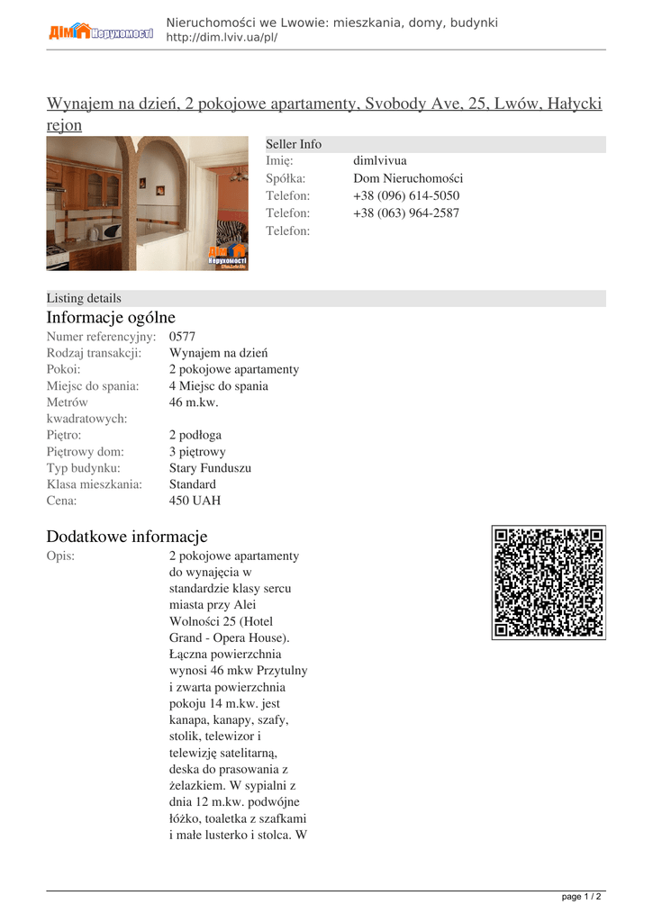 Nieruchomości we Lwowie: mieszkania, domy, budynki http://dim.lviv.ua/pl/ Wynajem na dzień, 2 pokojowe apartamenty, Svobody Ave, 25, Lwów, Hałycki rejon Seller Info Imię: Spółka: Telefon: Telefon: Telefon: dimlvivua Dom Nieruchomości +38 (096) 614-5050 +38 (063) 964-2587 Listing details Informacje ogólne Numer referencyjny: Rodzaj transakcji: Pokoi: Miejsc do spania: Metrów kwadratowych: Piętro: Piętrowy dom: Typ budynku: Klasa mieszkania: Cena: 0577 Wynajem na dzień 2 pokojowe apartamenty 4 Miejsc do spania 46 m.kw. 2 podłoga 3 piętrowy Stary Funduszu Standard 450 UAH Dodatkowe informacje Opis: 2 pokojowe apartamenty do wynajęcia w standardzie klasy sercu miasta przy Alei Wolności 25 (Hotel Grand - Opera House). Łączna powierzchnia wynosi 46 mkw Przytulny i zwarta powierzchnia pokoju 14 m.kw. jest kanapa, kanapy, szafy, stolik, telewizor i telewizję satelitarną, deska do prasowania z żelazkiem. W sypialni z dnia 12 m.kw. podwójne łóżko, toaletka z szafkami i małe lusterko i stolca. W page 1 / 2 Nieruchomości we Lwowie: mieszkania, domy, budynki http://dim.lviv.ua/pl/ kuchni z około 10 metrów kwadratowych, który ma wbudowane meble, lodówka, kuchenka mikrofalowa, czajnik elektryczny. Istnieje również stół i taborety. Aby dać naczynia do gotowania. Z balkonu kuchni. Łazienka jest zwarty, pomiaru około 3 metrów składa się z klasycznej wanna, WC, umywalka, lustro i pralką i suszarką. Apartament zapewnia reprezentację wody do prania w zimnej i ciepłej, ogrzewania indywidualnego. Miejsca 4 (2 + 2). Lokalizacja Kraj: Obwód: Miasto: Rejon: Ulice: Numer domu: Ukraina Obwód Lwowski Lwów Hałycki rejon Svobody Ave 25 page 2 / 2 Powered by TCPDF (www.tcpdf.org)