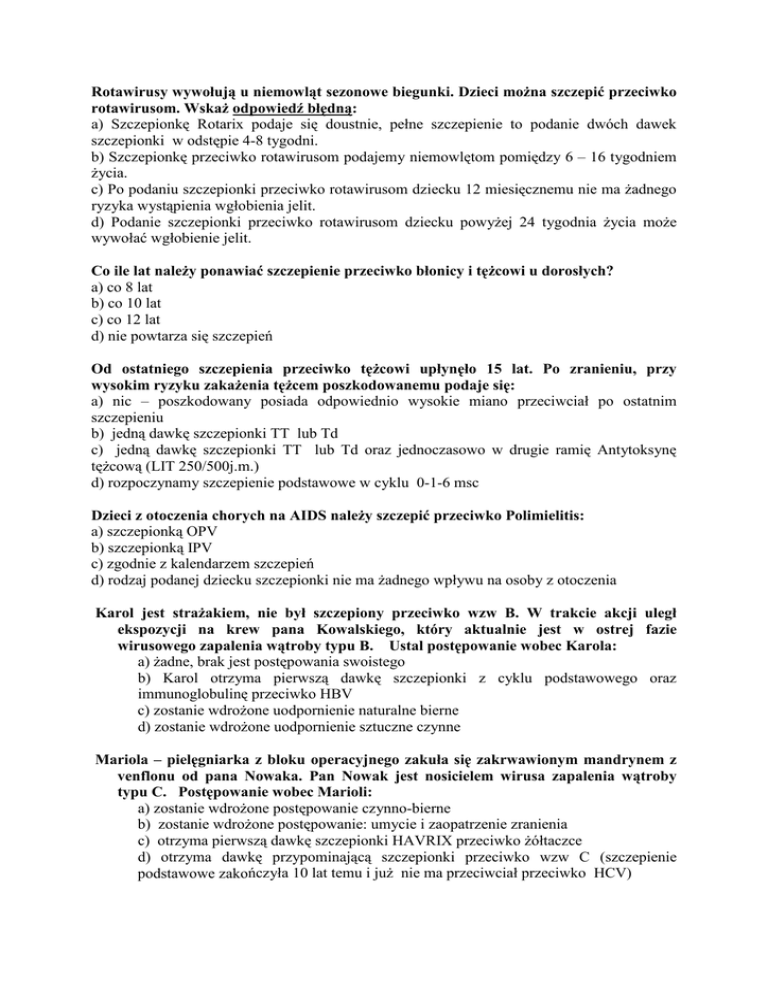 Rotawirusy wywołują u niemowląt sezonowe biegunki. Dzieci moŜna szczepić przeciwko rotawirusom. WskaŜ odpowiedź błędną: a) Szczepionkę Rotarix podaje się doustnie, pełne szczepienie to podanie dwóch dawek szczepionki w odstępie 4-8 tygodni. b) Szczepionkę przeciwko rotawirusom podajemy niemowlętom pomiędzy 6 – 16 tygodniem Ŝycia. c) Po podaniu szczepionki przeciwko rotawirusom dziecku 12 miesięcznemu nie ma Ŝadnego ryzyka wystąpienia wgłobienia jelit. d) Podanie szczepionki przeciwko rotawirusom dziecku powyŜej 24 tygodnia Ŝycia moŜe wywołać wgłobienie jelit. Co ile lat naleŜy ponawiać szczepienie przeciwko błonicy i tęŜcowi u dorosłych? a) co 8 lat b) co 10 lat c) co 12 lat d) nie powtarza się szczepień Od ostatniego szczepienia przeciwko tęŜcowi upłynęło 15 lat. Po zranieniu, przy wysokim ryzyku zakaŜenia tęŜcem poszkodowanemu podaje się: a) nic – poszkodowany posiada odpowiednio wysokie miano przeciwciał po ostatnim szczepieniu b) jedną dawkę szczepionki TT lub Td c) jedną dawkę szczepionki TT lub Td oraz jednoczasowo w drugie ramię Antytoksynę tęŜcową (LIT 250/500j.m.) d) rozpoczynamy szczepienie podstawowe w cyklu 0-1-6 msc Dzieci z otoczenia chorych na AIDS naleŜy szczepić przeciwko Polimielitis: a) szczepionką OPV b) szczepionką IPV c) zgodnie z kalendarzem szczepień d) rodzaj podanej dziecku szczepionki nie ma Ŝadnego wpływu na osoby z otoczenia Karol jest straŜakiem, nie był szczepiony przeciwko wzw B. W trakcie akcji uległ ekspozycji na krew pana Kowalskiego, który aktualnie jest w ostrej fazie wirusowego zapalenia wątroby typu B. Ustal postępowanie wobec Karola: a) Ŝadne, brak jest postępowania swoistego b) Karol otrzyma pierwszą dawkę szczepionki z cyklu podstawowego oraz immunoglobulinę przeciwko HBV c) zostanie wdroŜone uodpornienie naturalne bierne d) zostanie wdroŜone uodpornienie sztuczne czynne Mariola – pielęgniarka z bloku operacyjnego zakuła się zakrwawionym mandrynem z venflonu od pana Nowaka. Pan Nowak jest nosicielem wirusa zapalenia wątroby typu C. Postępowanie wobec Marioli: a) zostanie wdroŜone postępowanie czynno-bierne b) zostanie wdroŜone postępowanie: umycie i zaopatrzenie zranienia c) otrzyma pierwszą dawkę szczepionki HAVRIX przeciwko Ŝółtaczce d) otrzyma dawkę przypominającą szczepionki przeciwko wzw C (szczepienie podstawowe zakończyła 10 lat temu i juŜ nie ma przeciwciał przeciwko HCV) Rejestracja NOP (wskaŜ odpowiedź błędną): a) między innymi ma na celu ochronić inne dzieci przed powikłaniami poszczepiennymi b) lekarz z punktu szczepień, ma obowiązek zgłosić NOP do PPIS jak najszybciej (w czasie nie przekraczającym 24 godziny od chwili rozpoznania NOP) c) brak jest aktów prawnych regulujących zgłaszanie NOP d) bolesność, zaczerwienienie, obrzęk w miejscu szczepienia, przemijające w ciągu kilkunastu godzin nie wymagają zgłoszenia do PPIS Kto moŜe wykonywać szczepienia: a) pracownik medyczny, który posiada prawo wykonywania zawodu b) do końca grudnia 2015 roku lekarz, felczer, higienistka szkolna bez szkolenia specjalistycznego, którzy posiadają 2,5 roku praktyki w przeprowadzaniu szczepień ochronnych c) do końca grudnia 2015 roku kaŜda pielęgniarka d) brak jest wytycznych w tej sprawie Uodpornienie bierno-czynne polega na: a) podaniu immunoglobuliny b) podaniu szczepionki c) przechorowaniu choroby d) jednoczasowym podaniu immunoglobuliny i szczepionki Pan Malinowski ma 60 lat jest rolnikiem. Ostatnio był szczepiony w wojsku, ale nie pamięta przeciwko jakiej chorobie, w dzieciństwie teŜ był szczepiony, jednak nie wie przeciwko czemu i w jaki sposób – a moŜe to nie były szczepienia tylko jakieś inne zastrzyki...?. Brak jest jakiejkolwiek dokumentacji szczepień pana Malinowskiego. W trakcie rozrzucania obornika na polu doszło do wypadku (otwarte złamanie podudzia, z rozległym miaŜdŜonym uszkodzeniem tkanek miękkich i zanieczyszczeniem rany ziemią i obornikiem. Postępowanie wobec rolnika: a) 1 dawka anatoksyny przeciw tęŜcowej b) 1 dawka antytoksyny przeciw tęŜcowej c) pierwsza dawka szczepionki przeciw tęŜcowej z cyklu 0-1-6 oraz jednoczasowo immunoglobulina przeciw tęŜcowa d) staranne opracowanie zranionych tkanek, wdroŜenie antybiotykoterapii ukierunkowanej przeciwko bakteriom beztlenowym (duŜe ryzyko rozwoju zgorzeli gazowej) e) odpowiedzi c i d są prawidłowe WskaŜ prawidłową odpowiedź: a) anatoksyna to szczepionka b) antytoksyna to szczepionka c) anatoksyna to immunoglobulina