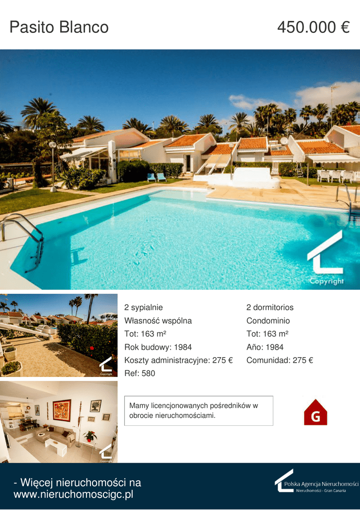Pasito Blanco 450.000 € 2 sypialnie 2 dormitorios Własność wspólna Condominio Tot: 163 m² Tot: 163 m² Rok budowy: 1984 Año: 1984 Koszty administracyjne: 275 € Comunidad: 275 € Ref: 580 Mamy licencjonowanych pośredników w obrocie nieruchomościami. - Więcej nieruchomości na www.nieruchomoscigc.pl