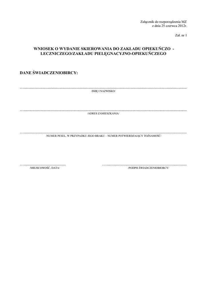 Załącznik do rozporządzenia MZ z dnia 25 czerwca 2012r. Zał. nr 1 WNIOSEK O WYDANIE SKIEROWANIA DO ZAKŁADU OPIEKUŃCZO LECZNICZEGO/ZAKŁADU PIELĘGNACYJNO-OPIEKUŃCZEGO DANE ŚWIADCZENIOBIRCY: …............................................................................................................................................................ /IMIĘ I NAZWISKO/ …............................................................................................................................................................ /ADRES ZAMIESZKANIA/ …............................................................................................................................................................ /NUMER PESEL, W PRZYPADKU JEGO BRAKU – NUMER POTWIERDZAJĄCY TOŻSAMOŚĆ/ …........................................ /MIEJSCOWOŚĆ, DATA/ …............................................................................. /PODPIS ŚWIADCZENIOBIORCY/ zał. 2 WYWIAD PIELĘGNIARSKI I ZAŚWIADCZENIE LEKARSKIE 1. Dane świadczeniobiorcy: …............................................................................................................................................................ /imię i nazwisko/ …............................................................................................................................................................ /adres zamieszkania/ …............................................................................................................................................................ /numer pesel, w przypadku jego braku – numer potwierdzający tożsamość/ Rozpoznanie problemów z zakresu pielęgnacji (zaznaczyć właściwe, ewentualnie opisać): a) odżywianie - samodzielny / przy pomocy / utrudnienia □ karmienie przez gastrostomię lub zgłębnik........................................................................................ □ karmienie pacjenta z zaburzeniami połykania.................................................................................... □ zakładanie zgłębnika........................................................................................................................... □ inne niewymienione…........................................................................................................................ b) higiena ciała - samodzielny / przy pomocy / utrudnienia □ w przypadku pacjenta wentylowanego mechanicznie – toaleta jamy ustnej lub toaleta drzewa oskrzelowego oraz wymiana rurki tracheostomijnej….......................................................................... □ inne niewymienione …....................................................................................................................... c) oddawanie moczu - samodzielny/ przy pomocy / utrudnienia □ cewnik □ inne niewymienione …...................................................................................................................... d) oddawanie stolca - samodzielny / przy pomocy / utrudnienia □ pielęgnacja stomii □ wykonywanie lewatyw i irygacji □ inne niewymienione…........................................................................................................................ e) przemieszczanie pacjenta - samodzielny / przy pomocy / utrudnienia □ z zaawansowaną osteoporozą □ stan zdrowia wymaga szczególnej ostrożności □ inne niewymienione…........................................................................................................................ f) rany przewlekłe TAK / NIE □ odleżyny □ rany cukrzycowe □ inne niewymienione…........................................................................................................................ g) oddychanie wspomagane TAK / NIE h) świadomość pacjenta TAK / NIE / Z PRZERWAMI i) inne …................................................................................................................................................. Liczba punktów uzyskanych w skali Barthel ** / *** ….......................................... …................................................. …...................................................... miejscowość, data podpis oraz pieczęć pielęgniarki ZAŚWIADCZENIE LEKARSKIE Stwierdzam, że …....................................................................................................................... imię i nazwisko / adres zamieszkania / PESEL …............................................................................................................................................................ wymaga / nie wymaga * skierowania do zakładu opiekuńczo – leczniczego / zakładu pielęgnacyjno – opiekuńczego *. …....................................................... miejscowość, data …............................................................ podpis oraz pieczęć lekarza * niepotrzebne skreślić ** W przypadkach określonych w art. 25 ustawy z dnia 19 sierpnia 2011r. o weteranach działań poza granicami państwa (Dz. U. Nr 201, poz.1203) opinia konsultanta ochrony zdrowia, o którym mowa w atr. 5 ustawy z dnia 6 listopada 2008r. o konsultantach w ochronie zdrowia (Dz. U. Z dnia 2009r. Nr 52, poz. 419, z późn. zm.) zastępuje ocenę skalą Barthel. *** W przypadku dzieci do ukończenia 3 roku życia wpisać: nie ma zastosowania”. KARTA OCENY ŚWIADCZENIOBIORCY KIEROWANEGO DO ZAKŁADU OPIEKUŃCZEGO/PRZEBYWAJĄCEGO W ZAKŁADZIE OPIEKUŃCZYM1) …............................................................................................................................................ Imię i nazwisko świadczeniobiorcy …............................................................................................................................................ Adres zamieszkania ….............................................................................................................
