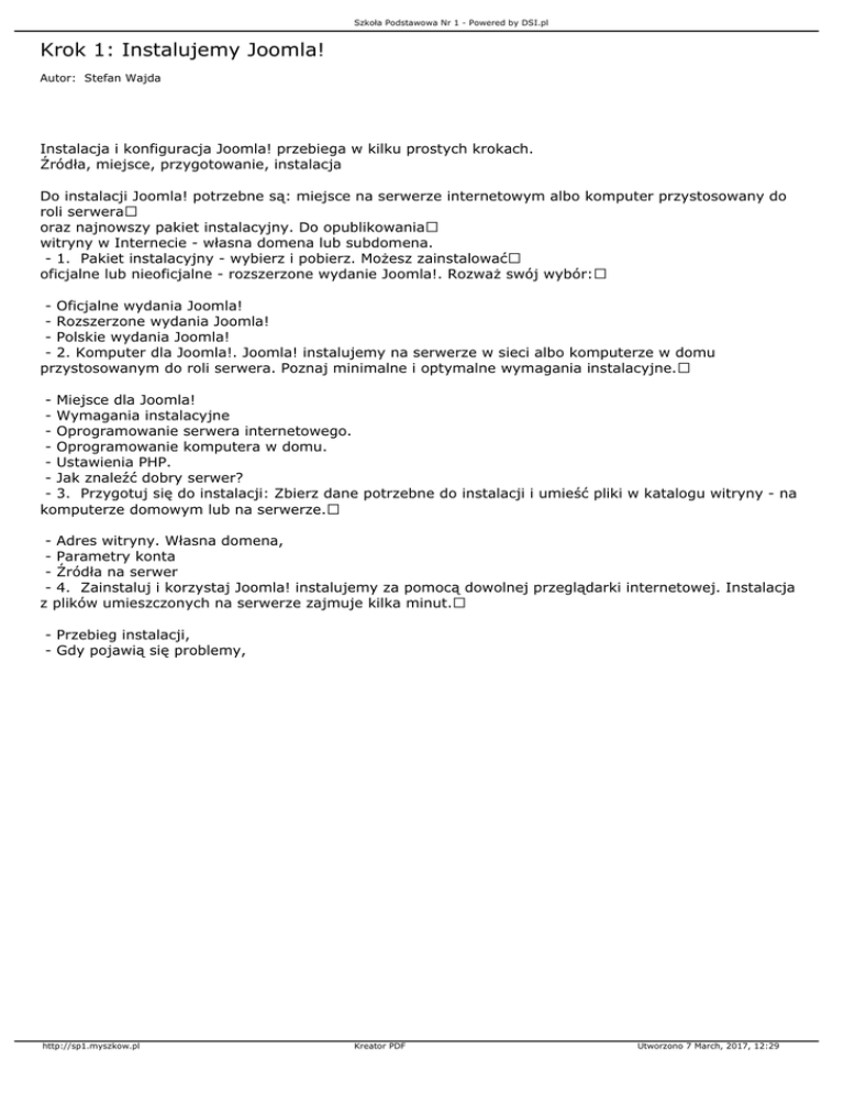 Szkoła Podstawowa Nr 1 - Powered by DSI.pl Krok 1: Instalujemy Joomla! Autor: Stefan Wajda Instalacja i konfiguracja Joomla! przebiega w kilku prostych krokach. Źródła, miejsce, przygotowanie, instalacja Do instalacji Joomla! potrzebne są: miejsce na serwerze internetowym albo komputer przystosowany do roli serwera oraz najnowszy pakiet instalacyjny. Do opublikowania witryny w Internecie - własna domena lub subdomena. - 1. Pakiet instalacyjny - wybierz i pobierz. Możesz zainstalować oficjalne lub nieoficjalne - rozszerzone wydanie Joomla!. Rozważ swój wybór: - Oficjalne wydania Joomla! - Rozszerzone wydania Joomla! - Polskie wydania Joomla! - 2. Komputer dla Joomla!. Joomla! instalujemy na serwerze w sieci albo komputerze w domu przystosowanym do roli serwera. Poznaj minimalne i optymalne wymagania instalacyjne. - Miejsce dla Joomla! - Wymagania instalacyjne - Oprogramowanie serwera internetowego. - Oprogramowanie komputera w domu. - Ustawienia PHP. - Jak znaleźć dobry serwer? - 3. Przygotuj się do instalacji: Zbierz dane potrzebne do instalacji i umieść pliki w katalogu witryny - na komputerze domowym lub na serwerze. - Adres witryny. Własna domena, - Parametry konta - Źródła na serwer - 4. Zainstaluj i korzystaj Joomla! instalujemy za pomocą dowolnej przeglądarki internetowej. Instalacja z plików umieszczonych na serwerze zajmuje kilka minut. - Przebieg instalacji, - Gdy pojawią się problemy, http://sp1.myszkow.pl Kreator PDF Utworzono 7 March, 2017, 12:29
