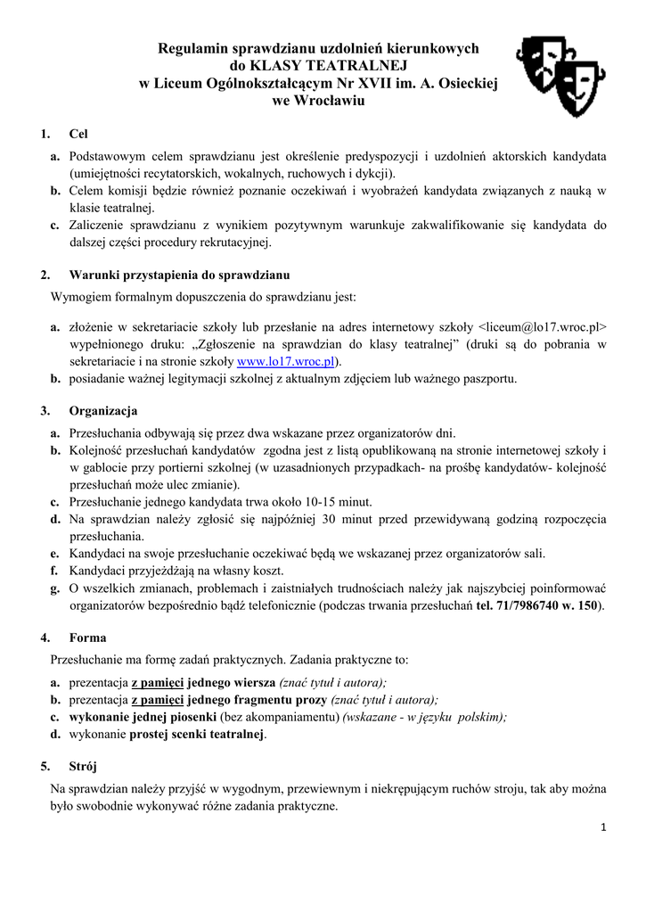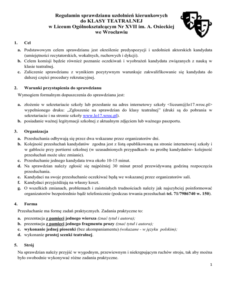 Regulamin sprawdzianu uzdolnień kierunkowych do KLASY TEATRALNEJ w Liceum Ogólnokształcącym Nr XVII im. A. Osieckiej we Wrocławiu 1. Cel a. Podstawowym celem sprawdzianu jest określenie predyspozycji i uzdolnień aktorskich kandydata (umiejętności recytatorskich, wokalnych, ruchowych i dykcji). b. Celem komisji będzie również poznanie oczekiwań i wyobrażeń kandydata związanych z nauką w klasie teatralnej. c. Zaliczenie sprawdzianu z wynikiem pozytywnym warunkuje zakwalifikowanie się kandydata do dalszej części procedury rekrutacyjnej. 2. Warunki przystapienia do sprawdzianu Wymogiem formalnym dopuszczenia do sprawdzianu jest: a. złożenie w sekretariacie szkoły lub przesłanie na adres internetowy szkoły <[email protected]> wypełnionego druku: „Zgłoszenie na sprawdzian do klasy teatralnej” (druki są do pobrania w sekretariacie i na stronie szkoły www.lo17.wroc.pl). b. posiadanie ważnej legitymacji szkolnej z aktualnym zdjęciem lub ważnego paszportu. 3. Organizacja a. Przesłuchania odbywają się przez dwa wskazane przez organizatorów dni. b. Kolejność przesłuchań kandydatów zgodna jest z listą opublikowaną na stronie internetowej szkoły i w gablocie przy portierni szkolnej (w uzasadnionych przypadkach- na prośbę kandydatów- kolejność przesłuchań może ulec zmianie). c. Przesłuchanie jednego kandydata trwa około 10-15 minut. d. Na sprawdzian należy zgłosić się najpóźniej 30 minut przed przewidywaną godziną rozpoczęcia przesłuchania. e. Kandydaci na swoje przesłuchanie oczekiwać będą we wskazanej przez organizatorów sali. f. Kandydaci przyjeżdżają na własny koszt. g. O wszelkich zmianach, problemach i zaistniałych trudnościach należy jak najszybciej poinformować organizatorów bezpośrednio bądź telefonicznie (podczas trwania przesłuchań tel. 71/7986740 w. 150). 4. Forma Przesłuchanie ma formę zadań praktycznych. Zadania praktyczne to: a. b. c. d. prezentacja z pamięci jednego wiersza (znać tytuł i autora); prezentacja z pamięci jednego fragmentu prozy (znać tytuł i autora); wykonanie jednej piosenki (bez akompaniamentu) (wskazane - w języku polskim); wykonanie prostej scenki teatralnej. Strój 5. Na sprawdzian należy przyjść w wygodnym, przewiewnym i niekrępującym ruchów stroju, tak aby można było swobodnie wykonywać różne zadania praktyczne. 1 6. Ramy czasowe Na wykonanie zadań praktycznych przewidziano łącznie około 10 minut. Treść kolejnego zadania podawana jest po zakończeniu zadania poprzedniego. 7. Komisja rekrutacyjna Komisję powołuje dyrektor szkoły. 8. Wyniki sprawdzianu. Punkty uzyskane przez kandydata w wyniku przeprowadzonego sprawdzianu uzdolnień kierunkowych nie wchodzą w skład punktów rekrutacyjnych, określają jedynie, w jakim stopniu kandydat spełnia wymagania stawiane przez Komisję Rekrutacyjną i wykazuje szczególne predyspozycje do kształcenia w klasie teatralnej. Rekrutacja kandydatów do klasy teatralnej dokonana zostanie spośród tych absolwentów gimnazjów, którzy pozytywnie zaliczą sprawdzian uzdolnień kierunkowych. Lista kandydatów zakwalifikowanych do rekrutacji do klasy teatralnej w LO Nr XVII im. A. Osieckiej dostępna będzie na stronie internetowej szkoły i w sekretariacie uczniowskim do trzech dni po zakończeniu drugiego dnia przesłuchań. 2