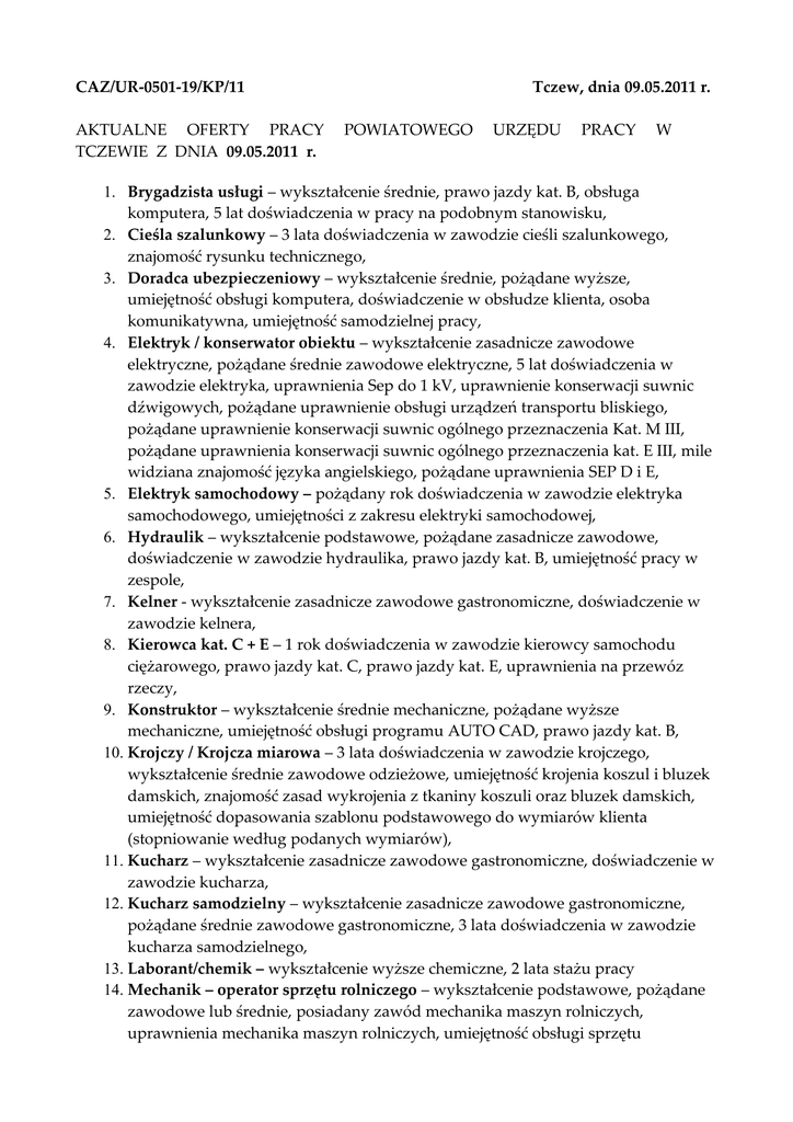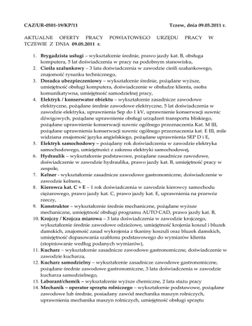 CAZ/UR-0501-19/KP/11 AKTUALNE OFERTY PRACY TCZEWIE Z DNIA 09.05.2011 r. Tczew, dnia 09.05.2011 r. POWIATOWEGO URZĘDU PRACY W 1. Brygadzista usługi – wykształcenie średnie, prawo jazdy kat. B, obsługa komputera, 5 lat doświadczenia w pracy na podobnym stanowisku, 2. Cieśla szalunkowy – 3 lata doświadczenia w zawodzie cieśli szalunkowego, znajomość rysunku technicznego, 3. Doradca ubezpieczeniowy – wykształcenie średnie, pożądane wyższe, umiejętność obsługi komputera, doświadczenie w obsłudze klienta, osoba komunikatywna, umiejętność samodzielnej pracy, 4. Elektryk / konserwator obiektu – wykształcenie zasadnicze zawodowe elektryczne, pożądane średnie zawodowe elektryczne, 5 lat doświadczenia w zawodzie elektryka, uprawnienia Sep do 1 kV, uprawnienie konserwacji suwnic dźwigowych, pożądane uprawnienie obsługi urządzeń transportu bliskiego, pożądane uprawnienie konserwacji suwnic ogólnego przeznaczenia Kat. M III, pożądane uprawnienia konserwacji suwnic ogólnego przeznaczenia kat. E III, mile widziana znajomość języka angielskiego, pożądane uprawnienia SEP D i E, 5. Elektryk samochodowy – pożądany rok doświadczenia w zawodzie elektryka samochodowego, umiejętności z zakresu elektryki samochodowej, 6. Hydraulik – wykształcenie podstawowe, pożądane zasadnicze zawodowe, doświadczenie w zawodzie hydraulika, prawo jazdy kat. B, umiejętność pracy w zespole, 7. Kelner - wykształcenie zasadnicze zawodowe gastronomiczne, doświadczenie w zawodzie kelnera, 8. Kierowca kat. C + E – 1 rok doświadczenia w zawodzie kierowcy samochodu ciężarowego, prawo jazdy kat. C, prawo jazdy kat. E, uprawnienia na przewóz rzeczy, 9. Konstruktor – wykształcenie średnie mechaniczne, pożądane wyższe mechaniczne, umiejętność obsługi programu AUTO CAD, prawo jazdy kat. B, 10. Krojczy / Krojcza miarowa – 3 lata doświadczenia w zawodzie krojczego, wykształcenie średnie zawodowe odzieżowe, umiejętność krojenia koszul i bluzek damskich, znajomość zasad wykrojenia z tkaniny koszuli oraz bluzek damskich, umiejętność dopasowania szablonu podstawowego do wymiarów klienta (stopniowanie według podanych wymiarów), 11. Kucharz – wykształcenie zasadnicze zawodowe gastronomiczne, doświadczenie w zawodzie kucharza, 12. Kucharz samodzielny – wykształcenie zasadnicze zawodowe gastronomiczne, pożądane średnie zawodowe gastronomiczne, 3 lata doświadczenia w zawodzie kucharza samodzielnego, 13. Laborant/chemik – wykształcenie wyższe chemiczne, 2 lata stażu pracy 14. Mechanik – operator sprzętu rolniczego – wykształcenie podstawowe, pożądane zawodowe lub średnie, posiadany zawód mechanika maszyn rolniczych, uprawnienia mechanika maszyn rolniczych, umiejętność obsługi sprzętu rolniczego, prawo jazdy kat. T, uprawnienia operatora maszyn rolniczych, 15. Mechanik samochodów osobowych – wykształcenie zasadnicze zawodowe mechaniczne, pożądane średnie mechaniczne, 3 lata doświadczenia w zawodzie mechanika samochodów osobowych, umiejętność spawania migomatem będzie dodatkowym atutem, 16. Mechanik wózków widłowych – wykształcenie zasadnicze zawodowe techniczne, pożądane średnie techniczne, pożądane doświadczenie 5 lat w zawodzie mechanika wózków widłowych, pożądane prawo jazdy kat. B, wiedza i praktyka z zakresu mechaniki, hydrauliki i elektrotechniki, zdolności organizacyjne, komunikatywność, dyspozycyjność, samodzielność, odpowiedzialność, 17. Monter instalacji sanitarnych – wykształcenie podstawowe, pożądane zasadnicze zawodowe, doświadczenie w zawodzie montera instalacji i urządzeń sanitarnych, prawo jazdy kat. B, umiejętność pracy w zespole, 18. Murarz – wykształcenie zasadnicze zawodowe, 3 lata doświadczenia w zawodzie murarza, umiejętność stawiania konstrukcji żelbetowych, znajomość rysunku technicznego, 19. Murarz – wykształcenie zasadnicze zawodowe budowlane, doświadczenie w zawodzie murarza, 20. Murarz – 3 lata w zawodzie murarza, wykształcenie zasadnicze zawodowe budowlane, 21. Obróbka ręczna i maszynowa przy kamieniu – wykształcenie zasadnicze zawodowe, podstawowa znajomość matematyki, 22. Operator maszyny – wykształcenie zasadnicze zawodowe, pożądane średnie, 23. Operator obrabiarek CNC – wykształcenie zasadnicze zawodowe, pożądane średnie, pożądana znajomość obsługi programów graficznych, 24. Operator produkcji – pożądana umiejętność lutowania, pożądana znajomość rysunku technicznego, mile widziane doświadczenie w pracy na produkcji, 25. Palacz – obsługa spalarni odpadów medycznych i weterynaryjnych – wykształcenie zasadnicze zawodowe, pożądane średnie, pożądane doświadczenie w zawodzie hydraulika lub elektryka, świadectwo kwalifikacyjne E, obsługa sprężarki, uprawnienie eksploatacji dla sieci gazu ziemnego do 0,5 Mpa, uprawnienie eksploatacji przemysłowych odbiorników gazu do 1500 kw, uprawnienie eksploatacji urządzeń wytwarzających ciepło do 1000 kw, uprawnienie eksploatacji urządzeń wentylacji i klimatyzacji o mocy do 50kw, uprawnienie eksploatacji instalacji wraz z aparaturą kontrolno – pomiarową, 26. Piekarz ciastowy, piecowy lub stołowy – wykształcenie zasadnicze zawodowe, zawód piekarz, 27. Pomocnik budowlany – chęci do pracy, osoba bez nałogów, 28. Pomocnik cieśli – chęci do pracy, 29. Pomocnik hydraulika – wykształcenie podstawowe, pożądane zasadnicze zawodowe, chęci do pracy, zawód hydraulika, 30. Pracownik administracji do obsługi biura budowy – wykształcenie średnie, obsługa pakietu MS OFFICE, mile doświadczenie w branży budowlanej, umiejętność pracy w zespole 31. Pracownik biura podróży – wykształcenie średnie, pożądane wyższe, znajomość obsługi komputera, doświadczenie w pracy biurowej, komunikatywna znajomość języka angielskiego lub niemieckiego, 32. Przedstawiciel strukturalny – Reprezentant – wysoka kultura