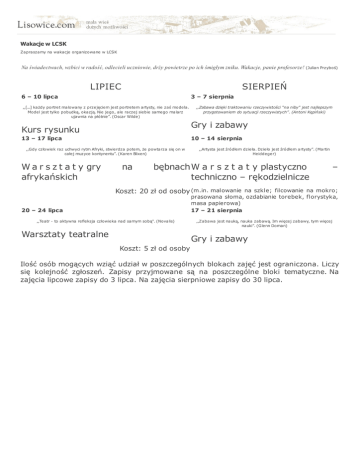 Wakacje w LCSK Zapraszamy na wakacje organizowane w LCSK Na świadectwach, wzbici w radość, odlecieli uczniowie, drży powietrze po ich śmigłym zniku. Wakacje, panie profesorze! (Julian Przyboś) LIPIEC SIERPIEŃ 6 – 10 lipca 3 – 7 sierpnia ,,[...] każdy portret malowany z przejęciem jest portretem artysty, nie zaś modela. Model jest tylko pobudką, okazją. Nie jego, ale raczej siebie samego malarz ujawnia na płótnie”. (Oscar Wilde) Gry i zabawy Kurs rysunku 13 – 17 lipca 10 – 14 sierpnia ,,Gdy człowiek raz uchwyci rytm Afryki, stwierdza potem, że powtarza się on w całej muzyce kontynentu”. (Karen Blixen) W a r s z t a t y gry afrykańskich ,,Zabawa dzięki traktowaniu rzeczywistości "na niby" jest najlepszym przygotowaniem do sytuacji rzeczywistych”. (Antoni Kępiński) na ,,Artysta jest źródłem dzieła. Dzieło jest źródłem artysty”. (Martin Heiddeger) bębnach W a r s z t a t y plastyczno techniczno – rękodzielnicze – Koszt: 20 zł od osoby (m.in. malowanie na szkle; filcowanie na mokro; prasowana słoma, ozdabianie torebek, florystyka, masa papierowa) 17 – 21 sierpnia 20 – 24 lipca ,,Teatr - to aktywna refleksja człowieka nad samym sobą". (Novalis) Warsztaty teatralne ,,Zabawa jest nauką, nauka zabawą. Im więcej zabawy, tym więcej nauki”. (Glenn Doman) Gry i zabawy Koszt: 5 zł od osoby Ilość osób mogących wziąć udział w poszczególnych blokach zajęć jest ograniczona. Liczy się kolejność zgłoszeń. Zapisy przyjmowane są na poszczególne bloki tematyczne. Na zajęcia lipcowe zapisy do 3 lipca. Na zajęcia sierpniowe zapisy do 30 lipca.
