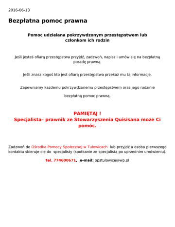2016-06-13 Bezpłatna pomoc prawna Pomoc udzielana pokrzywdzonym przestępstwem lub członkom ich rodzin Jeśli jesteś ofiarą przestępstwa przyjdź, zadzwoń, napisz i umów się na bezpłatną poradę prawną. Jeśli znasz kogoś kto jest ofiarą przestępstwa przekaż mu tą informację. Zapewniamy każdemu pokrzywdzonemu przestępstwem oraz jego rodzinie bezpłatną pomoc prawną. PAMIĘTAJ ! Specjalista– prawnik ze Stowarzyszenia Quisisana może Ci pomóc. Zadzwoń do Ośrodka Pomocy Społecznej w Tułowicach lub przyjdź a osoba pierwszego kontaktu skieruje cię do specjalisty (spotkanie ze specjalistą po uprzednim umówieniu). tel. 774600671, e-mail: [email protected]