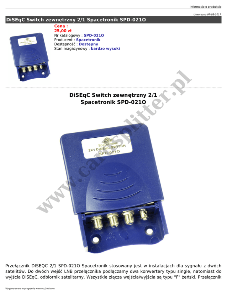 Informacje o produkcie Utworzono 07-03-2017 DiSEqC Switch zewnętrzny 2/1 Spacetronik SPD-021O Cena : 25,00 zł .p l Nr katalogowy : SPD-021O Producent : Spacetronik Dostępność : Dostępny Stan magazynowy : bardzo wysoki w w w .c ar d sp lit te r DiSEqC Switch zewnętrzny 2/1 Spacetronik SPD-021O Przełącznik DISEQC 2/1 SPD-021O Spacetronik stosowany jest w instalacjach dla sygnału z dwóch satelitów. Do dwóch wejść LNB przełącznika podłączamy dwa konwertery typu single, natomiast do wyjścia DiSEqC, odbiornik satelitarny. Wszystkie złącza wejścia/wyjścia są typu "F" żeński. Przełącznik Wygenerowano w programie www.oscGold.com Cechy wyróżniające: ● ● ● ● tłumienie odbić wejścia/wyjścia, dodatkowe złącze uziemiające, odporna obudowa wykonana z ABS-u, szybki i łatwy montaż, w zestawie opaski zapewniające właściwe zamocowanie; w w w .c ar d ● sp lit te r .p l posiada dodatkowe złącze uziemiające. Ma bardzo dobrej jakości obudowę ABS, przystosowaną do montażu na maszcie (w zestawie dodatkowe opaski zaciskające). Specyfikacja: ● ● ● ● ● ● ● ● Model: SPD-021O Zakres częstotliwości: 950-2400MHz Ilość wejść: 2 Ilość wyjść: 1 Tłumienie: 3 dB Tłumienie odbić (wejście i wyjście): 7,5 dB Złącze wejścia/wyjścia: Typ "F" żeński Temperatura pracy: -50C - +60C