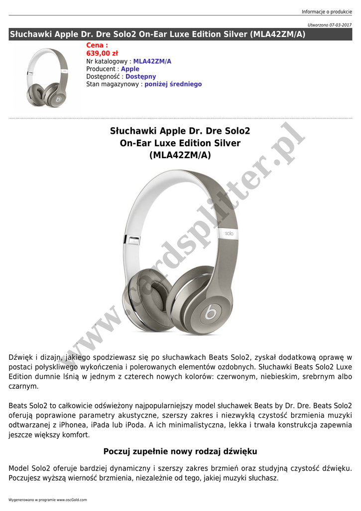 Informacje o produkcie Utworzono 07-03-2017 Słuchawki Apple Dr. Dre Solo2 On-Ear Luxe Edition Silver (MLA42ZM/A) Cena : 639,00 zł Nr katalogowy : MLA42ZM/A Producent : Apple Dostępność : Dostępny Stan magazynowy : poniżej średniego w w w .c ar d sp lit te r .p l Słuchawki Apple Dr. Dre Solo2 On-Ear Luxe Edition Silver (MLA42ZM/A) Dźwięk i dizajn, jakiego spodziewasz się po słuchawkach Beats Solo2, zyskał dodatkową oprawę w postaci połyskliwego wykończenia i polerowanych elementów ozdobnych. Słuchawki Beats Solo2 Luxe Edition dumnie lśnią w jednym z czterech nowych kolorów: czerwonym, niebieskim, srebrnym albo czarnym. Beats Solo2 to całkowicie odświeżony najpopularniejszy model słuchawek Beats by Dr. Dre. Beats Solo2 oferują poprawione parametry akustyczne, szerszy zakres i niezwykłą czystość brzmienia muzyki odtwarzanej z iPhonea, iPada lub iPoda. A ich minimalistyczna, lekka i trwała konstrukcja zapewnia jeszcze większy komfort. Poczuj zupełnie nowy rodzaj dźwięku Model Solo2 oferuje bardziej dynamiczny i szerszy zakres brzmień oraz studyjną czystość dźwięku. Poczujesz wyższą wierność brzmienia, niezależnie od tego, jakiej muzyki słuchasz. Wygenerowano w programie www.oscGold.com Wyjątkowy komfort Elastyczny pałąk został bardziej zakrzywiony, aby ułatwić Ci komfortowe dopasowanie słuchawek do indywidualnych potrzeb. Ergonomiczne nachylenie nauszników zapewnia naturalne dopasowanie, a opcja obracania gwarantuje maksimum komfortu i optymalną jakość dźwięku. Nauszniki wykonane z najwyższej klasy materiałów rozpraszają ciepło i minimalizują wydostawanie się dźwięku poza słuchawki. Minimalistyczny dizajn Łagodne zakrzywienia, brak widocznych elementów montażowych i łatwe składanie podkreślają wyjątkowy, smukły design słuchawek Beats Solo2. Za sprawą przemyślanego projektu i materiałów najwyższej klasy słuchawki są trwałe i gotowe na wieloletnie użytkowanie. .p l Nie musisz sięgać do urządzenia iOS w w w .c ar d sp lit te r Dopasowany kolorystycznie przewód RemoteTalk umożliwia przełączanie utworów, regulację głośności i odbieranie połączeń bez dotykania iPhonea, iPada lub iPoda (dostępność funkcji może się różnić w zależności od urządzenia). Najważniejsze cechy: ● ● ● ● ● ● ● Poprawione parametry akustyczne zapewniają większą czystość dźwięku Minimalistyczna, lekka konstrukcja zapewnia jeszcze większy komfort użytkowania Wytrzymała, kompaktowa, składana konstrukcja ułatwia przenoszenie Przewód RemoteTalk umożliwia odbieranie połączeń i sterowanie muzyką na urządzeniach z systemem iOS Możliwość słuchania muzyki z iPhonea, iPada i iPoda tak, jak nagrali ją artyści. Wejście liniowe mikrofonu z funkcją kontroli ścieżek Możliwość pracy bez baterii Zawartość opakowania: Informacje o produkcie ● ● ● Słuchawki nauszne Beats by Dr. Dre Solo2 Przewód RemoteTalk Etui do przenoszenia i podróży Specyfikacja: ● ● ● ● ● w w w .c ar d sp lit te r ● Producent: Apple Kod producenta: MLA42ZM/A Kolor: Srebrny Linia: by Dr. Dre Mikrofon na przewodzie: Tak Waga [g]: 0.829 Format: Nauszne .p l ● Wygenerowano w programie www.oscGold.com