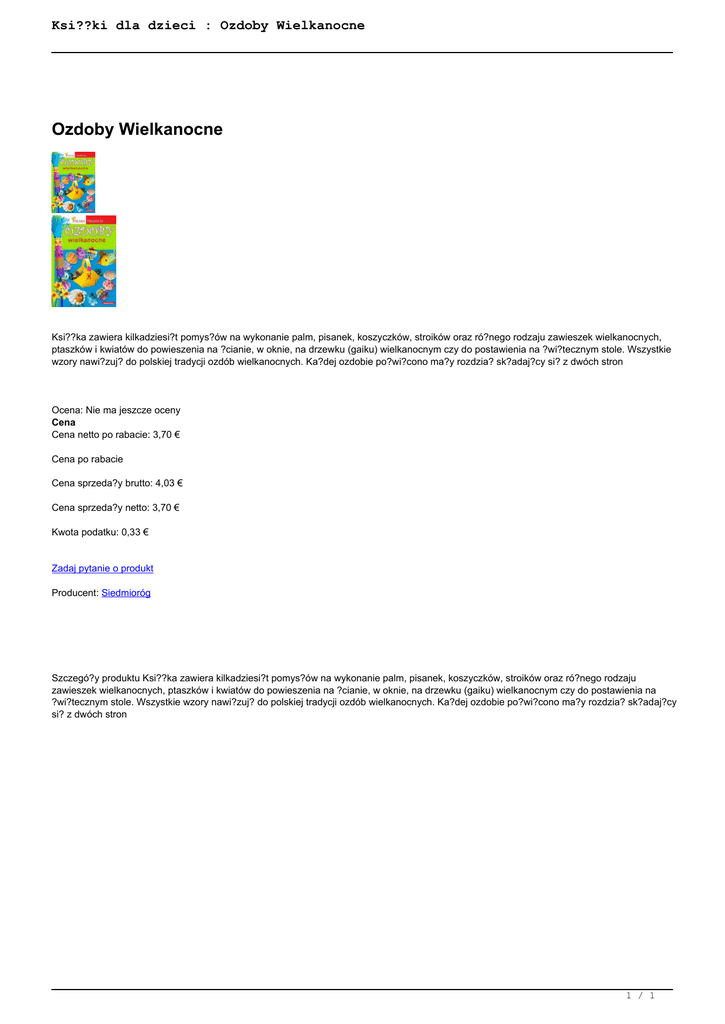 Ksi??ki dla dzieci : Ozdoby Wielkanocne Ozdoby Wielkanocne Ksi??ka zawiera kilkadziesi?t pomys?ów na wykonanie palm, pisanek, koszyczków, stroików oraz ró?nego rodzaju zawieszek wielkanocnych, ptaszków i kwiatów do powieszenia na ?cianie, w oknie, na drzewku (gaiku) wielkanocnym czy do postawienia na ?wi?tecznym stole. Wszystkie wzory nawi?zuj? do polskiej tradycji ozdób wielkanocnych. Ka?dej ozdobie po?wi?cono ma?y rozdzia? sk?adaj?cy si? z dwóch stron Ocena: Nie ma jeszcze oceny Cena Cena netto po rabacie: 3,70 € Cena po rabacie Cena sprzeda?y brutto: 4,03 € Cena sprzeda?y netto: 3,70 € Kwota podatku: 0,33 € Zadaj pytanie o produkt Producent: Siedmioróg Szczegó?y produktu Ksi??ka zawiera kilkadziesi?t pomys?ów na wykonanie palm, pisanek, koszyczków, stroików oraz ró?nego rodzaju zawieszek wielkanocnych, ptaszków i kwiatów do powieszenia na ?cianie, w oknie, na drzewku (gaiku) wielkanocnym czy do postawienia na ?wi?tecznym stole. Wszystkie wzory nawi?zuj? do polskiej tradycji ozdób wielkanocnych. Ka?dej ozdobie po?wi?cono ma?y rozdzia? sk?adaj?cy si? z dwóch stron 1 / 1 Powered by TCPDF (www.tcpdf.org)