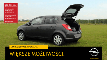 CORSA KONWERTOWANA WIĘKSZE MOŻLIWOŚCI. Konwersja standardowej Corsy 5-drzwiowej na wersję ciężarową. • Konwersja wykonywana przez wyspecjalizowany zakład Cena konwersji: 2 276 zł netto • Konwersja obejmuje m. in. demontaż tylnej kanapy i montaż kraty bagażowej • Elementy zdemontowane mogą być użyte do ponownej konwersji samochodu 5-drzwiowe nadwozie. CORSA KONWERTOWANA ALTERNATYWA CORSY VAN. Możliwość ponownej konwersji na wersję osobową. • Demontaż podłogi i kraty bagażowej • Montaż tylnej kanapy i elementów wyposażenia bagażnika • Oświadczenie producenta o wykonanej konwersji • Przegląd w stacji kontroli pojazdów Łatwiejsza odsprzedaż Tylna kanapa i elementy bagażnika zwracane właścicielowi. CORSA KONWERTOWANA DODATKOWE KORZYŚCI. Homologacja ciężarowa, kategoria N1. Pełne odliczenie VAT od ceny zakupu samochodu • Brak konieczności prowadzenia ewidencji przebiegu • Odliczenie VAT od kosztów obsługi pojazdu (przeglądy, naprawy, etc.) • Odliczenie VAT od kosztów paliwa (do 2015 roku) Płaska podłoga bagażnika. CORSA KONWERTOWANA EKSPLOATACJA. CORSA CORSA KONWERTOWANA VAN Liczba drzwi 5 3 Liczba miejsc 2 2 Długość przestrzeni ładunkowej, środek (mm) 1 340 1 257 Szerokość przestrzeni ładunkowej, najszersze miejsce (mm) 1 240 1 264 Odległość między nadkolami (mm) 890 944 Wysokość przestrzeni ładunkowej, najwyższe miejsce 924 924 367 – 552 345 – 475 1,0* 0,9 lokalnie fabryka tak tak Ładowność (kg) Pojemność ładunkowa (m3) Miejsce wykonania konwersji Pełne odliczenie VAT, bez ewidencji przebiegu *wielkość szacowana Kluczowe atuty. + 5-drzwiowe nadwozie ułatwia załadunek i wyładunek + dłuższa przestrzeń ładunkowa + większa ładowność i pojemność CORSA KONWERTOWANA PRZESTRZEŃ ŁADUNKOWA. 3 LATA i 150 000 KM 4 LATA i 200 000 KM RV UTRATA WARTOŚCI RV UTRATA WARTOŚCI Corsa Konwertowana 1.3 CDTI (75 KM) Active 37,4 % 35283 zł 30,0 % 39435 zł Corsa Van 1.3 CDTI (75 KM) 35,6 % 37620 zł 28,4 % 41740 zł Corsa Konwertowana 1.2 LPGTEC (85 KM) Active 37,0 % 33281 zł 28,6 % 37681 zł x x x x Corsa Konwertowana 1.2 (85 KM) Active 41,5 % 27972 zł 32,2 % 32412 zł Kluczowe atuty. Corsa Van 1.2 (85 KM) 37,6 % 31567 zł 30,1 % 35309 zł + wyższa RV + mniejsza utrata wartości + łatwiejsza odsprzedaż po skonwertowaniu auta z powrotem na auto osobowe Corsa Van 1.2 LPGTEC (85 KM) *Wartość rezydualna (RV) przedstawiona jest jako procent ceny cennikowej (ceny znajdującej się na stronie danego importera na dzień 10.09.2014), jaki Klient może otrzymać w oparciu o wycenę, pochodzącą z bazy Eurotax (na dzień 10.09.2014). Utrata wartości stanowi różnicę pomiędzy ceną cennikowej (ceny znajdującej się na stronie danego importera na dzień 10.09.2014), oraz wartością rezydualną (odsprzedaży) pochodzącą z bazy Eurotax (na dzień 10.09.2014). CORSA KONWERTOWANA WARTOŚĆ REZYDUALNA. Dział Sprzedaży Zbiorowej Dixi-Car Raszyn k. W-wy, al. Krakowska 24a Radom, ul. Czarnieckiego 108 Telefony: Raszyn +48 22 716 30 20 Radom +48 48 360 98 26 CORSA KONWERTOWANA DANE KONTAKTOWE. Sprzedajemy w całej Polsce