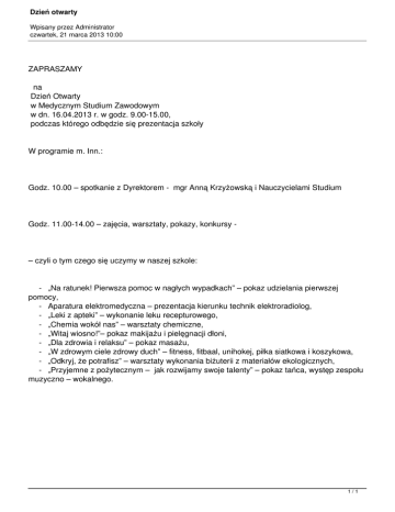 Dzień otwarty Wpisany przez Administrator czwartek, 21 marca 2013 10:00 ZAPRASZAMY na Dzień Otwarty w Medycznym Studium Zawodowym w dn. 16.04.2013 r. w godz. 9.00-15.00, podczas którego odbędzie się prezentacja szkoły W programie m. Inn.: Godz. 10.00 – spotkanie z Dyrektorem - mgr Anną Krzyżowską i Nauczycielami Studium Godz. 11.00-14.00 – zajęcia, warsztaty, pokazy, konkursy - – czyli o tym czego się uczymy w naszej szkole: - „Na ratunek! Pierwsza pomoc w nagłych wypadkach” – pokaz udzielania pierwszej pomocy, - Aparatura elektromedyczna – prezentacja kierunku technik elektroradiolog, - „Leki z apteki” – wykonanie leku recepturowego, - „Chemia wokół nas” – warsztaty chemiczne, - „Witaj wiosno!”– pokaz makijażu i pielęgnacji dłoni, - „Dla zdrowia i relaksu” – pokaz masażu, - „W zdrowym ciele zdrowy duch” – fitness, fitbaal, unihokej, piłka siatkowa i koszykowa, - „Odkryj, że potrafisz” – warsztaty wykonania biżuterii z materiałów ekologicznych, - „Przyjemne z pożytecznym – jak rozwijamy swoje talenty” – pokaz tańca, występ zespołu muzyczno – wokalnego. 1/1