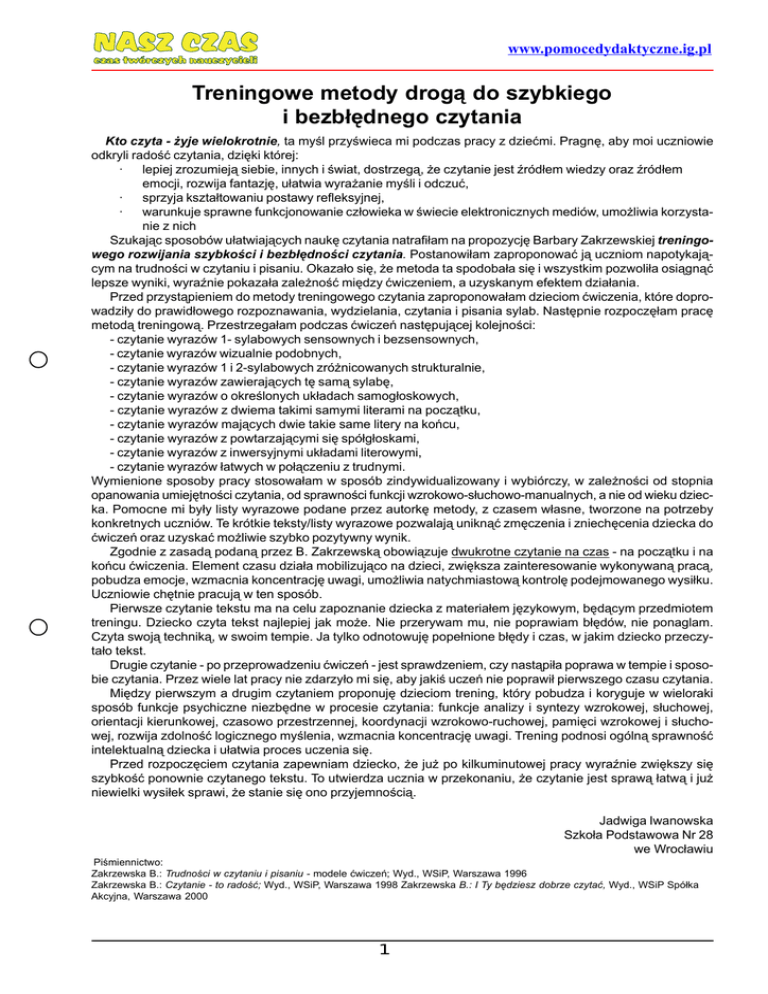 www.pomocedydaktyczne.ig.pl Treningowe metody drogą do szybkiego i bezbłędnego czytania Kto czyta - żyje wielokrotnie, ta myśl przyświeca mi podczas pracy z dziećmi. Pragnę, aby moi uczniowie odkryli radość czytania, dzięki której: · lepiej zrozumieją siebie, innych i świat, dostrzegą, że czytanie jest źródłem wiedzy oraz źródłem emocji, rozwija fantazję, ułatwia wyrażanie myśli i odczuć, · sprzyja kształtowaniu postawy refleksyjnej, · warunkuje sprawne funkcjonowanie człowieka w świecie elektronicznych mediów, umożliwia korzystanie z nich Szukając sposobów ułatwiających naukę czytania natrafiłam na propozycję Barbary Zakrzewskiej treningowego rozwijania szybkości i bezbłędności czytania. Postanowiłam zaproponować ją uczniom napotykającym na trudności w czytaniu i pisaniu. Okazało się, że metoda ta spodobała się i wszystkim pozwoliła osiągnąć lepsze wyniki, wyraźnie pokazała zależność między ćwiczeniem, a uzyskanym efektem działania. Przed przystąpieniem do metody treningowego czytania zaproponowałam dzieciom ćwiczenia, które doprowadziły do prawidłowego rozpoznawania, wydzielania, czytania i pisania sylab. Następnie rozpoczęłam pracę metodą treningową. Przestrzegałam podczas ćwiczeń następującej kolejności: - czytanie wyrazów 1- sylabowych sensownych i bezsensownych, - czytanie wyrazów wizualnie podobnych, - czytanie wyrazów 1 i 2-sylabowych zróżnicowanych strukturalnie, - czytanie wyrazów zawierających tę samą sylabę, - czytanie wyrazów o określonych układach samogłoskowych, - czytanie wyrazów z dwiema takimi samymi literami na początku, - czytanie wyrazów mających dwie takie same litery na końcu, - czytanie wyrazów z powtarzającymi się spółgłoskami, - czytanie wyrazów z inwersyjnymi układami literowymi, - czytanie wyrazów łatwych w połączeniu z trudnymi. Wymienione sposoby pracy stosowałam w sposób zindywidualizowany i wybiórczy, w zależności od stopnia opanowania umiejętności czytania, od sprawności funkcji wzrokowo-słuchowo-manualnych, a nie od wieku dziecka. Pomocne mi były listy wyrazowe podane przez autorkę metody, z czasem własne, tworzone na potrzeby konkretnych uczniów. Te krótkie teksty/listy wyrazowe pozwalają uniknąć zmęczenia i zniechęcenia dziecka do ćwiczeń oraz uzyskać możliwie szybko pozytywny wynik. Zgodnie z zasadą podaną przez B. Zakrzewską obowiązuje dwukrotne czytanie na czas - na początku i na końcu ćwiczenia. Element czasu działa mobilizująco na dzieci, zwiększa zainteresowanie wykonywaną pracą, pobudza emocje, wzmacnia koncentrację uwagi, umożliwia natychmiastową kontrolę podejmowanego wysiłku. Uczniowie chętnie pracują w ten sposób. Pierwsze czytanie tekstu ma na celu zapoznanie dziecka z materiałem językowym, będącym przedmiotem treningu. Dziecko czyta tekst najlepiej jak może. Nie przerywam mu, nie poprawiam błędów, nie ponaglam. Czyta swoją techniką, w swoim tempie. Ja tylko odnotowuję popełnione błędy i czas, w jakim dziecko przeczytało tekst. Drugie czytanie - po przeprowadzeniu ćwiczeń - jest sprawdzeniem, czy nastąpiła poprawa w tempie i sposobie czytania. Przez wiele lat pracy nie zdarzyło mi się, aby jakiś uczeń nie poprawił pierwszego czasu czytania. Między pierwszym a drugim czytaniem proponuję dzieciom trening, który pobudza i koryguje w wieloraki sposób funkcje psychiczne niezbędne w procesie czytania: funkcje analizy i syntezy wzrokowej, słuchowej, orientacji kierunkowej, czasowo przestrzennej, koordynacji wzrokowo-ruchowej, pamięci wzrokowej i słuchowej, rozwija zdolność logicznego myślenia, wzmacnia koncentrację uwagi. Trening podnosi ogólną sprawność intelektualną dziecka i ułatwia proces uczenia się. Przed rozpoczęciem czytania zapewniam dziecko, że już po kilkuminutowej pracy wyraźnie zwiększy się szybkość ponownie czytanego tekstu. To utwierdza ucznia w przekonaniu, że czytanie jest sprawą łatwą i już niewielki wysiłek sprawi, że stanie się ono przyjemnością. Jadwiga Iwanowska Szkoła Podstawowa Nr 28 we Wrocławiu Piśmiennictwo: Zakrzewska B.: Trudności w czytaniu i pisaniu - modele ćwiczeń; Wyd., WSiP, Warszawa 1996 Zakrzewska B.: Czytanie - to radość; Wyd., WSiP, Warszawa 1998 Zakrzewska B.: I Ty będziesz dobrze czytać, Wyd., WSiP Spółka Akcyjna, Warszawa 2000 1 www.pomocedydaktyczne.ig.pl „Pomoce wspierające treningową naukę czytania.” do nabycia w Dolnośląskim Biurze Sprzedaży Nowoczesnych Pomocy Dydaktycznych 2