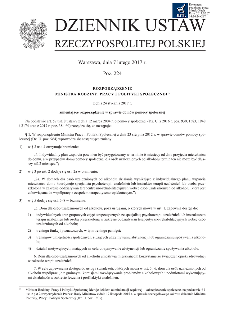 Dokument podpisany przez Marek Głuch Data: 2017.02.07 14:34:24 CET DZIENNIK USTAW RZECZYPOSPOLITEJ POLSKIEJ Warszawa, dnia 7 lutego 2017 r. Poz. 224 ROZPORZĄDZENIE MINISTRA RODZINy, PRACY I POLITYKI SPOŁECZNEJ 1) z dnia 24 stycznia 2017 r. zmieniające rozporządzenie w sprawie domów pomocy społecznej Na podstawie art. 57 ust. 8 ustawy z dnia 12 marca 2004 r. o pomocy społecznej (Dz. U. z 2016 r. poz. 930, 1583, 1948 i 2174 oraz z 2017 r. poz. 38 i 60) zarządza się, co następuje: § 1. W rozporządzeniu Ministra Pracy i Polityki Społecznej z dnia 23 sierpnia 2012 r. w sprawie domów pomocy społecznej (Dz. U. poz. 964) wprowadza się następujące zmiany: 1)w § 2 ust. 4 otrzymuje brzmienie: „4. Indywidualny plan wsparcia powinien być przygotowany w terminie 6 miesięcy od dnia przyjęcia mieszkańca do domu, a w przypadku domu pomocy społecznej dla osób uzależnionych od alkoholu termin ten nie może być dłuższy niż 2 miesiące.”; 2)w § 3 po ust. 2 dodaje się ust. 2a w brzmieniu: „2a. W domach dla osób uzależnionych od alkoholu działania wynikające z indywidualnego planu wsparcia mieszkańca domu koordynuje specjalista psychoterapii uzależnień lub instruktor terapii uzależnień lub osoba przeszkolona w zakresie oddziaływań terapeutyczno-rehabilitacyjnych wobec osób uzależnionych od alkoholu, która jest zobowiązana do współpracy z zespołem terapeutyczno-opiekuńczym.”; 3)w § 5 dodaje się ust. 5–8 w brzmieniu: „5. Dom dla osób uzależnionych od alkoholu, poza usługami, o których mowa w ust. 1, zapewnia dostęp do: 1)indywidualnych oraz grupowych zajęć terapeutycznych ze specjalistą psychoterapii uzależnień lub instruktorem terapii uzależnień lub osobą przeszkoloną w zakresie oddziaływań terapeutyczno-rehabilitacyjnych wobec osób uzależnionych od alkoholu; 2)treningu funkcji poznawczych, w tym treningu pamięci; 3)treningów umiejętności społecznych, służących utrzymywaniu abstynencji lub ograniczaniu spożywania alkoholu; 4)działań motywujących, mających na celu utrzymywanie abstynencji lub ograniczanie spożywania alkoholu. 6. Dom dla osób uzależnionych od alkoholu umożliwia mieszkańcom korzystanie ze świadczeń opieki zdrowotnej w zakresie terapii uzależnień. 7. W celu zapewnienia dostępu do usług i świadczeń, o których mowa w ust. 5 i 6, dom dla osób uzależnionych od alkoholu współpracuje z gminnymi komisjami rozwiązywania problemów alkoholowych i podmiotami wykonującymi działalność w zakresie leczenia i profilaktyki uzależnień. 1) Minister Rodziny, Pracy i Polityki Społecznej kieruje działem administracji rządowej – zabezpieczenie społeczne, na podstawie § 1 ust. 2 pkt 2 rozporządzenia Prezesa Rady Ministrów z dnia 17 listopada 2015 r. w sprawie szczegółowego zakresu działania Ministra Rodziny, Pracy i Polityki Społecznej (Dz. U. poz. 1905). Dziennik Ustaw –2– Poz. 224 8. W celu podnoszenia kwalifikacji i szkolenia personelu dom może współpracować z organizacjami pozarządowymi oraz podmiotami wymienionymi w art. 3 ust. 3 ustawy z dnia 24 kwietnia 2003 r. o działalności pożytku publicznego i o wolontariacie (Dz. U. z 2016 r. poz. 1817 i 1948 oraz z 2017 r. poz. 60), prowadzącymi działalność w zakresie profilaktyki i terapii uzależnień.”; 4)w § 6: a)w ust. 1: – w pkt 6 lit. c otrzymuje brzmienie: „c) dla każdego z posiłków czas wydawania wynosi 2 godziny,”, – w pkt 10 lit. b otrzymuje brzmienie: „b)organizację zajęć terapeutycznych, w tym terapii zajęciowej, w pracowniach terapii, a w przypadku osób przebywających w domach, o których mowa w art. 56 pkt 3 i 4 ustawy, także umożliwienie korzystania z usług w warsztatach terapii zajęciowej,”, b)w ust. 2: – pkt 2 i 3 otrzymują brzmienie: „2) zapewnianie mieszkańcom domu kontaktu z psychologiem, a w przypadku domów, o których mowa: a)w art. 56 pkt 3 i 7 ustawy – również z psychiatrą, b)w art. 56 pkt 7 ustawy – również ze specjalistą psychoterapii uzależnień lub instruktorem terapii uzależnień albo osobą przeszkoloną w zakresie oddziaływań terapeutyczno-rehabilitacyjnych wobec osób uzależnionych od alkoholu; 3)posiadanie wskaźnika zatrudnienia pracowników zespołu terapeutyczno-opiekuńczego w przeliczeniu na pełny wymiar czasu pracy, w odpowiednim typie domu dla: a)osób w podeszłym wieku – nie mniej niż 0,4 na jednego mieszkańca domu, b)osób przewlekle somatycznie chorych – nie mniej niż 0,5 na jednego mieszkańca domu, c)osób przewlekle psychicznie chorych – nie mniej niż 0,5 na jednego mieszkańca domu, d)osób dorosłych niepełnosprawnych intelektualnie – nie mniej niż 0,5 na jednego mieszkańca domu, e)dzieci i młodzieży niepełnosprawnych intelektualnie – nie mniej niż 0,5 na jednego mieszkańca domu, f)osób niepełnosprawnych fizycznie – nie mniej niż 0,5 na jednego mieszkańca domu, g)osób uzależnionych od alkoholu – nie mniej niż 0,5 na jednego mieszkańca domu – przy czym przy ustalaniu wskaźników zatrudnienia uwzględnia się również wolontariuszy, stażystów, praktykantów oraz osoby odbywające służbę zastępczą w domu, jeżeli pracują bezpośrednio z mieszkańcami domu; przy wyliczaniu wskaźnika udział tych osób nie może przekroczyć 10% ogólnej liczby osób zatrudnionych w zespole terapeutyczno-opiekuńczym;”, – w pkt 4 kropkę zastępuje się średnikiem i dodaje się pkt 5 w brzmieniu: „5)pracownicy domu, o którym mowa w art. 56 pkt 7 ustawy, powinni posiadać przeszkolenie w zakresie podstawowej pomocy osobom uzależnionym od alkoholu.”; 5)w § 8 w ust. 2: a)pkt 1 otrzymuje brzmienie: „1)decyzję o przyznaniu osobie ubiegającej się zasiłku stałego oraz pisemną zgodę osoby ubiegającej się lub jej przedstawiciela ustawowego na ponoszenie opłaty za pobyt w domu;”, b)w pkt 6 kropkę zastępuje się średnikiem i dodaje się pkt 7 w brzmieniu: „7)postanowienie sądu opiek