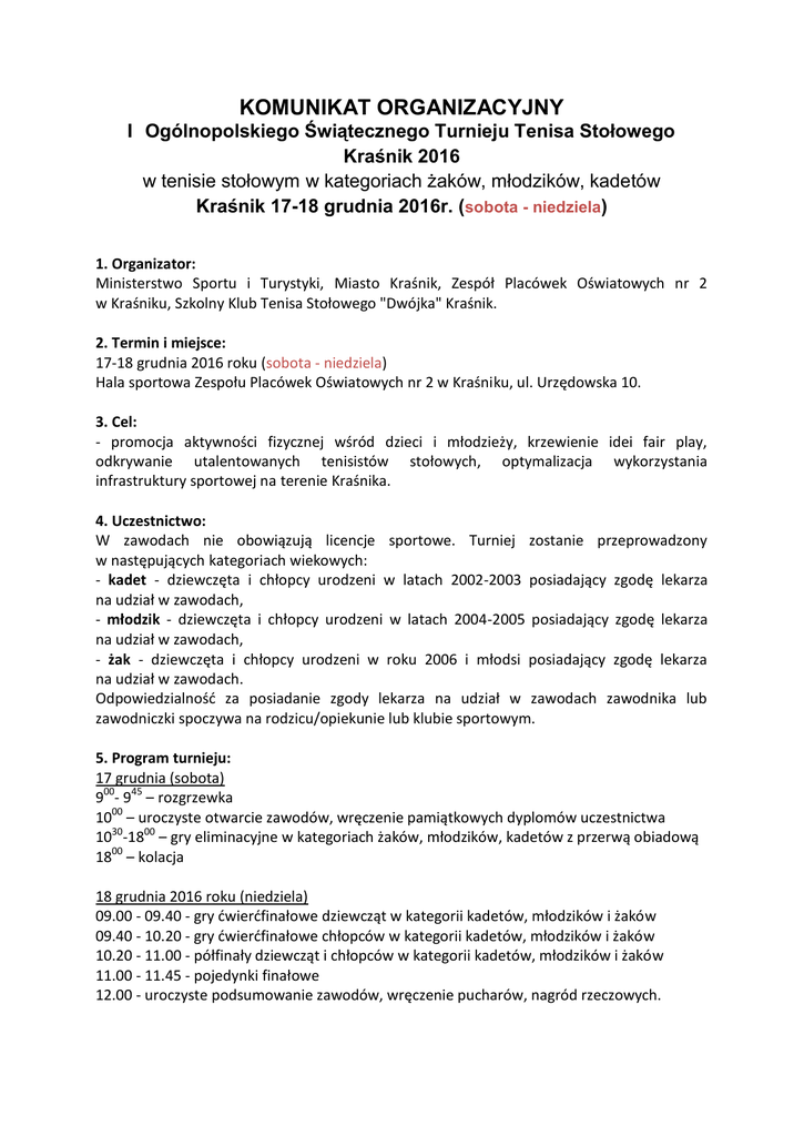 KOMUNIKAT ORGANIZACYJNY I Ogólnopolskiego Świątecznego Turnieju Tenisa Stołowego Kraśnik 2016 w tenisie stołowym w kategoriach żaków, młodzików, kadetów Kraśnik 17-18 grudnia 2016r. (sobota - niedziela) 1. Organizator: Ministerstwo Sportu i Turystyki, Miasto Kraśnik, Zespół Placówek Oświatowych nr 2 w Kraśniku, Szkolny Klub Tenisa Stołowego "Dwójka" Kraśnik. 2. Termin i miejsce: 17-18 grudnia 2016 roku (sobota - niedziela) Hala sportowa Zespołu Placówek Oświatowych nr 2 w Kraśniku, ul. Urzędowska 10. 3. Cel: - promocja aktywności fizycznej wśród dzieci i młodzieży, krzewienie idei fair play, odkrywanie utalentowanych tenisistów stołowych, optymalizacja wykorzystania infrastruktury sportowej na terenie Kraśnika. 4. Uczestnictwo: W zawodach nie obowiązują licencje sportowe. Turniej zostanie przeprowadzony w następujących kategoriach wiekowych: - kadet - dziewczęta i chłopcy urodzeni w latach 2002-2003 posiadający zgodę lekarza na udział w zawodach, - młodzik - dziewczęta i chłopcy urodzeni w latach 2004-2005 posiadający zgodę lekarza na udział w zawodach, - żak - dziewczęta i chłopcy urodzeni w roku 2006 i młodsi posiadający zgodę lekarza na udział w zawodach. Odpowiedzialność za posiadanie zgody lekarza na udział w zawodach zawodnika lub zawodniczki spoczywa na rodzicu/opiekunie lub klubie sportowym. 5. Program turnieju: 17 grudnia (sobota) 900- 945 – rozgrzewka 1000 – uroczyste otwarcie zawodów, wręczenie pamiątkowych dyplomów uczestnictwa 1030-1800 – gry eliminacyjne w kategoriach żaków, młodzików, kadetów z przerwą obiadową 1800 – kolacja 18 grudnia 2016 roku (niedziela) 09.00 - 09.40 - gry ćwierćfinałowe dziewcząt w kategorii kadetów, młodzików i żaków 09.40 - 10.20 - gry ćwierćfinałowe chłopców w kategorii kadetów, młodzików i żaków 10.20 - 11.00 - półfinały dziewcząt i chłopców w kategorii kadetów, młodzików i żaków 11.00 - 11.45 - pojedynki finałowe 12.00 - uroczyste podsumowanie zawodów, wręczenie pucharów, nagród rzeczowych. 6. Zgłoszenia: Zgłoszenia do zawodów przyjmowane są do dnia 14 grudnia 2016 roku telefonicznie: 609 182 418 lub za pośrednictwem poczty elektronicznej: [email protected] 7. System rozgrywek: Decyzję dotyczącą wyboru systemu gier podejmuje Sędzia Główny przed zawodami w zależności od ilości uczestników i możliwości organizacyjnych (systemem do dwóch przegranych lub grupowo - pucharowym). Rozstawienie zawodników na podstawie aktualnych rankingów ogólnopolskich w sezonie 2016/2017 w danej kategorii wiekowej. W dniu 17 grudnia rozgrywane będą gry eliminacyjne. 18 grudnia przeprowadzone zostaną gry ćwierćfinałowe, półfinałowe i finałowe. 8. Nagrody: Zdobywcy miejsc I-IV otrzymają puchary i nagrody rzeczowe. Nagrody otrzymają również zawodnicy sklasyfikowani na miejscach V-VIII oraz najlepsi kraśniczanie. Wszystkim startującym zostaną wręczone pamiątkowe dyplomy uczestnictwa. 9. Wyżywienie: Wszyscy uczestnicy wraz z opiekunami zostaną objęci nieodpłatnym wyżywieniem. 10. Sprawy finansowe: Koszty organizacyjne zostaną dofinansowane ze środków Ministerstwa Sportu i Turystyki w ramach programu "Sport Wszystkich Dzieci" oraz ze środków Miasta Kraśnik, Starostwa Powiatowego w Kraśniku oraz środków własnych. Organizator nie ubezpiecza uczestników od następstw nieszczęśliwych wypadków. Opłaty startowe nie będą pobierane. 11. Sprzęt sportowy: Turniej zostanie rozegrany na 12 stołach Butterfly Octet, piłeczki białe. Organizatorzy