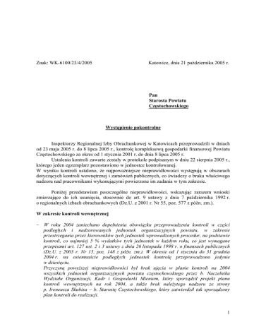Znak: WK-6100/23/4/2005 Katowice, dnia 21 października 2005 r. Pan Starosta Powiatu Częstochowskiego Wystąpienie pokontrolne Inspektorzy Regionalnej Izby Obrachunkowej w Katowicach przeprowadzili w dniach od 23 maja 2005 r. do 8 lipca 2005 r., kontrolę kompleksową gospodarki finansowej Powiatu Częstochowskiego za okres od 1 stycznia 2001 r. do dnia 8 lipca 2005 r. Ustalenia kontroli zawarte zostały w protokole podpisanym w dniu 22 sierpnia 2005 r., którego jeden egzemplarz pozostawiono w jednostce kontrolowanej. W wyniku kontroli ustalono, Ŝe najpowaŜniejsze nieprawidłowości występują w obszarach dotyczących kontroli wewnętrznej i zamówień publicznych, co świadczy o braku właściwego nadzoru nad pracownikami wykonującymi powierzone im zadania w tym zakresie. PoniŜej przedstawiam poszczególne nieprawidłowości, wskazując zarazem wnioski zmierzające do ich usunięcia, stosownie do art. 9 ustawy z dnia 7 października 1992 r. o regionalnych izbach obrachunkowych (Dz.U. z 2001 r. Nr 55, poz. 577 z późn. zm.). W zakresie kontroli wewnętrznej − W roku 2004 zaniechano dopełnienia obowiązku przeprowadzenia kontroli w części podległych i nadzorowanych jednostek organizacyjnych powiatu, w zakresie przestrzegania przez kierowników tych jednostek wprowadzonych procedur, na podstawie kontroli, co najmniej 5 % wydatków tych jednostek w kaŜdym roku, co jest wymagane przepisami art. 127 ust. 2 i 3 ustawy z dnia 26 listopada 1998 r. o finansach publicznych (Dz.U. z 2003 r. Nr 15, poz. 148 z późn. zm.). W okresie od 1 stycznia do 31 grudnia 2004 r. na osiemnaście podległych jednostek kontrolę przeprowadzono jedynie w dziesięciu. Przyczyną powyŜszej nieprawidłowości był brak ujęcia w planie kontroli na 2004 wszystkich jednostek organizacyjnych powiatu częstochowskiego przez b. Naczelnika Wydziału Organizacji, Kadr i Gospodarki Mieniem, który sporządził projekt planu kontroli wewnętrznych na rok 2004, a takŜe brak naleŜytego nadzoru ze strony p. Ireneusza Skubisa – b. Starostę Częstochowskiego, który zatwierdził tak sporządzony plan kontroli do realizacji. 1 Wniosek nr 1 Zorganizować system kontroli wewnętrznej w sposób umoŜliwiający realizację obowiązków wynikających z postanowień art. 127 ust. 2 i 3 ustawy z dnia 26 listopada 1998 r. o finansach publicznych (Dz.U. z 2003 r. Nr 15, poz. 148 z późn. zm.). W zakresie wydatków bieŜących − Udzielenie podmiotom niezaliczanym do sektora finansów publicznych dotacji, pomimo niedotrzymania przez te podmioty terminu złoŜenia wniosków o dotacje, ustalonego w Uchwale Rady Powiatu Nr 167/XXIV/01 z dnia 7 lutego 2001 r. w sprawie określenia zasad udzielania dotacji. Zgodnie z Uchwałą wnioski o udzielenie dotacji składa się w terminie do dnia 30 września roku poprzedzającego kaŜdy rok budŜetowy, natomiast: • Powiatowe Zrzeszenie - Ludowe Zespoły Sportowe w Częstochowie złoŜyło wnioski o dotację: dnia 3 grudnia 2002 r. na rok 2003 oraz dnia 3 lutego 2004 r. na rok 2004, • Powiatowy Związek Sportowy Częstochowa wniosek o dotację na rok 2004 złoŜył dnia 5 lutego 2004 r., • Klub Sportowy „Dragon” Janów wniosek o dotację na rok 2004 złoŜył dnia 25 lutego 2004 r., − Do rozliczenia dotacji udzielonej w 2003 roku Powiatowemu Zrzeszeniu - Ludowe Zespoły Sportowe w Częstochowie, przyjęto fakturę z dnia 27 stycznia 2003 r. na kwotę 370,84 zł za korzystanie z telefonu w miesiącu grudniu 2002 r. oraz fakturę z dnia 3 marca 2003 r. w kwocie 399,81 zł za korzystanie z telefonu w miesiącu styczniu 2003 r. Faktury te dotyczyły kosztów powstałych przed terminem realizacji zadania określonym na okres od 1 lutego do 30 listopada 2003 r., zgodnie z § 1 pkt 2 zawartej w dniu 31 marca 2003 r umowy w sprawie udzielenia dotacji. Przyczyną powyŜszych nieprawidłowości było nierzetelne wykonywanie obowiązków przez Głównego Specjalistę w Wydziale Edukacji, Zdrowia, Kultury, Sportu i Promocji Powiatu odpowiedzialnego merytorycznie za rozpatrywanie wniosków o dotacje oraz składanych rozliczeń. Osobami odpowiedzialnymi za udzielenie dotacji na podstawie wniosków złoŜonych po terminie określonym uchwałą Rady Powiatu są równieŜ p. Ireneusz Skubis – b. Starosta Częstochowski i p. Stanisław Kucia – b. Wicestarosta, którzy zawarli umowy dotacji. Wniosek nr 2 Wzmocnić nadzór nad pracownikiem zatrudnionym na stanowisku Głównego Specjalisty w Wydziale Edukacji, Zdrowia, Kultury, Sportu i Promocji Powiatu, odpowiedzialnym za analizę wniosków o dotacje oraz za zgodność rozliczeń przekazanych dotacji z postanowieniami zawartych umów dotacji, mając na uwadze art. 35a ustawy z dnia 26 listopada 1998 roku o finansach publicznych (Dz. U. z 2003 r. Nr 15, poz. 148 z późn. zm.). Wniosek nr 3 Ponownie rozliczyć dotację udzieloną Powiatowemu Zrzeszeniu - Ludowe Zespoły Sportowe w Częstochowie, w celu wyegzekwowania zwrotu nieprawidłowo wykorzystanych środków pienięŜnych, mając na uwadze umowę dotacji zawartą w dniu 31 marca 2003 r. oraz art. 118 ustawy z dnia 26 listopada 1998 r. o finansach publicznych (Dz.U. z 2003 r. Nr 15, poz. 148 z późn. zm.). 2 W zakresie zamówień publicznych − W ogłoszeniu z dnia 1 września 2004 r. o przetargu nieograniczonym o wartości szacunkowej poniŜej 60.000 EURO na zadanie pn. „Weryfikacja uŜytków w gruntach rolnych oraz w gruntach zabudowanych i zurbanizowanych”, zamieszczonym w siedzibie zamawiającego, zaniechano zawarcia informacji na temat kryteriów oceny ofert i ich znaczenia, czym naruszono przepisy art. 41 pkt 9 ustawy z dnia 29 stycznia 2004 roku Prawo zamówień publicznych (Dz. U. z 2004 r. Nr 19, poz. 177 z późn. zm.). − W ogłoszeniu z dnia 4 sierpnia 2004 r. o przetargu nieograniczonym o wartości szacunkowej poniŜej 60.000 EURO na zadanie pn. „Dostawa betonu i stali zbrojeniowej na plac budowy obiektu szkolnego w Koniecpolu”, zamieszczonym w siedzibie zamawi