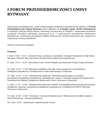 I FORUM PRZEDSIĘBIORCZOŚCI GMINY RYTWIANY Zapraszamy przedsiębiorców i osoby rozpoczynające działalność gospodarczą do udziału w I Forum Przedsiębiorczości Gminy Rytwiany, które odbędzie się 9 lutego o godz. 10.00 w Rytwianach w Gminnym Centrum Kultury Sportu i Informacji Turystycznej, ul. Szkolna 1. Zapewniamy możliwość uzyskania wszelkich informacji związanych m.in. z rozpoczęciem prowadzenia działalności gospodarczej, możliwością pozyskania środków finansowych, zarówno krajowych, jak i unijnych na rozpoczęcie i rozwój działalności. Udział w Forum jest bezpłatny. Program: I. Godz. 10.00 – 10.10 – otwarcie Forum, powitanie uczestników. Grzegorz Forkasiewicz Wójt Gminy Rytwiany, Wojciech Skowron Prezes Zarządu Staszowskiej Izby Gospodarczej. II. Godz. 10.15 – 10.30 – Jak założyć firmę. Gerard Majsak, przedstawiciel Urzędu Gminy Rytwiany. III. Godz. 10.35 – 11.00 Informacje podatkowe dla osób rozpoczynających i prowadzących działalność gospodarczą. Przedstawiciel Urzędu Skarbowego w Staszowie. IV. Godz. 11.05 – 11.30 - Ubezpieczenia społeczne. Obowiązki spoczywające na osobach prowadzących działalność gospodarczą wynikających z ustawy o systemie ubezpieczeń społecznych. Przedstawiciel Zakładu Ubezpieczeń Społecznych, Biuro Terenowe w Staszowie. V. Godz. 11.35 – 12.00 - Ubezpieczenia społeczne rolników w przypadku jednoczesnego prowadzenia działalności rolniczej i pozarolniczej działalności gospodarczej. Przedstawiciel KRUS, Placówka Terenowa w Staszowie. VI. Godz. 12.05 – 13.00 - Tworzenie i rozwój przedsiębiorczości. Wykorzystanie środków unijnych – Paweł Walczyszyn - Inicjatywalokalna.pl VII. Godz. 13.05 – zakończenie i podsumowanie Forum. Organizatorzy: Gmina Rytwiany www.rytwiany.com.pl Staszowska Izba Gospodarcza Staszów, ul. Parkowa 10, 28 – 200 Staszów Gmina Rytwiany - www.rytwiany.com.pl