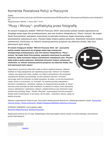Komenda Powiatowa Policji w Pszczynie Źródło: http://pszczyna.slaska.policja.gov.pl/k19/informacje/aktualnosci/50768,quotPlusy-i-Minusyquot-profilaktyka-przez-fotografie.h tml Wygenerowano: Wtorek, 7 marca 2017, 14:21 "Plusy i Minusy"- profilaktyką przez fotografię W ramach trwających działań "EKO-Art Pszczyna 2010" pszczyńska policja została zaproszona do drugiego etapu tego eko-przedsięwzięcia. Jest nim konkurs fotograficzny "Plusy i minusy" Na mapie Ziemi Pszczyńskiej, specjalnie stworzonej na potrzeby konkursu, będą nanoszone miejsca powstawania nadsyłanych prac. Plusami będą miejsca godne polecenia. Natomiast minusami miejsca zaśmiecone, niechciane, te, którym uważniej powinny przyjrzeć się właściwe służby. Oby tych pierwszych było więcej W ramach trwających działań "EKO-Art Pszczyna 2010 rok" pszczyńska policja została zaproszona do drugiego etapu tego artystycznoekologicznego przedsięwzięcia. Jest nim konkurs fotograficzny "Plusy i minusy" Na mapie Ziemi Pszczyńskiej, specjalnie stworzonej na potrzeby konkursu, będą nanoszone miejsca powstawania nadsyłanych prac. Plusami będą miejsca godne polecenia. Natomiast minusami miejsca zaśmiecone, niechciane, te, którym uważniej powinny przyjrzeć się właściwe służby. Oby tych pierwszych było więcej ! Organizatorzy wyznaczyli sobie kilka celów w trakcie realizacji konkursu. Głównie, działania te mają zaangażować jak najwiekszą grupę ludzi. Konkurs ma charakter otwarty, bez ograniczeń wieku, profesji, czy miejsca zamieszkania. Ma uzmysłowić mieszkańcom powiatu pszczyńskiego, że sami jesteśmy twórcami "minusów" wyrzucając worki ze śmieciami na dzikie wysypiska, do lasów, czy też do przydrożnych rowów. Pomóc w zrozumieniu, że "minusów" nie wyeliminuje kilku policjantów z bloczkiem mandatowym. Uwrażliwić, wskazać na niezaprzeczalnyą prawdę, że "plusy" , tworzone przez przyrodę lub ludzi wrażliwych, to właśnie te miejsca, które najchętniej wszyscy odwiedzamy i podziwiamy. Jednym z założeń konkursu jest stworzenie mapy powiatu pszczyńskiego. Mapy " Plusów i Minusów", wyznaczajacej kierunki przyszłych działań służb mundurowych, w tym policji, ale nie tylko... wszystkich, którym, zależy na pięknie przyrody. Głównym organizatorem konkursu jest Pszczyńskie Stowarzyszenie Artystyczne. Współorganizatorami zostali: Pszczyńskie Centrum Kultury, Policja w Pszczynie, Miejsko–Powiatowa Biblioteka Publiczna w Pszczynie PATRONAT HONOROWY nad projektem objęli: Burmistrz Miasta Pszczyna, Starosta Pszczyński Rozpoczęcie konkursu już 15 maja. Dokładniejsze informacje będzie można uzyskać na stronie jednego z pszczyńskich portali internetowych. Ocena: 0/5 (0) Tweetnij