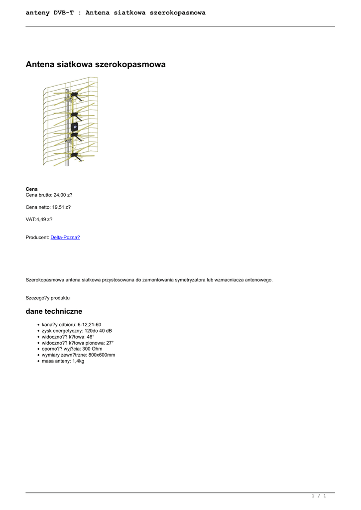 anteny DVB-T : Antena siatkowa szerokopasmowa Antena siatkowa szerokopasmowa Cena Cena brutto: 24,00 z? Cena netto: 19,51 z? VAT:4,49 z? Producent: Delta-Pozna? Szerokopasmowa antena siatkowa przystosowana do zamontowania symetryzatora lub wzmacniacza antenowego. Szczegó?y produktu dane techniczne kana?y odbioru: 6-12;21-60 zysk energetyczny: 120do 40 dB widoczno?? k?towa: 46° widoczno?? k?towa pionowa: 27° oporno?? wyj?cia: 300 Ohm wymiary zewn?trzne: 800x600mm masa anteny: 1,4kg 1 / 1 Powered by TCPDF (www.tcpdf.org)