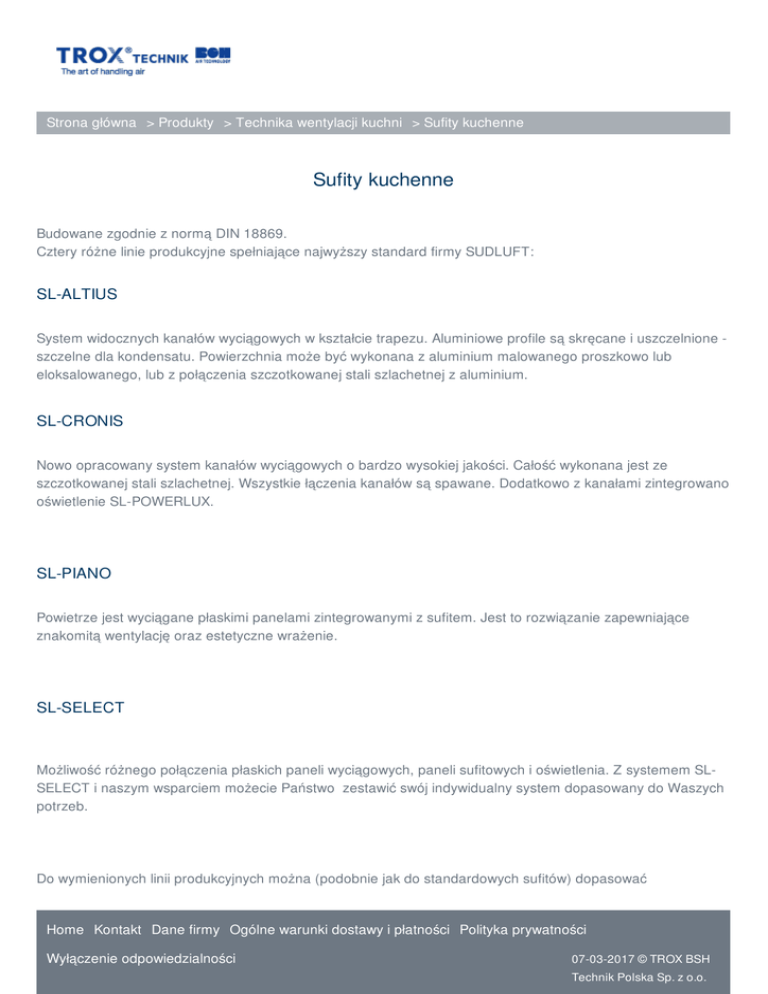 Strona główna > Produkty > Technika wentylacji kuchni > Sufity kuchenne Sufity kuchenne Budowane zgodnie z normą DIN 18869. Cztery różne linie produkcyjne spełniające najwyższy standard firmy SUDLUFT: SL-ALTIUS System widocznych kanałów wyciągowych w kształcie trapezu. Aluminiowe profile są skręcane i uszczelnione szczelne dla kondensatu. Powierzchnia może być wykonana z aluminium malowanego proszkowo lub eloksalowanego, lub z połączenia szczotkowanej stali szlachetnej z aluminium. SL-CRONIS Nowo opracowany system kanałów wyciągowych o bardzo wysokiej jakości. Całość wykonana jest ze szczotkowanej stali szlachetnej. Wszystkie łączenia kanałów są spawane. Dodatkowo z kanałami zintegrowano oświetlenie SL-POWERLUX. SL-PIANO Powietrze jest wyciągane płaskimi panelami zintegrowanymi z sufitem. Jest to rozwiązanie zapewniające znakomitą wentylację oraz estetyczne wrażenie. SL-SELECT Możliwość różnego połączenia płaskich paneli wyciągowych, paneli sufitowych i oświetlenia. Z systemem SLSELECT i naszym wsparciem możecie Państwo zestawić swój indywidualny system dopasowany do Waszych potrzeb. Do wymienionych linii produkcyjnych można (podobnie jak do standardowych sufitów) dopasować Home Kontakt Dane firmy Ogólne warunki dostawy i płatności Polityka prywatności Wyłączenie odpowiedzialności 07-03-2017 © TROX BSH Technik Polska Sp. z o.o. Strona główna > Produkty > Technika wentylacji kuchni > Sufity kuchenne wyposażenie dodatkowe, takie jak: system odzysku ciepła, instalację czyszczącą, zastosowanie lamp UV, automatyczną regulację, izolację akustyczną, itd TROX BSH Technik Polska Sp. z o.o. Kontakt online Formularz kontaktowy Kontakt TROX BSH Stara Iwiczna Zgłoszenie usterki Zapytanie ofertowe - szafy Telefon: +48 22 73718 58 Fax: +48 22 737 18 59 Tel. Komórkowy: +48 662 129 415 Kontakt TROX BSH Technik Polska Sp. z o.o. ul. Kolejowa 13, Stara Iwiczna 05-500 Piaseczno telefon +48 22 737 18 58 fax +48 22 737 18 59 e-mail: [email protected] Home Kontakt Dane firmy Ogólne warunki dostawy i płatności Polityka prywatności Wyłączenie odpowiedzialności 07-03-2017 © TROX BSH Technik Polska Sp. z o.o.