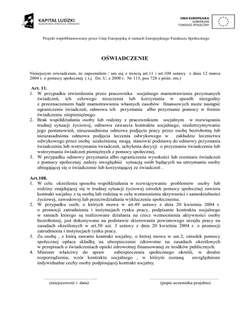Projekt współfinansowany przez Unię Europejską w ramach Europejskiego Funduszu Społecznego OŚWIADCZENIE Niniejszym oświadczam, Ŝe zapoznałem / am się z treścią art.11 i art.108 ustawy z dnia 12 marca 2004 r. o pomocy społecznej ( t.j. Dz. U. z 2008 r. Nr 115, poz 728 z późn. zm.) Art. 11. 1. W przypadku stwierdzenia przez pracownika socjalnego marnotrawienia przyznanych świadczeń, ich celowego niszczenia lub korzystania w sposób niezgodny z przeznaczeniem bądź marnotrawienia własnych zasobów finansowych moŜe nastąpić ograniczenie świadczeń, odmowa ich przyznania albo przyznanie pomocy w formie świadczenia niepienięŜnego. 2. Brak współdziałania osoby lub rodziny z pracownikiem socjalnym w rozwiązaniu trudnej sytuacji Ŝyciowej, odmowa zawarcia kontraktu socjalnego, niedotrzymywanie jego postanowień, nieuzasadniona odmowa podjęcia pracy przez osobę bezrobotną lub nieuzasadniona odmowa podjęcia leczenia odwykowego w zakładzie lecznictwa odwykowego przez osobę uzaleŜnioną mogą stanowić podstawę do odmowy przyznania świadczenia lub wstrzymania świadczeń, uchylenia decyzji o przyznaniu świadczenia lub wstrzymania świadczeń pienięŜnych z pomocy społecznej. 3. W przypadku odmowy przyznania albo ograniczenia wysokości lub rozmiaru świadczeń z pomocy społecznej ,naleŜy uwzględnić sytuację osób będących na utrzymaniu osoby ubiegającej się o świadczenie lub korzystającej ze świadczeń . Art.108. 1. W celu określenia sposobu współdziałania w rozwiązywaniu problemów osoby lub rodziny znajdującej się w trudnej sytuacji Ŝyciowej ośrodek pomocy społecznej zawiera kontrakt socjalny z tą osobą lub rodziną w celu wzmocnienia aktywności i samodzielności Ŝyciowej, zawodowej lub przeciwdziałania wykluczeniu społecznemu. 2. W przypadku osób, o których mowa w art.49 ustawy z dnia 20 kwietnia 2004 r. o promocji zatrudnienia i instytucjach rynku pracy, podpisanie kontraktu socjalnego w ramach którego są realizowane działania na rzecz wzmocnienia aktywności osoby bezrobotnej, jest dokonywane na podstawie skierowania powiatowego urzędu pracy na zasadach określonych w art.50 ust. 3 ustawy z dnia 20 kwietnia 2004 r. o promocji zatrudnienia i instytucjach rynku pracy. 3. Za osobę , z którą zawarto kontrakt socjalny, o której mowa w ust.2, ośrodek pomocy społecznej opłaca składkę na ubezpieczenie zdrowotne na zasadach określonych w przepisach o świadczeniach opieki zdrowotnej finansowanej ze środków publicznych. zabezpieczenia społecznego określi, w drodze 4. Minister właściwy do spraw rozporządzenia, wzór kontraktu socjalnego , w którym zostaną uwzględnione indywidualne cechy osoby podpisującej kontrakt socjalny. …………………………….. (miejscowość i data) ……………………………………… (popis uczestnika projektu) Projekt współfinansowany przez Unię Europejską w ramach Europejskiego Funduszu Społecznego