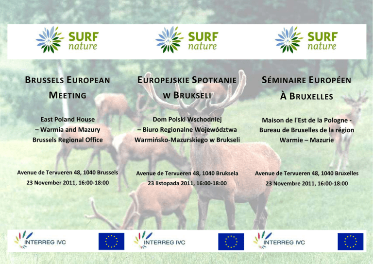B RUSSELS E UROPEAN M EETING E UROPEJSKIE S POTKANIE W B RUKSELI S ÉMINAIRE E UROPÉEN East Poland House – Warmia and Mazury Brussels Regional Office Dom Polski Wschodniej – Biuro Regionalne Województwa Warmińsko-Mazurskiego w Brukseli Maison de l'Est de la Pologne Bureau de Bruxelles de la région Warmie – Mazurie Avenue de Tervueren 48, 1040 Brussels Avenue de Tervueren 48, 1040 Bruksela Avenue de Tervueren 48, 1040 Bruxelles 23 November 2011, 16:00-18:00 23 listopada 2011, 16:00-18:00 23 Novembre 2011, 16:00-18:00 À B RUXELLES 15:30 Refreshments on arrival and registration 15:30 Rejestracja i napoje na dobry początek 15:30 Rafraîchissements et inscriptions 16:00 Welcome and introduction 16:00 Powitanie i wstęp 16:00 Accueil et introduction Jan Bobek – Councillor of the WarmińskoMazurskie Voivodeship 16:10 Investing in biodiversity Jan Bobek – Radny Sejmiku Województwa Warmińsko-Mazurskiego 16:10 Investir dans la biodiversité 16:10 Inwestowanie w bioróżnorodność Mathieu Fichter – Policy Analyst Environment European Commission - DG Regio Mathieu Fichter – Analityk Polityki Środowiskowej, Komisja Europejska - DG Regio 16:25 The SURF-Nature project and biodiversity funding in regional policy 16:25 Projekt SURF-Nature a finansowanie bioróżnorodności w polityce regionalnej Peter Torkler – WWF Germany 16:40 The need for EU support to protect biodiversity and local impacts of the SURF-Nature project Philippe Meslay – Vice-president of the Côtes d'Armor General Council 16:55 Importance of nature protection and its financing for Warmia and Mazury region Jan Bobek – Councillor of the WarmińskoMazurskie Voivodeship Peter Torkler – WWF Germany 16:40 Potrzeba wsparcia ochrony bioróżnorodności przez Unię Europejską oraz lokalny wpływ projektu SURF-Nature Philippe Meslay – Wiceprzewodniczący Rady Generalnej Departamentu Côtes d'Armor 16:55 Znaczenie ochrony przyrody oraz finansowanie w regionie Warmii i Mazur Jan Bobek – Elu de la Diétine de Warmie Mazurie jej Jan Bobek – Radny Sejmiku Województwa Warmińsko-Mazurskiego Mathieu Fichter – Analyste environnement, DG Regio, Européenne politique Commission 16:25 Le projet SURF- Nature et les financements pour la biodiversité dans la politique régionale. Peter Torkler – WWF Allemagne 16:40 L'importance des financements européens pour la protection de la biodiversité et l'impact du projet SURF en Côtes d'Armor Philippe Meslay – Vice Président du Conseil Général des Côtes d'Armor 16:55 L'importance de la protection de la nature et son financement pour la Warmie Mazurie Jan Bobek – Elu de la Diétine de Warmie Mazurie 17:10 “Heading for the Capes” - Piotr Zarębski’s film 17:10 „Kierunek przylądki” - film Piotra Zarębskiego 17:10 "Destination caps” - Film de Piotr Zarębski 17:20 Discussion – moderator: Peter Torkler 17:20 Dyskusja – moderator: Peter Torkler 17:20 Discussion – animateur: Peter Torkler 17:45 Conclusion and closing 17:45 Podsumowanie i zamknięcie spotkania 17:45 Conclusion et fin 18:00 Dinner and informal discussions 18:00 Kolacja i nieformalne dyskusje 18:00 Dîner et discussion informelle