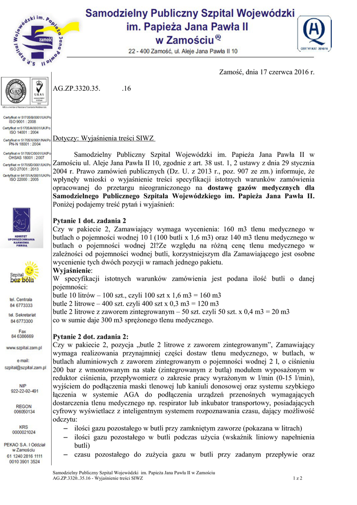 Zamość, dnia 17 czerwca 2016 r. AG.ZP.3320.35. .16 Dotyczy: Wyjaśnienia treści SIWZ Samodzielny Publiczny Szpital Wojewódzki im. Papieża Jana Pawła II w Zamościu ul. Aleje Jana Pawła II 10, zgodnie z art. 38 ust. 1, 2 ustawy z dnia 29 stycznia 2004 r. Prawo zamówień publicznych (Dz. U. z 2013 r., poz. 907 ze zm.) informuje, że wpłynęły wnioski o wyjaśnienie treści specyfikacji istotnych warunków zamówienia opracowanej do przetargu nieograniczonego na dostawę gazów medycznych dla Samodzielnego Publicznego Szpitala Wojewódzkiego im. Papieża Jana Pawła II. Poniżej podajemy treść pytań i wyjaśnień: Pytanie 1 dot. zadania 2 Czy w pakiecie 2, Zamawiający wymaga wycenienia: 160 m3 tlenu medycznego w butlach o pojemności wodnej 10 l (100 butli x 1,6 m3) oraz 140 m3 tlenu medycznego w butlach o pojemności wodnej 2l?Ze względu na różną cenę tlenu medycznego w zależności od pojemności wodnej butli, korzystniejszym dla Zamawiającego jest osobne wycenienie tych dwóch pozycji w ramach jednego pakietu. Wyjaśnienie: W specyfikacji istotnych warunków zamówienia jest podana ilość butli o danej pojemności: butle 10 litrów – 100 szt., czyli 100 szt x 1,6 m3 = 160 m3 butle 2 litrowe – 400 szt. czyli 400 szt x 0,3 m3 = 120 m3 butle 2 litrowe z zaworem zintegrowanym – 50 szt. czyli 50 szt. x 0,4 m3 = 20 m3 co w sumie daje 300 m3 sprężonego tlenu medycznego. Pytanie 2 dot. zadania 2: Czy w pakiecie 2, pozycja „butle 2 litrowe z zaworem zintegrowanym”, Zamawiający wymaga realizowania przynajmniej części dostaw tlenu medycznego, w butlach, w butlach aluminiowych z zaworem zintegrowanym o pojemności wodnej 2 l, o ciśnieniu 200 bar z wmontowanym na stałe (zintegrowanym z butlą) modułem wyposażonym w reduktor ciśnienia, przepływomierz o zakresie pracy wyrażonym w l/min (0-15 l/min), wyjściem do podłączenia maski tlenowej lub kaniuli donosowej oraz systemu szybkiego łączenia w systemie AGA do podłączenia urządzeń przenośnych wymagających dostarczenia tlenu medycznego np. respirator lub inkubator transportowy, posiadających cyfrowy wyświetlacz z inteligentnym systemem rozpoznawania czasu, dający możliwość odczytu: – ilości gazu pozostałego w butli przy zamkniętym zaworze (pokazana w litrach) – ilości gazu pozostałego w butli podczas użycia (wskaźnik liniowy napełnienia butli) – czasu pozostałego do zużycia gazu w butli przy zadanym przepływie oraz Samodzielny Publiczny Szpital Wojewódzki im. Papieża Jana Pawła II w Zamościu AG.ZP.3320..35.16 - Wyjaśnienie treści SIWZ 1z2 posiadających system alarmowy sygnalizujący: przy napełnieniu butli gazem wynoszącym 25%, kiedy pozostaje mniej niż 15 mln użytkowania przy zadanym przepływie. Butle wraz z zaworem przystosowane do pracy w w warunkach wysokiego pola magnetycznego do 3 tesli. Wyjaśnienie: Zamawiający wymaga realizacji dostawy 50 szt. butli 2 litrowych z zaworem zintegrowanym. W specyfikacji istotnych warunków zamówienia są podane minimalne wymagania techniczne: „Butla z zaworem zintegrowanym musi posiadać: punkt poboru typu AGA ze zredukowanym tlenem med., przyłącze do dozowania tlenu medycznego minimum 0-15 l/min oraz czytelny odczyt stanu napełnienia butli tlenem med.” Pytanie 3 dot. zadania 5 Czy zamawiający wymaga pełnej legalizacji butli i przystosowania ich do celów medycznych polegającej na: – dwukrotnej pasteryzacja i suszenie butli – wymianie zaworu na nowy (zawór typu RPV czyli zawór zachowujący ciśnienie resztkowe w butli a tym samym zapobiegający zawilgoceniu i zanieczyszczeniu butli) – ocechowaniu butli, jeżeli nie jest opisana nazwą klienta – malowaniu butli – przeprowadzeniu analizy gazu resztkowego na zawartość wilgoci – odbiorze butli przez inspektora UDT Wyjaśnienie: Butle na tlen medyczny sprężony stanowią własność szpitala. Pełna legalizacja butli na tlen medyczny o poj. 40 litrów wraz z wymianą zaworu na nowy zapobiegający zanieczyszczeniu butli oraz malowanie butli. Typ zaworu wg wyżej wymienionych cech zaworu. Legalizacja butli tlenowych tlenu medycznego według obowiązujących przepisów. Lek. med. Andrzej Mielcarek Dyrektor Samodzielnego Publicznego Szpitala Wojewódzkiego im. Papieża Jana Pawła II w Zamościu Samodzielny Publiczny Szpital Wojewódzki im. Papieża Jana Pawła II w Zamościu AG.ZP.3320..35.16 - Wyjaśnienie treści SIWZ 2z2