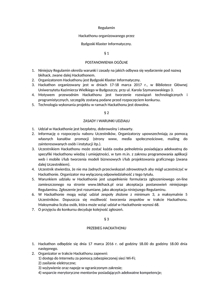 Regulamin Hackathonu organizowanego przez Bydgoski Klaster Informatyczny. §1 POSTANOWIENIA OGÓLNE 1. Niniejszy Regulamin określa warunki i zasady na jakich odbywa się wydarzenie pod nazwą bkihack, zwane dalej Hackathonem. 2. Organizatorem Hackathonu jest Bydgoski Klaster Informatyczny. 3. Hackathon organizowany jest w dniach 17-18 marca 2017 r., w Bibliotece Głównej Uniwersytetu Kazimierza Wielkiego w Bydgoszczy, przy ul. Karola Szymanowskiego 3. 4. Motywem przewodnim Hackathonu jest tworzenie rozwiązań technologicznych i programistycznych, szczegóły zostaną podane przed rozpoczęciem konkursu. 5. Technologia wykonania projektu w ramach Hackathonu jest dowolna. §2 ZASADY I WARUNKI UDZIAŁU 1. Udział w Hackathonie jest bezpłatny, dobrowolny i otwarty. 2. Informację o rozpoczęciu naboru Uczestników, Organizatorzy upowszechniają za pomocą własnych kanałów promocji (strony www, media społecznościowe, mailing do zainteresowanych osób i instytucji itp.). 3. Uczestnikiem Hackathonu może zostać każda osoba pełnoletnia posiadająca adekwatną do specyfiki Hackathonu wiedzę i umiejętności, w tym m.in. z zakresu programowania aplikacji web i mobile i/lub tworzenia modeli biznesowych i/lub projektowania graficznego (zwana dalej Uczestnikiem). 4. Uczestnik stwierdza, że nie ma żadnych przeciwskazań zdrowotnych aby mógł uczestniczyć w Hackathonie. Organizator ma wyłączoną odpowiedzialność z tego tytułu. 5. Warunkiem udziału w Hackathonie jest uzupełnienie formularza zgłoszeniowego on-line zamieszczonego na stronie www.bkihack.pl oraz akceptacja postanowień niniejszego Regulaminu. Zgłoszenie jest rozumiane, jako akceptacja niniejszego Regulaminu. 6. W Hackathonie mogą wziąć udział zespoły złożone z minimum 3, a maksymalnie 5 Uczestników. Dopuszcza się możliwość tworzenia zespołów w trakcie Hackathonu. Maksymalna liczba osób, która może wziąć udział w Hackathonie wynosi 68. 7. O przyjęciu do konkursu decyduje kolejność zgłoszeń. §3 PRZEBIEG HACKATHONU 1. Hackathon odbędzie się dnia 17 marca 2016 r. od godziny 18.00 do godziny 18.00 dnia następnego. 2. Organizator w trakcie Hackathonu zapewni: 1) dostęp do Internetu za pomocą zabezpieczonej sieci Wi-Fi; 2) zasilanie elektryczne; 3) wyżywienie oraz napoje w ograniczonym zakresie; 4) wsparcie merytoryczne mentorów posiadających adekwatne kompetencje; 3. 4. 5. 6. 7. 5) stoły i krzesła dla Uczestników, Komisji Oceny i mentorów; 6) projektor multimedialny wraz z komputerem i niezbędnym oprogramowaniem przeznaczone do prezentacji Projektów; W pozostałym zakresie każdy Uczestnik jest zobowiązany do korzystania z własnego sprzętu oraz innych niezbędnych mu do udziału w Hackathonie narzędzi. Organizator nie ponosi odpowiedzialności za rzeczy pozostawione, zgubione lub skradzione podczas Hackathonu. Uczestnicy są zobowiązani przestrzegać zasad bezpieczeństwa, przepisów BHP i Ppoż. obowiązujących na terenie obiektu, w którym organizowany jest Hackathon. Każdy z Uczestników otrzyma od Organizatora opaskę na rękę, którą zobowiązany jest nosić do końca trwania konkursu. Uczestników Hackathonu obowiązuje zakaz wnoszenia i spożywania alkoholu oraz substancji psychoaktywnych. Na terenie Biblioteki obowiązuje całkowity zakaz palenia. Wyjście na zewnątrz w godzinach od 19.00-09.00 będzie możliwe w przedziałach czasowych podanych przez Organizatora. Organizatorzy zastrzegają, że udostępnione dane oraz systemy i programy komputerowe nie mogą być użyte do celów innych niż do udziału w Hackathonie. §4 WYBÓR ZWYCIĘZCÓW ORAZ PRZYZNANIE NAGRÓD 1. Po zakończeniu Hackathonu Uczestnicy zaprezentują swoje prace, następnie Jury powołane przez Organizatora Hackathonu wybierze 3 (trzy) najlepsze prace za pomocą głosowania, które oceni według następujących kryteriów: a) pomysłowość, b) kreatywność, c) oryginalność, d) użyteczność e) unikalność zaprezentowanych prac; 2. Prezentacja Projektu powstałego w ramach Hackathonu będzie trwała ok. 5 minut. 3. Przygotowane Projekty zostaną ocenione przez Komisję Oceny, w skład której wejdą osoby reprezentujące Organizatorów. Decyzje Komisji są ostateczne i nie przysługuje od nich odwołanie. 4. Zgłoszony do oceny Projekt musi bazować na pracy własnej Uczestników (nie dopuszcza się korzystania z pomocy zewnętrznej). 5. W ramach Hackathonu przewidziane są nagrody rzeczowe ufundowane przez Organizatorów. 6. Nagrody nie podlegają wymianie na ekwiwalent pieniężny, ani na inną nagrodę. 7. W przypadku zaistnienia przewidzianego przepisami prawa obowiązku uiszczenia podatku dochodowego od osób fizycznych z tytułu przyznanych nagród (tj. dla nagród, których wartość przekracza 760 PLN brutto), sponsorzy nagród przyznają dodatkową nagrodę pieniężną na pokrycie podatku dochodowego. §5 WŁASNOŚĆ INTELEKTUALNA 1. Właścicielami wszelkich praw własności intelektualnej do prac i utworów stworzonych podczas Hackathonu są Uczestnicy. 2. Uczestnik poświadcza, iż jest autorem lub współautorem wszelkich prac wykonanych podczas Hackathonu oraz, że prace te nie naruszają jakichkolwiek praw osób trzecich. Uczestnik oświadcza, iż bierze na siebie wszelką odpowiedzialność z tytułu roszczeń osób trzecich, kierowanych wobec Organizatora, które powstałyby w związku z udziałem w Hackathonie. 3. Uczestnik poprzez udział w Hackathonie udziela zezwolenia na utrwalenie i wykorzystanie swojego wizerunku i głosu w materiałach foto i video w celach promocyjnych, bez ograniczeń czasowych i terytorialnych oraz bez wynagrodzenia. 4. Uczestnik udziela Organizatorom zgody na wykorzystanie wszelkich fotografii ukazujących Projekty, które zostały stworzone w trakcie trwania Hackathonu dla celów wewnętrznych oraz promocyjnych. §6 POSTANOWIENIA KOŃCOWE 1. Niniejszy Regulamin wchodzi w życie z dniem 24 listopada 2016 roku. 2. W uzasadnionych przypadkach O