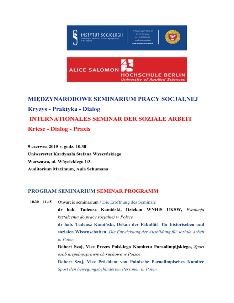MIĘDZYNARODOWE SEMINARIUM PRACY SOCJALNEJ Kryzys - Praktyka - Dialog INTERNATIONALES SEMINAR DER SOZIALE ARBEIT Kriese - Dialog - Praxis 9 czerwca 2015 r. godz. 10.30 Uniwersytet Kardynała Stefana Wyszyńskiego Warszawa, ul. Wóycickiego 1/3 Auditorium Maximum, Aula Schumana PROGRAM SEMINARIUM SEMINAR PROGRAMM 10.30 – 11.45 Otwarcie seminarium / Die Eröffnung des Seminars dr hab. Tadeusz Kamiński, Dziekan WNHiS UKSW, Ewolucja kształcenia do pracy socjalnej w Polsce dr hab. Tadeusz Kamiński, Dekan der Fakultät für historischen und sozialen Wissenschaften, Die Entwicklung der Ausbildung für soziale Arbeit in Polen Robert Szaj, Vice Prezes Polskiego Komitetu Paraolimpijskiego, Sport osób niepełnosprawnych ruchowo w Polsce Robert Szaj, Vice Präsident von Polnische Paraolimpisches Komitee Sport den bewegungsbehinderten Personen in Polen dr Tomasz M. Korczyński, Instytut Socjologii UKSW, Prześladowania chrześcijan w XXI wieku. Perspektywa pracy socjalnej dr Tomasz M. Korczyński, Institut für Soziologie, Christenverfolgung weltweit. Die Perspektive der Soziale Arbeit Prof. Dr. Marion Mayer wraz ze studentami, Alice Salomon Hochschule Berlin Prof. Dr. Marion Mayer mit Studenten, Alice Salomon Hochschule Berlin Dyskusja / Diskussion 11.45 – 12.00 Przerwa / Pause 12.00 – 14.00 dr Piotr Kiembłowski, Fundacja Nagle Sami, Pomagamy ludziom w żałobie iść dalej …, dr Piotr Kiembłowski, Nagle Sami Stiftung, Wir helfen die Menschen in Trauer selbst weiter gehen… Marek Łagodziński, Prezes Fundacji Sławek, ….. Marek Łagodziński, Präsident der Slawek Stiftung, ….. Beata Szynkaruk, Fundacja Synapsis, …. Beata Szynkaruk, Synapsis Stiftung, …. Dyskusja / Diskussion 14.00 Instalacja sensoryczna CUBE – ćwiczenia die sensorische Installation CUBE – Übungen