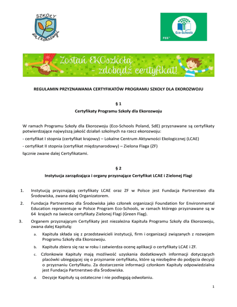 REGULAMIN PRZYZNAWANIA CERTYFIKATÓW PROGRAMU SZKOŁY DLA EKOROZWOJU §1 Certyfikaty Programu Szkoły dla Ekorozwoju W ramach Programu Szkoły dla Ekorozwoju (Eco-Schools Poland, SdE) przyznawane są certyfikaty potwierdzające najwyższą jakość działań szkolnych na rzecz ekorozwoju: - certyfikat I stopnia (certyfikat krajowy) – Lokalne Centrum Aktywności Ekologicznej (LCAE) - certyfikat II stopnia (certyfikat międzynarodowy) – Zielona Flaga (ZF) łącznie zwane dalej Certyfikatami. §2 Instytucja zarządzająca i organy przyznające Certyfikat LCAE i Zielonej Flagi 1. Instytucją przyznającą certyfikaty LCAE oraz ZF w Polsce jest Fundacja Partnerstwo dla Środowiska, zwana dalej Organizatorem. 2. Fundacja Partnerstwo dla Środowiska jako członek organizacji Foundation for Environmental Education reprezentuje w Polsce Program Eco-Schools, w ramach którego przyznawane są w 64 krajach na świecie certyfikaty Zielonej Flagi (Green Flag). 3. Organem przyznającym Certyfikaty jest niezależna Kapituła Programu Szkoły dla Ekorozwoju, zwana dalej Kapitułą: a. Kapituła składa się z przedstawicieli instytucji, firm i organizacji związanych z rozwojem Programu Szkoły dla Ekorozwoju. b. Kapituła zbiera się raz w roku i zatwierdza ocenę aplikacji o certyfikaty LCAE i ZF. c. d. Członkowie Kapituły mają możliwość uzyskania dodatkowych informacji dotyczących placówki ubiegającej się o przyznanie certyfikatu, które są niezbędne do podjęcia decyzji o przyznaniu Certyfikatu. Za dostarczenie informacji członkom Kapituły odpowiedzialna jest Fundacja Partnerstwo dla Środowiska. Decyzje Kapituły są ostateczne i nie podlegają odwołaniu. 1 §3 Zasady udziału i przyznawania certyfikatów LCAE i ZF 1. O certyfikat mogą ubiegać się: niepubliczne i publiczne przedszkola, szkoły, młodzieżowe ośrodki wychowawcze, bursy szkolne oraz inne podmioty edukacyjne, zwane dalej Placówką. 2. Certyfikacja prowadzona jest na dwóch poziomach: I stopień – ogólnopolski certyfikat Lokalnego Centrum Aktywności Ekologicznej; II stopień – międzynarodowy certyfikat Zielonej Flagi. 3. Certyfikacja w ramach Programu Szkoły dla Ekorozwoju jest ogłaszana w cyklu rocznych edycji. Ogłoszenie nowej edycji powinno nastąpić nie później niż w miesiącu październiku aktualnego roku szkolnego. 4. Placówka, przystępując i rejestrując się do certyfikacji, podejmuje decyzję czy ubiegać się będzie o certyfikat LCAE, czy o ZF. I. Uzyskanie certyfikatu LCEA wiąże się z działaniem w jednym wybranym obszarze tematycznym. II. Uzyskanie certyfikatu ZF wiąże się z działaniem w dwóch wybranych obszarach tematycznych. 5. Aplikacja o Zieloną Flagę wyklucza możliwość otrzymania certyfikatu LCAE (i odwrotnie) w danym roku szkolnym. 6. W trakcie realizacji działań, Szkoła powinna stosować się dodatkowo (oprócz powyższego Regulaminu) do Wytycznych aktualnej edycji Programu Szkoły dla Ekorozwoju zwanych dalej Wytycznymi. 7. Placówka ubiegająca się o wybrany certyfikat ma możliwość wzięcia udziału w jednym z projektów proponowanych w tegorocznej edycji Programu Szkół dla Ekorozwoju. Prowadzenie działań w ramach projektu umożliwi zaliczenie działań w jednym z wybranych obszarów. 8. Przystąpienie do certyfikacji w danym roku szkolnym odbywa się poprzez wypełnienie formularza rejestracyjnego umieszczonego na stronie www.ekoszkola.pl Organizator potwierdza uczestnictwo Placówki w Programie. 9. Organizator udostępnia w wersji elektronicznej formularze ułatwiające pracę w ramach ubiegania się o certyfikat. Są to: formularze audytu (z uwzględnieniem kategorii wiekowej uczniów) i formularz planu działań. 10. Aby ubiegać się o certyfikat, Koordynator/ka programu w Placówce jest z zobligowany/a do wzięcia udziału w płatnym szkoleniu metodologiczno-merytorycznym w terminie i miejscu wyznaczonych przez Organizatora. a. W szkoleniu może wziąć udział więcej niż jedna osoba z danej Placówki, co wiąże się z dodatkową opłatą. 2 b. Każdego roku odbędzie się taka ilość szkoleń, która zaspokoi potrzeby wszystkich zgłoszonych do edycji Placówek. c. Szkolenia odbędą się na początku edycji Programu w różnych terminach i miejscach w Polsce wskazanych przez Organizatora. d. Zakres szkolenia będzie obejmował wiedzę o programie Szkoły dla Ekorozwoju ze szczególnym uwzględnieniem Metodologii Siedmiu Kroków Eco-Schools, a także zajęcia warsztatowe mające na celu pogłębienie postawy ekologicznej w uczestni(cz)kach warsztatu. e. Wprowadzenie opłaty za szkolenie pozwoli na pokrycie kosztów związanych z organizacją szkolenia, zatrudnieniem ekspertów oraz obsługę Programu (koordynacja, produkcję flag i certyfikatów, spotkanie Kapituły, organizację zjazdów z uroczystym wręczeniem certyfikatów, nagrody-wyróżnienia dla najlepszych Placówek) 11. Placówka ubiegająca się o certyfikat jest zobowiązana do terminowego dokonania opłaty za obowiązkowe szkolenie zgodnie z Cennikiem aktualnej edycji Programu Szkoły dla Ekorozwoju, zwanym dalej Cennikiem. 12. Terminy dotyczące kolejnych etapów realizacji działań związanych z ubieganiem się o Certyfikat udostępnione będą wraz z ogłoszeniem edycji na dany rok szkolny w Harmonogramie aktualnej edycji Programu Szkoły dla Ekorozwoju, zwanym dalej Harmonogramem. 13. Placówka ubiegająca się o certyfikat ma za zadanie realizować działania na rzecz ekorozwoju zgodnie z Metodologią Siedmiu Kroków Eco-Schools (szczegóły znajdują się w Wytycznych). I. Powołanie Eko-Komitetu (grupy roboczej) II. Przeprowadzenie audytu ekologicznego (na początku i końcu działań) III. Opracowanie planu działań i jego realizacja IV. Kontrola i ocena prowadzonych działań (na bieżąco) V. Integracja z programem nauczania (na bieżąco) VI. Promocja i współpraca z partnerami zewnętrznymi i (na bieżąco) VII. Opracowanie Eko-Kodeksu (na końcu działań, na po