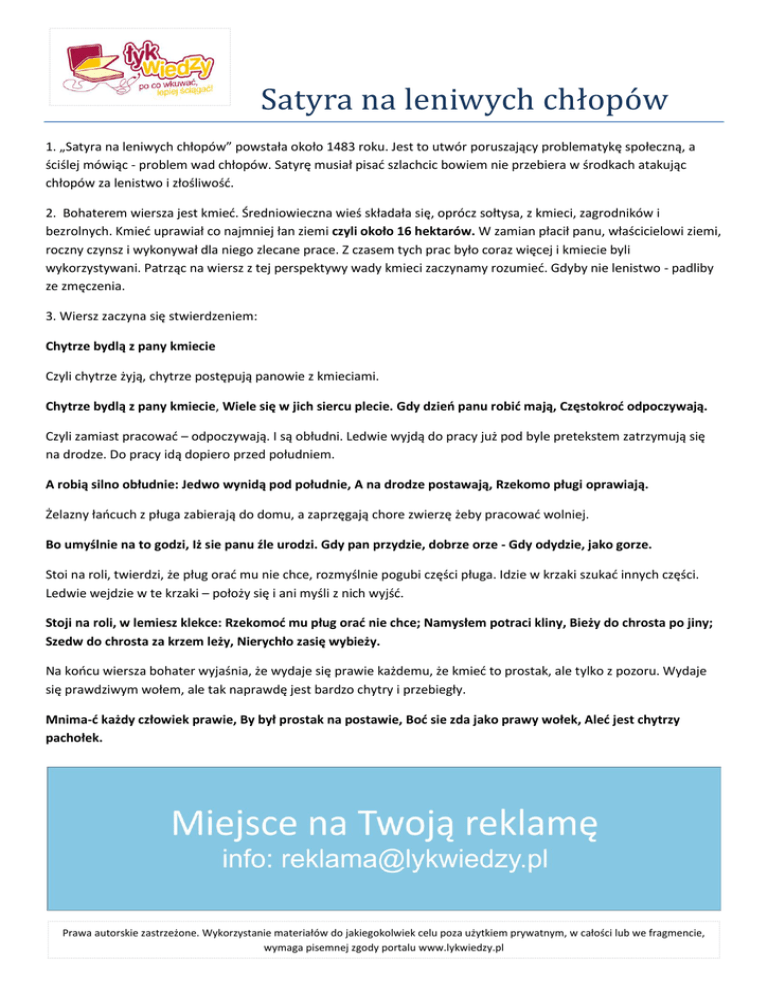 Satyra na leniwych chłopów 1. „Satyra na leniwych chłopów” powstała około 1483 roku. Jest to utwór poruszający problematykę społeczną, a ściślej mówiąc - problem wad chłopów. Satyrę musiał pisad szlachcic bowiem nie przebiera w środkach atakując chłopów za lenistwo i złośliwośd. 2. Bohaterem wiersza jest kmied. Średniowieczna wieś składała się, oprócz sołtysa, z kmieci, zagrodników i bezrolnych. Kmied uprawiał co najmniej łan ziemi czyli około 16 hektarów. W zamian płacił panu, właścicielowi ziemi, roczny czynsz i wykonywał dla niego zlecane prace. Z czasem tych prac było coraz więcej i kmiecie byli wykorzystywani. Patrząc na wiersz z tej perspektywy wady kmieci zaczynamy rozumied. Gdyby nie lenistwo - padliby ze zmęczenia. 3. Wiersz zaczyna się stwierdzeniem: Chytrze bydlą z pany kmiecie Czyli chytrze żyją, chytrze postępują panowie z kmieciami. Chytrze bydlą z pany kmiecie, Wiele się w jich siercu plecie. Gdy dzieo panu robid mają, Częstokrod odpoczywają. Czyli zamiast pracowad – odpoczywają. I są obłudni. Ledwie wyjdą do pracy już pod byle pretekstem zatrzymują się na drodze. Do pracy idą dopiero przed południem. A robią silno obłudnie: Jedwo wynidą pod południe, A na drodze postawają, Rzekomo pługi oprawiają. Żelazny łaocuch z pługa zabierają do domu, a zaprzęgają chore zwierzę żeby pracowad wolniej. Bo umyślnie na to godzi, Iż sie panu źle urodzi. Gdy pan przydzie, dobrze orze - Gdy odydzie, jako gorze. Stoi na roli, twierdzi, że pług orad mu nie chce, rozmyślnie pogubi części pługa. Idzie w krzaki szukad innych części. Ledwie wejdzie w te krzaki – położy się i ani myśli z nich wyjśd. Stoji na roli, w lemiesz klekce: Rzekomod mu pług orad nie chce; Namysłem potraci kliny, Bieży do chrosta po jiny; Szedw do chrosta za krzem leży, Nierychło zasię wybieży. Na koocu wiersza bohater wyjaśnia, że wydaje się prawie każdemu, że kmied to prostak, ale tylko z pozoru. Wydaje się prawdziwym wołem, ale tak naprawdę jest bardzo chytry i przebiegły. Mnima-d każdy człowiek prawie, By był prostak na postawie, Bod sie zda jako prawy wołek, Aled jest chytrzy pachołek. Prawa autorskie zastrzeżone. Wykorzystanie materiałów do jakiegokolwiek celu poza użytkiem prywatnym, w całości lub we fragmencie, wymaga pisemnej zgody portalu www.lykwiedzy.pl