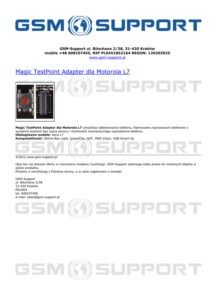 GSM-Support ul. Bitschana 2/38, 31-420 Kraków mobile +48 608107455, NIP PL9451852164 REGON: 120203925 www.gsm-support.pl Magic TestPoint Adapter dla Motorola L7 Magic TestPoint Adapter dla Motorola L7 umożliwia odblokowanie telefonu, flashowanie najnowszych telefonów z wysokimi bootami bez cięcia ekranu i możliwośći mechanicznego uszkodzenia telefonu. Obsługiwane modele: seria L7 Kompatybilność: Ultima Box Light, SmartClip, GOT, MSS Victor, USB Smart itp ©2012 www.gsm-support.pl Opis ten nie stanowi oferty w rozumieniu Kodeksu Cywilnego. GSM-Support zastrzega sobie prawo do możliwych błędów w opisie produktu. Prosimy o weryfikację z Państwa strony, a w razie wątpliwości o kontakt. GSM-Support ul. Bitschana 2/38 31-420 Kraków POLSKA tel. 608107455 e-mail: [email protected] Powered by TCPDF (www.tcpdf.org)