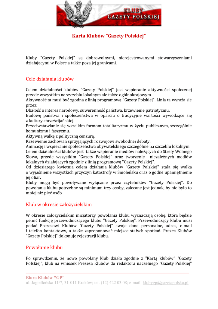 Karta Klubów "Gazety Polskiej” Kluby "Gazety Polskiej" są dobrowolnymi, nierejestrowanymi stowarzyszeniami działającymi w Polsce a także poza jej granicami. Cele działania klubów Celem działalności klubów "Gazety Polskiej" jest wspieranie aktywności społecznej przede wszystkim na szczeblu lokalnym ale także ogólnokrajowym. Aktywność ta musi być zgodna z linią programową "Gazety Polskiej". Linia ta wyraża się przez: Dbałość o interes narodowy, suwerenność państwa, krzewienie patriotyzmu. Budowę państwa i społeczeństwa w oparciu o tradycyjne wartości wywodzące się z kultury chrześcijańskiej. Przeciwstawianie się wszelkim formom totalitaryzmu w życiu publicznym, szczególnie komunizmu i faszyzmu. Aktywną walkę z polityczną cenzurą. Krzewienie zachowań sprzyjających rozwojowi swobodnej debaty. Animację i wspieranie społeczeństwa obywatelskiego szczególnie na szczeblu lokalnym. Celem działalności klubów jest także wspieranie mediów należących do Strefy Wolnego Słowa, przede wszystkim "Gazety Polskiej" oraz tworzenie niezależnych mediów lokalnych działających zgodnie z linią programową "Gazety Polskiej". Od dziesiątego kwietnia celem działania klubów "Gazety Polskiej" stała się walka o wyjaśnienie wszystkich przyczyn katastrofy w Smoleńsku oraz o godne upamiętnienie jej ofiar. Kluby mogą być powoływane wyłącznie przez czytelników "Gazety Polskiej". Do powołania klubu potrzebne są minimum trzy osoby, zalecane jest jednak, by nie było to mniej niż pięć osób. Klub w okresie założycielskim W okresie założycielskim inicjatorzy powołania klubu wyznaczają osobę, która będzie pełnić funkcję przewodniczącego klubu "Gazety Polskiej". Przewodniczący klubu musi podać Prezesowi Klubów "Gazety Polskiej" swoje dane personalne, adres, e-mail i telefon kontaktowy, a także zaproponować miejsce stałych spotkań. Prezes Klubów "Gazety Polskiej" dokonuje rejestracji klubu. Powołanie klubu Po sprawdzeniu, że nowo powołany klub działa zgodnie z "Kartą klubów" "Gazety Polskiej", klub na wniosek Prezesa Klubów do redaktora naczelnego "Gazety Polskiej" Biuro Klubów "GP" ul. Jagiellońska 11/7, 31-011 Kraków; tel. (12) 422 03 08; e-mail: [email protected] może otrzymać prawo do używania loga "Gazety Polskiej". Logo wolno używać wyłącznie w następującej formie "....Klub Gazety Polskiej....". Oznacza to, że przy logu musi być zawsze informacja, że chodzi o "klub". Dysponentem loga jest przewodniczący klubu i on ponosi osobistą odpowiedzialność za jego używanie. Nadanie loga może odbyć się w formie pisemnego certyfikatu. Cofnięcie prawa do używania "loga" Na wniosek Prezesa Klubów „Gazety Polskiej” redaktor naczelny "Gazety Polskiej" może cofnąć prawo do używania loga. Dobrowolne stowarzyszenie ma prawo działać dalej, ale bez szyldu i jakiegokolwiek powoływania się na "Gazetę Polską". Odebranie loga oznacza także wyrejestrowanie klubu. Prawo do używania loga może zostać przywrócone jeżeli klub będzie spełniał zasady zawarte w niniejszej Karcie. Nowy szef, nowe logo Wybór nowego przewodniczącego oznacza wygaśnięcie dotychczasowego prawa do używania loga i konieczność zwrócenia się o ponowne przyznanie tego prawa. Członek klubu Członkiem klubu "Gazety Polskiej" może zostać zarówno obywatel Polski jak i obywatel innego państwa, który zaakceptuje zasady zawarte w niniejszej karcie. Przewodniczący klubu prowadzi listę członków. Sam decyduje o wpisaniu każdego członka klubu na listę. Skreślenie z listy odbywa się na wniosek przewodniczącego klubu do Prezesa Klubów "Gazety Polskiej". Członek klubu nie może podejmować działań szkodzących dobremu imieniu "Gazety Polskiej", ani też swojego klubu. Nie wyklucza to oczywiście prawa do wewnętrznej krytyki. Przewodniczący klubu Przewodniczącym klubu jest osoba wybrana przez członków klubu. Zasady wyboru i odwoływania ustala sam klub. Klub rozstrzyga też o ewentualnym powołaniu innych przedstawicieli (zastępca, sekretarz itp.). Przewodniczący klubu decyduje o charakterze spotkań i ich częstotliwości. Członkowie klubu muszą informować przewodniczącego o wszystkich działaniach podejmowanych pod szyldem klubu. Przewodniczący klubu powinien być nie tylko organizatorem, ale także mediatorem szanującym aktywność i godność osobistą każdego członka klubu. Odpowiada osobiście za sposób używania "loga". Biuro Klubów "GP" ul. Jagiellońska 11/7, 31-011 Kraków; tel. (12) 422 03 08; e-mail: [email protected] Prezes Klubów "Gazety Polskiej" Prezes Klubów „Gazety Polskiej" jest desygnowany przez założyciela Klubów "Gazety Polskiej" Tomasza Sakiewicza. W razie jego śmierci lub niemożności działania prawo do wyznaczenia Prezesa przejmuje osoba wyznaczona przez założyciela. Gdyby i to było niemożliwe Prezesa Klubów powołuje sześćdziesiąt procent ostatnio zarejestrowanych klubów, a odwołuje dwie trzecie. Do zadań Prezesa Klubów należy rejestrowanie klubów "Gazety Polskiej", występowanie do redaktora naczelnego "Gazety Polskiej" o prawo lub cofnięcie prawa do używania loga. Prezes Klubów koordynuje działania informacyjne i działania ogólnopolskie Klubów "Gazety Polskiej". Regiony "GP" Kluby mogą zrzeszać się w regiony. Zrzeszenie w regiony jest dobrowolne, a koordynatorzy są wybierani przez szefów klubów owego zrzeszenia zwykłą większością głosów. Wybór koordynatora zatwierdza Prezes Klubów. W każdej społeczności może działać jeden lub więcej klubów "Gazety Polskiej". Tam, gdzie działa więcej niż jeden klub, należy troszczyć się o to, by kluby sobie wzajemnie nie przeszkadzały. Zwalczanie jednego klubu przez drugi jest rażącym naruszeniem zasad niniejszej karty. Spotkania klubów Spotkania klubów mogą być organizowane wyłącznie dla członków, lub także dla osób nienależących do klubu. O charakterze spotkania 