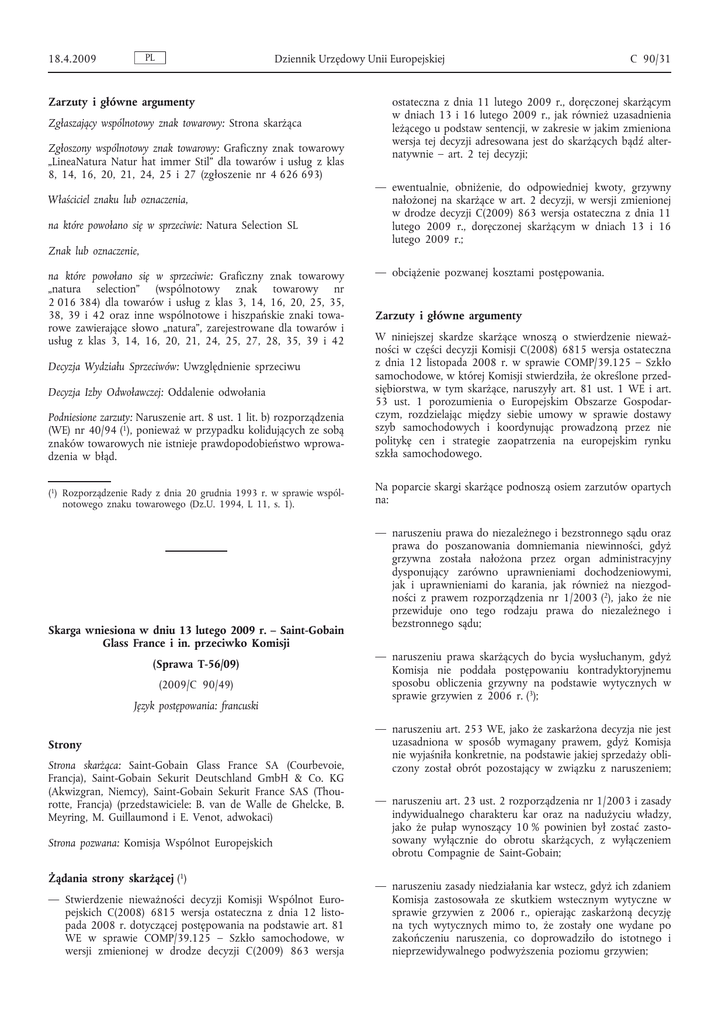 PL 18.4.2009 Dziennik Urzędowy Unii Europejskiej Zarzuty i główne argumenty Zgłaszający wspólnotowy znak towarowy: Strona skarżąca Zgłoszony wspólnotowy znak towarowy: Graficzny znak towarowy „LineaNatura Natur hat immer Stil” dla towarów i usług z klas 8, 14, 16, 20, 21, 24, 25 i 27 (zgłoszenie nr 4 626 693) Właściciel znaku lub oznaczenia, na które powołano się w sprzeciwie: Natura Selection SL Znak lub oznaczenie, na które powołano się w sprzeciwie: Graficzny znak towarowy „natura selection” (wspólnotowy znak towarowy nr 2 016 384) dla towarów i usług z klas 3, 14, 16, 20, 25, 35, 38, 39 i 42 oraz inne wspólnotowe i hiszpańskie znaki towarowe zawierające słowo „natura”, zarejestrowane dla towarów i usług z klas 3, 14, 16, 20, 21, 24, 25, 27, 28, 35, 39 i 42 C 90/31 ostateczna z dnia 11 lutego 2009 r., doręczonej skarżącym w dniach 13 i 16 lutego 2009 r., jak również uzasadnienia leżącego u podstaw sentencji, w zakresie w jakim zmieniona wersja tej decyzji adresowana jest do skarżących bądź alternatywnie – art. 2 tej decyzji; — ewentualnie, obniżenie, do odpowiedniej kwoty, grzywny nałożonej na skarżące w art. 2 decyzji, w wersji zmienionej w drodze decyzji C(2009) 863 wersja ostateczna z dnia 11 lutego 2009 r., doręczonej skarżącym w dniach 13 i 16 lutego 2009 r.; — obciążenie pozwanej kosztami postępowania. Zarzuty i główne argumenty Podniesione zarzuty: Naruszenie art. 8 ust. 1 lit. b) rozporządzenia (WE) nr 40/94 (1), ponieważ w przypadku kolidujących ze sobą znaków towarowych nie istnieje prawdopodobieństwo wprowadzenia w błąd. W niniejszej skardze skarżące wnoszą o stwierdzenie nieważności w części decyzji Komisji C(2008) 6815 wersja ostateczna z dnia 12 listopada 2008 r. w sprawie COMP/39.125 – Szkło samochodowe, w której Komisji stwierdziła, że określone przedsiębiorstwa, w tym skarżące, naruszyły art. 81 ust. 1 WE i art. 53 ust. 1 porozumienia o Europejskim Obszarze Gospodarczym, rozdzielając między siebie umowy w sprawie dostawy szyb samochodowych i koordynując prowadzoną przez nie politykę cen i strategie zaopatrzenia na europejskim rynku szkła samochodowego. (1) Rozporządzenie Rady z dnia 20 grudnia 1993 r. w sprawie wspólnotowego znaku towarowego (Dz.U. 1994, L 11, s. 1). Na poparcie skargi skarżące podnoszą osiem zarzutów opartych na: Decyzja Wydziału Sprzeciwów: Uwzględnienie sprzeciwu Decyzja Izby Odwoławczej: Oddalenie odwołania Skarga wniesiona w dniu 13 lutego 2009 r. – Saint-Gobain Glass France i in. przeciwko Komisji (Sprawa T-56/09) (2009/C 90/49) Język postępowania: francuski Strony Strona skarżąca: Saint-Gobain Glass France SA (Courbevoie, Francja), Saint-Gobain Sekurit Deutschland GmbH & Co. KG (Akwizgran, Niemcy), Saint-Gobain Sekurit France SAS (Thourotte, Francja) (przedstawiciele: B. van de Walle de Ghelcke, B. Meyring, M. Guillaumond i E. Venot, adwokaci) Strona pozwana: Komisja Wspólnot Europejskich Żądania strony skarżącej (1) — Stwierdzenie nieważności decyzji Komisji Wspólnot Europejskich C(2008) 6815 wersja ostateczna z dnia 12 listopada 2008 r. dotyczącej postępowania na podstawie art. 81 WE w sprawie COMP/39.125 – Szkło samochodowe, w wersji zmienionej w drodze decyzji C(2009) 863 wersja — naruszeniu prawa do niezależnego i bezstronnego sądu oraz prawa do poszanowania domniemania niewinności, gdyż grzywna została nałożona przez organ administracyjny dysponujący zarówno uprawnieniami dochodzeniowymi, jak i uprawnieniami do karania, jak również na niezgodności z prawem rozporządzenia nr 1/2003 (2), jako że nie przewiduje ono tego rodzaju prawa do niezależnego i bezstronnego sądu; — naruszeniu prawa skarżących do bycia wysłuchanym, gdyż Komisja nie poddała postępowaniu kontradyktoryjnemu sposobu obliczenia grzywny na podstawie wytycznych w sprawie grzywien z 2006 r. (3); — naruszeniu art. 253 WE, jako że zaskarżona decyzja nie jest uzasadniona w sposób wymagany prawem, gdyż Komisja nie wyjaśniła konkretnie, na podstawie jakiej sprzedaży obliczony został obrót pozostający w związku z naruszeniem; — naruszeniu art. 23 ust. 2 rozporządzenia nr 1/2003 i zasady indywidualnego charakteru kar oraz na nadużyciu władzy, jako że pułap wynoszący 10 % powinien był zostać zastosowany wyłącznie do obrotu skarżących, z wyłączeniem obrotu Compagnie de Saint-Gobain; — naruszeniu zasady niedziałania kar wstecz, gdyż ich zdaniem Komisja zastosowała ze skutkiem wstecznym wytyczne w sprawie grzywien z 2006 r., opierając zaskarżoną decyzję na tych wytycznych mimo to, że zostały one wydane po zakończeniu naruszenia, co doprowadziło do istotnego i nieprzewidywalnego podwyższenia poziomu grzywien; PL C 90/32 Dziennik Urzędowy Unii Europejskiej — naruszeniu zasady proporcjonalności poprzez nałożenie nadmiernej, nieproporcjonalnej i niedającej się uzasadnić odstraszającym skutkiem grzywny; — naruszeniu art. 23 rozporządzenia nr 1/2003 i na braku uzasadnienia, jako że Komisja nie miała prawa oprzeć się na dwóch przypadkach powrotu do naruszenia uznanych za istotne w zaskarżonej decyzji, ponieważ żadna z tych dwóch decyzji nie była adresowana do skarżących; — na naruszeniu prawa i na błędzie w ocenie przy zastosowaniu art. 23 ust. 2 lit. a) i ust. 3 rozporządzenia nr 1/2003, jako że przy obliczaniu grzywny Komisja nie uwzględniła tego, że skarżące nie podważyły występowania zarzucanych im okoliczności faktycznych. (1) W wersji zmienionej po wniesieniu skargi z powodu sprostowania przez Komisję zaskarżonej decyzji. (2) Rozporządzenie Rady (WE) nr 1/2003 z dnia 16 grudnia 2002 r. w sprawie wprowadzenia w życie reguł konkurencji ustanowionych w art. 81 i 82 traktatu (Dz.U. 2003, L 1, s. 1). (3) Wytyczne w sprawie metody ustalania grzywien nakładanych na mocy art. 23 ust. 2 lit. a) rozporządzenia 1/2003 (Dz.U. 2006, C 210, s. 2). 18.4.20