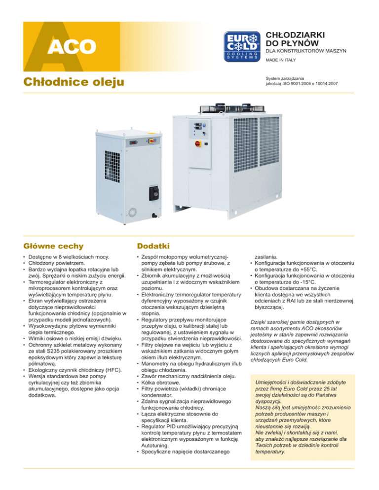 CHŁODZIARKI DO PŁYNÓW DLA KONSTRUKTORÓW MASZYN MADE IN ITALY Chłodnice oleju System zarządzania jakością ISO 9001:2008 e 10014:2007 Główne cechy Dodatki • Dostępne w 8 wielkościach mocy. • Chłodzony powietrzem. • Bardzo wydajna łopatka rotacyjna lub zwój. Sprężarki o niskim zużyciu energii. • Termoregulator elektroniczny z mikroprocesorem kontrolującym oraz wyświetlającym temperaturę płynu. • Ekran wyświetlający ostrzeżenia dotyczące nieprawidłowości funkcjonowania chłodnicy (opcjonalnie w przypadku modeli jednofazowych). • Wysokowydajne płytowe wymienniki ciepła termicznego. • Wirniki osiowe o niskiej emisji dźwięku. • Ochronny szkielet metalowy wykonany ze stali S235 polakierowany proszkiem epoksydowym który zapewnia teksturę półmatową. • Ekologiczny czynnik chłodniczy (HFC). • Wersja standardowa bez pompy cyrkulacyjnej czy też zbiornika akumulacyjnego, dostępne jako opcja dodatkowa. • Zespół motopompy wolumetrycznejpompy zębate lub pompy śrubowe, z silnikiem elektrycznym. • Zbiornik akumulacyjny z możliwością uzupełniania i z widocznym wskaźnikiem poziomu. • Elektroniczny termoregulator temperatury dyferencyjny wyposażony w czujnik otoczenia wskazującym dziesiętną stopnia. • Regulatory przepływu monitorujące przepływ oleju, o kalibracji stałej lub regulowanej, z ustawieniem sygnału w przypadku stwierdzenia nieprawidłowości. • Filtry olejowe na wejściu lub wyjściu z wskaźnikiem zatkania widocznym gołym okiem i/lub elektrycznym. • Manometry na obiegu hydraulicznym i/lub obiegu chłodzenia. • Zawór mechaniczny nadciśnienia oleju. • Kółka obrotowe. • Filtry powietrza (wkładki) chroniące kondensator. • Zdalna sygnalizacja nieprawidłowego funkcjonowania chłodnicy. • Łącza elektryczne stosownie do specyfikacji klienta. • Regulator PID umożliwiający precyzyjną kontrolę temperatury płynu z termostatem elektronicznym wyposażonym w funkcję Autotuning. • Specyficzne napięcie dostarczanego zasilania. • Konfiguracja funkcjonowania w otoczeniu o temperaturze do +55°C. • Konfiguracja funkcjonowania w otoczeniu o temperaturze do -15°C. • Obudowa dostarczana na życzenie klienta dostępna we wszystkich odcieniach z RAI lub ze stali nierdzewnej błyszczącej. Dzięki szerokiej gamie dostępnych w ramach asortymentu ACO akcesoriów jesteśmy w stanie zapewnić rozwiązania dostosowane do specyficznych wymagań klienta i spełniających określone wymogi licznych aplikacji przemysłowych zespołów chłodzących Euro Cold. Umiejętności i doświadczenie zdobyte przez firmę Euro Cold przez 25 lat swojej działalności są do Państwa dyspozycji. Naszą siłą jest umiejętnośc zrozumienia potrzeb producentów maszyn i urządzeń przemysłowych, które nieustannie się rozwiją. Nie zwlekaj i skontaktuj się z nami, aby znaleźć najlepsze rozwiązanie dla Twoich potrzeb w dziedinie kontroli temperatury. Chłodnice oleju Dane Techniczne ACO-LP MODEL Nominalna moc chłodzenia (*) W Zasilanie elektryczne 45 60 3460 5300 8150 230V / 1ph / 50Hz 400V / 3ph / 50Hz 400V / 3ph / 50Hz W 1200 1780 2380 Przepływ powietrza mc/h 1700 2700 4060 Max. pobór mocy W 130 260 Spreżarka (Max. pobór mocy) Wirnik 25 90 Spreżarka Chłodzony powietrzem skraplacz (miedź/aluminium) Parownik Łopatki lutospawane Elektroniczny termoregulator temperatury Pompa (**) Regulacja od +25 do +40°C Przepływ l/min 10 14 25 Spręż wentylatora bar 10 10 10 Pobór mocy W 607 780 840 14 23 65 Zbiornik termoplastyczny (pojemność nominalna) (**) I Gaz chłodniczy HFC Poziom hałasu (w odległości 1 m) R407C db (A) 55 Kolor obódowy 64 70 RAL 7035 Typ obódowy ECP1-B ECP2-B ECP3L-B Rysunki techniczne konstrukcji do pobrania w strefie DO POBRANIA na naszej stronie Wagi i wymiary Waga przeciętna (dla pustego zbiornika) kg 60 70 100 Waga przeciętna przy załadunku kg 65 80 110 Wymiary (Szer. x Gł. x Wys.) mm 450 x 462 x 985 562 x 512 x 1073 665 x 655 x 1180 Wymiary opakowania (Szer. x Gł. x Wys.) (***) mm 690 x 590 x 1150 755 x 630 x 1200 1000 x 800 x 1580 Uwagi (*) Wartości odniesienia: olej na wejściu +30°C, temperatura otoczenia +32°C (**) Opcjonalnie na życzenie klienta (***) Standardowe opakowanie: pudło kartonowe umieszczone na palecie Dane o mocy chłodzenia podawane w oparciu o wykresy ASHRAE dostarczone przez producenta sprężarek do chłodnic olejowych ISO VG 10-68 W przypadku chłodzenia różnego typu olejów prosimy o kontakt z naszym Działem Technicznym Maksymalna temperatura płynu na wejściu: +50°C Minimalna i maksymalna temperatura otoczenia: od +10 to +40°C W przypadku otoczenia o temperaturze przekraczającej +40°C, prosimy o kontakt z naszym Działem Technicznym Minimalna i maksymalna wilgotność względna otoczenia (bez skraplania): od 10 do 85% Maksymalna wysokość otoczenia: 2000 m Minimalna i maksymalna temperatura przechowywania: od +5 to +45°C Wszystkie jednostki miary przyjęte na rysunkach technicznych wyrażone zostały w milimetrach chyba że inaczej zaznaczono Przyłącza hydrauliczne: przedstawione na rysunkach technicznych, które można pobrać w strefie DO POBRANIA na naszej stronie EURO COLD zastrzega sobie prawo do wprowadzania zmian bez wcześniejszego uprzedzenia Chłodnice oleju Dane Techniczne ACO-MP MODEL 95 160 200 300 350 W 12440 20250 24880 32550 37920 W 4030 5210 6170 8190 12020 Przepływ powietrza mc/h 4060 4060 4060 8060 8060 Max. pobór mocy W 260 260 260 2 x 260 2 x 260 Nominalna moc chłodzenia (*) Zasilanie elektryczne Spreżarka (Max. pobór mocy) Wirnik 400V / 3ph / 50Hz Spreżarka Chłodzony powietrzem skraplacz (miedź/aluminium) Parownik Łopatki lutospawane Regulacja od +25 do +40°C Elektroniczny termoregulator temperatury Pompa (**) Przepływ l/min 25 44 75 75 150 Spręż wentylatora bar 10 10 10 10 10 Pobór mocy W 840 1960 2640 2640 4660 65 65 65 65 65 70 70 D3-2C D3-2C Zbiornik termoplastyczny (pojemność nominalna) (**) I 