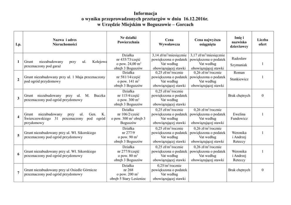 Informacja o wyniku przeprowadzonych przetargów w dniu 16.12.2016r. w Urzędzie Miejskim w Boguszowie – Gorcach Lp. 1 2 3 4 5 6 7 Nazwa i adres Nieruchomości Nr działki Powierzchnia Działka nr 435/73/część Grunt niezabudowany przy ul. Kolejowa o pow. 24,00 m2 przeznaczony pod garaż obręb 3 Boguszów Działka Grunt niezabudowany przy ul. 1 Maja przeznaczony nr 581/14/część pod ogród przydomowy o pow. 141 m2 obręb 3 Boguszów Działka Grunt niezabudowany przy ul. M. Buczka nr 115/4/część przeznaczony pod ogród przydomowy o pow. 300 m2 obręb 3 Boguszów Działka Grunt niezabudowany przy ul. Gen. K. nr 106/2/cześć Świerczewskiego 31 przeznaczony pod ogród o pow. 300 m2 obręb 3 przydomowy Boguszów Działka Grunt niezabudowany przy ul. Wł. Sikorskiego nr 277/9 przeznaczony pod ogród przydomowy o pow. 90 m2 obręb 3 Boguszów Działka Grunt niezabudowany przy ul. Wł. Sikorskiego nr 277/8/część przeznaczony pod ogród przydomowy o pow. 80 m2 obręb 3 Boguszów Działka Grunt niezabudowany przy ul Osiedle Górnicze nr 268 przeznaczony pod ogród przydomowy o pow. 200 m2 obręb 5 Stary Lesieniec Cena Wywoławcza Cena najwyższa osiągnięta 3,14 zł/m2/miesięcznie powiększona o podatek Vat według obowiązującej stawki 0,25 zł/m2/rocznie powiększona o podatek Vat według obowiązującej stawki 0,25 zł/m2/rocznie powiększona o podatek Vat według obowiązującej stawki 0,25 zł/m2/rocznie powiększona o podatek Vat według obowiązującej stawki 0,25 zł/m2/rocznie powiększona o podatek Vat według obowiązującej stawki 0,25 zł/m2/rocznie powiększona o podatek Vat według obowiązującej stawki 0,25/m2/rocznie powiększona o podatek Vat według obowiązującej stawki 3,17 zł/m2/miesięcznie powiększona o podatek Vat według obowiązującej stawki 0,26 zł/m2/rocznie powiększona o podatek Vat według obowiązującej stawki 0,26 zł/m2/rocznie powiększona o podatek Vat według obowiązującej stawki 0,26 zł/m2/rocznie powiększona o podatek Vat według obowiązującej stawki 0,26 zł/m2/rocznie powiększona o podatek Vat według obowiązującej stawki Imię i nazwisko dzierżawcy Liczba ofert Radosław Szymaniak 1 Roman Stankiewicz 1 Brak chętnych 0 Ewelina Fundowicz 1 Weronika i Andrzej Reteccy 1 Weronika i Andrzej Reteccy 1 Brak chętnych 0 8 9 Grunt niezabudowany przy ul. Górnej przeznaczony pod ogród przydomowy Grunt niezabudowany przy ul. Górnej przeznaczony pod ogród przydomowy Działka nr 248/25/część o pow. 37,5 m2 obręb 7 Kuźnice Świdnickie Działka nr 237/5/część o pow. 50 m2 obręb 7 Kuźnice Świdnickie 0,25 zł/m2/rocznie 0,26 zł/m2/rocznie powiększona o podatek powiększona o podatek Lech Bujalski Vat według Vat według obowiązującej stawki obowiązującej stawki 0,25 zł/m2/rocznie 0,26 zł/m2/rocznie powiększona o podatek powiększona o podatek Vat według Vat według obowiązującej stawki obowiązującej stawki Mariola Sadowa 1 1 Boguszów-Gorce, dnia 23 grudnia 2016r. Sporządzała: M. Siek Burmistrz Miasta Boguszowa-Gorc /-/ Waldemar Kujawa