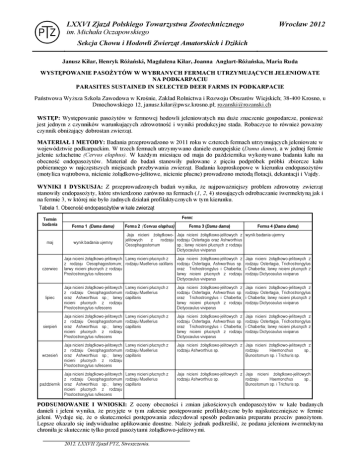 LXXVI Zjazd Polskiego Towarzystwa im. Michała Oczapowskiego Zootechnicznego Wrocław 2012 Sekcja Chowu i Hodowli Zwierząt Amatorskich i Dzikich Janusz Kilar, Henryk Różański, Magdalena Kilar, Joanna Anglart-Różańska, Maria Ruda WYSTĘPOWANIE PASOŻYTÓW W WYBRANYCH FERMACH UTRZYMUJĄCYCH JELENIOWATE NA PODKARPACIU PARASITES SUSTAINED IN SELECTED DEER FARMS IN PODKARPACIE Państwowa Wyższa Szkoła Zawodowa w Krośnie, Zakład Rolnictwa i Rozwoju Obszarów Wiejskich; 38-400 Krosno, u Dmochowskiego 12, [email protected]; [email protected] WSTĘP: Występowanie pasożytów w fermowej hodowli jeleniowatych ma duże znaczenie gospodarcze, ponieważ jest jednym z czynników warunkujących zdrowotność i wyniki produkcyjne stada. Robaczyce to również poważny czynnik obniżający dobrostan zwierząt. MATERIAŁ I METODY: Badania przeprowadzono w 2011 roku w czterech fermach utrzymujących jeleniowate w województwie podkarpackim. W trzech fermach utrzymywano daniele europejskie (Dama dama), a w jednej fermie jelenie szlachetne (Cervus elaphus). W każdym miesiącu od maja do października wykonywano badania kału na obecność endopasożytów. Materiał do badań stanowiły pulowane z pięciu podpróbek próbki zbiorcze kału pobieranego w najczęstszych miejscach przebywania zwierząt. Badania koproskopowe w kierunku endopasożytów (motylica wątrobowa, nicienie żołądkowo-jelitowe, nicienie płucne) prowadzono metodą flotacji, dekantacji i Vajdy. WYNIKI I DYSKUSJA: Z przeprowadzonych badań wynika, że najpoważniejszy problem zdrowotny zwierząt stanowiły endopasożyty, które stwierdzono zarówno na fermach (1, 2, 4) stosujących odrobaczanie iwermektyną jak i na fermie 3, w której nie było żadnych działań profilaktycznych w tym kierunku. Tabela 1. Obecność endopasożytów w kale zwierząt Termin badania maj FermD Ferma 1 (Dama dama) wynik badania ujemny Ferma 2 (Cen/us elaphus) Ferma 3 (Dama dama) Ferma 4 (Dama dama) Jaja nicieni żołądkowo- Jaja nicieni żołądkowo-jelitowych z wynik badania ujemny jelitowych z rodzaju rodzaju Ostertagia oraz Ashworthius Oesophagostomum sp.; larwy nicieni płucnych z rodzaju Dictyocaulus viviparus Jaja nicieni żołądkowo-jelitowych Larwy nicieni płucnych z z rodzaju Oesophagostomum; rodzaju Muellerius caillaris larwy nicieni płucnych z rodzaju Prostostrongylus rufescens Jaja nicieni żołądkowo-jelitowych z rodzaju Ostertagia, Ashworthius sp. oraz Trichostrongylus i Chabertia; larwy nicieni płucnych z rodzaju Dictyocaulus viviparus Jaja nicieni żołądkowo-jelitowych z rodzaju Ostertagia, Trichostrongylus i Chabertia; larwy nicieni płucnych z rodzaju Dictyocaulus viviparus lipiec Jaja nicieni żołądkowo-jelitowych Larwy nicieni płucnych z z rodzaju Oesophagostomum rodzaju Muellerius oraz Ashworthius sp.; larwy capillaris nicieni płucnych z rodzaju Prostostrongylus rufescens Jaja nicieni żołądkowo-jelitowych z rodzaju Ostertagia, Ashworthius sp. oraz Trichostrongylus i Chabertia; larwy nicieni płucnych z rodzaju Dictyocaulus viviparus Jaja nicieni żołądkowo-jelitowych z rodzaju Ostertagia, Trichostrongylus i Chabertia; larwy nicieni płucnych z rodzaju Dictyocaulus viviparus sierpień Jaja nicieni żołądkowo-jelitowych Larwy nicieni płucnych z z rodzaju Oesophagostomum rodzaju Muellerius oraz Ashworthius sp.; larwy capillaris nicieni płucnych z rodzaju Prostostrongylus rufescens Jaja nicieni żołądkowo-jelitowych z rodzaju Ostertagia, Ashworthius sp. oraz Trichostrongylus i Chabertia; larwy nicieni płucnych z rodzaju Dictyocaulus viviparus Jaja nicieni żołądkowo-jelitowych z rodzaju Ostertagia, Trichostrongylus i Chabertia; larwy nicieni płucnych z rodzaju Dictyocaulus viviparus wrzesień Jaja nicieni żołądkowo-jelitowych Larwy nicieni płucnych z z rodzaju Oesophagostomum rodzaju Muellerius oraz Ashworthius sp.; larwy capillaris nicieni płucnych z rodzaju Prostostrongylus rufescens Jaja nicieni żołądkowo-jelitowych z Jaja nicieni żołądkowo-jelitowych z rodzaju Haemonchus sp., rodzaju Ashworthius sp. Bunostomum sp. i Trichuris sp. październik Jaja nicieni żołądkowo-jelitowych Larwy nicieni płucnych z z rodzaju Oesophagostomum rodzaju Muellerius oraz Ashworthius sp.; larwy capillaris nicieni płucnych z rodzaju Prostostrongylus rufescens Jaja nicieni żołądkowo-jelitowych z Jaja nicieni żołądkowo-jelitowych rodzaju Ashworthius sp. rodzaju Haemonchus sp., Bunostomum sp. i Trichuris sp. czerwiec PODSUMOWANIE I WNIOSKI: Z oceny obecności i zmian jakościowych endopasożytów w kale badanych danieli i jeleni wynika, że przyjęte w tym zakresie postępowanie profilaktyczne było najskuteczniejsze w fermie jeleni. Wydaje się, że o skuteczności postępowania zdecydował sposób podawania preparatu przeciw pasożytom. Lepsze okazało się indywidualne aplikowanie doustne. Należy jednak podkreślić, że podana jeleniom iwermektyna chroniła je skutecznie tylko przed pasożytami żołądkowo-jelitowymi. 2012. LXXVII Zjazd PTZ, Streszczenia.