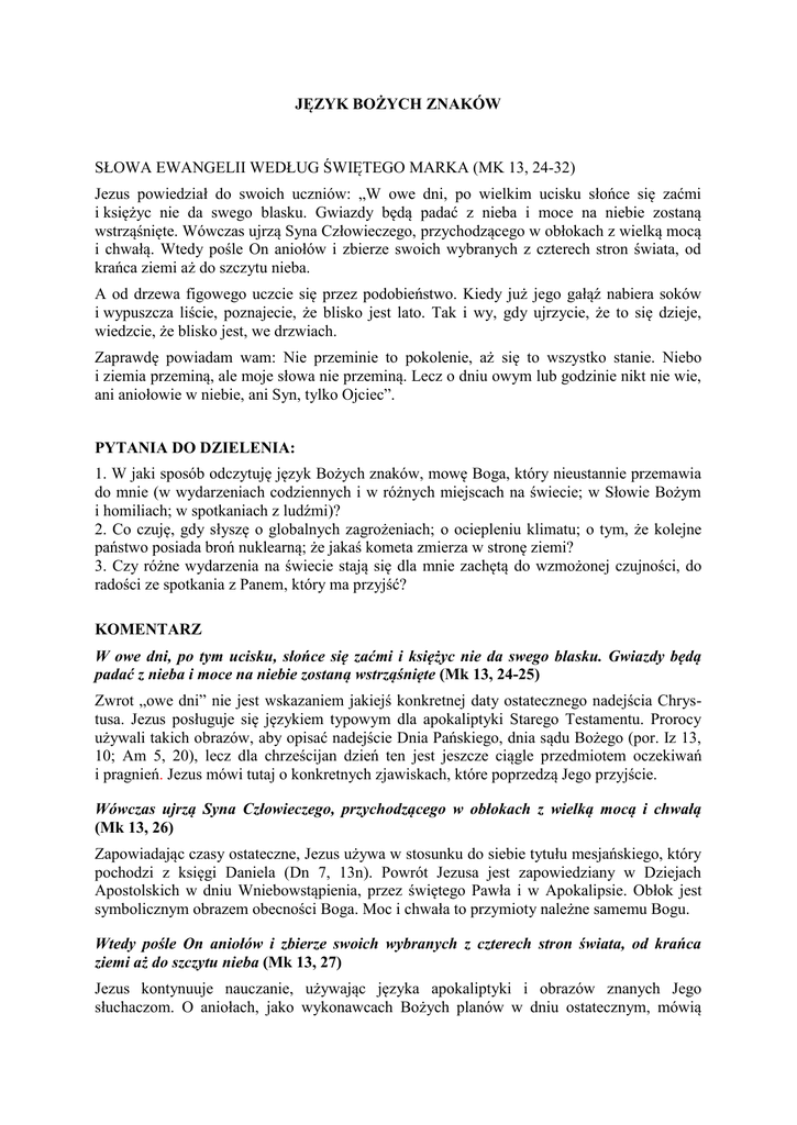 JĘZYK BOŻYCH ZNAKÓW SŁOWA EWANGELII WEDŁUG ŚWIĘTEGO MARKA (MK 13, 24-32) Jezus powiedział do swoich uczniów: „W owe dni, po wielkim ucisku słońce się zaćmi i księżyc nie da swego blasku. Gwiazdy będą padać z nieba i moce na niebie zostaną wstrząśnięte. Wówczas ujrzą Syna Człowieczego, przychodzącego w obłokach z wielką mocą i chwałą. Wtedy pośle On aniołów i zbierze swoich wybranych z czterech stron świata, od krańca ziemi aż do szczytu nieba. A od drzewa figowego uczcie się przez podobieństwo. Kiedy już jego gałąź nabiera soków i wypuszcza liście, poznajecie, że blisko jest lato. Tak i wy, gdy ujrzycie, że to się dzieje, wiedzcie, że blisko jest, we drzwiach. Zaprawdę powiadam wam: Nie przeminie to pokolenie, aż się to wszystko stanie. Niebo i ziemia przeminą, ale moje słowa nie przeminą. Lecz o dniu owym lub godzinie nikt nie wie, ani aniołowie w niebie, ani Syn, tylko Ojciec”. PYTANIA DO DZIELENIA: 1. W jaki sposób odczytuję język Bożych znaków, mowę Boga, który nieustannie przemawia do mnie (w wydarzeniach codziennych i w różnych miejscach na świecie; w Słowie Bożym i homiliach; w spotkaniach z ludźmi)? 2. Co czuję, gdy słyszę o globalnych zagrożeniach; o ociepleniu klimatu; o tym, że kolejne państwo posiada broń nuklearną; że jakaś kometa zmierza w stronę ziemi? 3. Czy różne wydarzenia na świecie stają się dla mnie zachętą do wzmożonej czujności, do radości ze spotkania z Panem, który ma przyjść? KOMENTARZ W owe dni, po tym ucisku, słońce się zaćmi i księżyc nie da swego blasku. Gwiazdy będą padać z nieba i moce na niebie zostaną wstrząśnięte (Mk 13, 24-25) Zwrot „owe dni” nie jest wskazaniem jakiejś konkretnej daty ostatecznego nadejścia Chrystusa. Jezus posługuje się językiem typowym dla apokaliptyki Starego Testamentu. Prorocy używali takich obrazów, aby opisać nadejście Dnia Pańskiego, dnia sądu Bożego (por. Iz 13, 10; Am 5, 20), lecz dla chrześcijan dzień ten jest jeszcze ciągle przedmiotem oczekiwań i pragnień. Jezus mówi tutaj o konkretnych zjawiskach, które poprzedzą Jego przyjście. Wówczas ujrzą Syna Człowieczego, przychodzącego w obłokach z wielką mocą i chwałą (Mk 13, 26) Zapowiadając czasy ostateczne, Jezus używa w stosunku do siebie tytułu mesjańskiego, który pochodzi z księgi Daniela (Dn 7, 13n). Powrót Jezusa jest zapowiedziany w Dziejach Apostolskich w dniu Wniebowstąpienia, przez świętego Pawła i w Apokalipsie. Obłok jest symbolicznym obrazem obecności Boga. Moc i chwała to przymioty należne samemu Bogu. Wtedy pośle On aniołów i zbierze swoich wybranych z czterech stron świata, od krańca ziemi aż do szczytu nieba (Mk 13, 27) Jezus kontynuuje nauczanie, używając języka apokaliptyki i obrazów znanych Jego słuchaczom. O aniołach, jako wykonawcach Bożych planów w dniu ostatecznym, mówią także św. Mateusz i św. Łukasz. Wybrani są to chrześcijanie trwający w wierności. Jest tu wyraźne nawiązanie do faktu, że Kościół jest kontynuatorem Narodu Wybranego, bowiem to do niego odnosiło się słowo „wybrani” w Starym Testamencie. Zgromadzenie się wierzących w Jezusa było przedmiotem oczekiwań Kościoła. A od drzewa figowego uczcie się przez podobieństwo! Kiedy już jego gałąź nabiera soków i wypuszcza liście, poznajecie, że blisko jest lato (Mk 13, 28) Odwoływanie się do doskonale znanych przykładów, to cecha przypowieści, które poprzez proste obrazy chcą nam przybliżyć ważne prawdy teologiczne. Pojawienie się zielonych liści na figowcu zwiastuje lato. W podobnie jednoznaczny sposób uczniowie Chrystusa mają umieć odczytywać sens wydarzeń, które u większości ludzi budzą lęk. Drzewa figowe wydające zawiązki owoców są znakiem wzywającym Oblubienicę – Kościół, na spotkanie z Oblubieńcem – Chrystusem (por. Pnp 2, 13). Nie lęk, ale tęsknota pełna miłości winna towarzyszyć oczekiwaniu na ostateczne przyjście Chrystusa. Tak i wy, gdy ujrzycie, że to się dzieje, wiedzcie, że blisko jest, we drzwiach (Mk 13, 29) Poczucie obecności Zbawiciela winno nieustannie towarzyszyć wierzącym. Jednak to ostateczne przyjście Chrystusa będzie miało także inny, pełniejszy wymiar. Wyzwoli ono bowiem chrześcijan z tęsknoty, oczekiwania i wzdychania, a przyniesie ostateczną radość i poznanie Boga. Taki też jest sens słów Apokalipsy „oto stoję u drzwi i kołaczę” (Ap 3, 20) i pouczeń Jakuba Apostoła „Tak i wy bądźcie cierpliwi i umacniajcie serca wasze, bo przyjście Pana jest już bliskie” (Jk 5, 8n). Tekst świętego Łukasza wskazuje na właściwą postawę chrześcijan w obliczu tych wydarzeń: „A gdy to się dziać zacznie, nabierzcie ducha i podnieście głowy, ponieważ zbliżą się wasze odkupienie” (Łk 21, 28). Zaprawdę, powiadam wam: Nie przeminie to pokolenie, aż się to wszystko stanie (Mk 13, 30) „To wszystko” może odnosić się do następujących wydarzeń: zburzenie Jerozolimy, prześladowanie uczniów, które rozpoczęło się już w czasach apostolskich oraz licznych katastrof, które Kościół przeżywał na przestrzeni wieków. Czas trwania jednego pokolenia w Izraelu liczono na ok. 40 lat. Słowa Jezusa możemy więc odczytywać zarówno w odniesieniu do zburzenia świątyni Jerozolimskiej, bowiem pomiędzy nauczaniem Jezusa około 30 roku, a zburzeniem Jerozolimy w 70 roku minęło jedno pokolenie, jak też w odniesieniu do każdego pokolenia, które musi się nauczyć odczytywać znaki czasu, doświadczając różnorakich kryzysów i prześladowań. Niebo i ziemia przeminą, ale słowa moje nie przeminą (Mk 13, 31) Niebo i ziemia były dla Żydów znakiem niezmienności i trwałości. To przekonanie było tak powszechne i codzienne, że niebo i ziemia stały się przedmiotem uwiarygodniającym ludzkie przysięgi. Stąd słowa Jezusa, aby nie przysięgać ani na niebo ani na ziemię, bo jest Kt