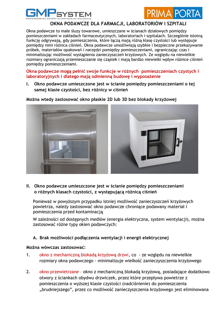 OKNA PODAWCZE DLA FARMACJI, LABORATORIÓW I SZPITALI Okna podawcze to małe śluzy towarowe, umieszczane w ścianach działowych pomiędzy pomieszczeniami w zakładach farmaceutycznych, laboratoriach i szpitalach. Szczególnie istotną funkcję odgrywają, gdy pomieszczenia, które łączą mają różną klasę czystości lub występuje pomiędzy nimi różnica ciśnień. Okna podawcze umożliwiają szybkie i bezpieczne przekazywanie próbek, materiałów opakowań i narzędzi pomiędzy pomieszczeniami, ograniczając czas i minimalizując możliwość wystąpienia zanieczyszczeń krzyżowych. Ze względu na niewielkie rozmiary ograniczają przemieszczanie się cząstek i mają bardzo niewielki wpływ różnice ciśnień pomiędzy pomieszczeniami. Okna podawcze mogą pełnić swoje funkcje w różnych pomieszczeniach czystych i laboratoryjnych i dlatego mają odmienną budowę i wyposażenie I. Okno podawcze umieszczone jest w ścianie pomiędzy pomieszczeniami o tej samej klasie czystości, bez różnicy w ciśnień Można wtedy zastosować okno płaskie 2D lub 3D bez blokady krzyżowej II. Okno podawcze umieszczone jest w ścianie pomiędzy pomieszczeniami o różnych klasach czystości, z występującą różnicą ciśnień Ponieważ w powyższym przypadku istniej możliwość zanieczyszczeń krzyżowych powietrza, należy zastosować okno podawcze chroniące podawany materiał i pomieszczenia przed kontaminacją W zależności od dostępnych mediów (energia elektryczna, system wentylacji), można zastosować różne typy okien podawczych: A. Brak możliwości podłączenia wentylacji i energii elektrycznej Można wówczas zastosować: 1. okno z mechaniczną blokadą krzyżową drzwi, co - ze względu na niewielkie rozmiary okna podawczego - minimalizuje wielkość zanieczyszczenia krzyżowego 2. okno przewietrzane – okno z mechaniczną blokadą krzyżową, posiadające dodatkowo otwory z ściankach obydwu drzwiczek, przez które przepływa powietrze z pomieszczenia o wyższej klasie czystości (nadciśnienie) do pomieszczenia „brudniejszego”, przez co możliwość zanieczyszczenia krzyżowego jest eliminowana 3. okno wentylowane - jeżeli jest możliwość dostarczenia do okna podawczego czystego, przefiltrowanego powietrza z systemu wentylacji, stosuje się okno podawcze wentylowane, najlepiej z filtrem HEPA; skutecznie eliminuje zanieczyszczenia krzyżowe powietrza, możliwe jest też zwalidowanie działania systemu regeneracji powietrza; blokada krzyżowa mechaniczna lub elektroniczna (umożliwia regulację czasu regeneracji powietrza) B. nie ma dostępu do powietrza filtrowanego z systemu wentylacji, natomiast jest możliwość podłączenia urządzenia do energii elektrycznej Można wówczas zastosować dwa rozwiązania: 1. okno podawcze z lampą bakteriobójczą UV, efektywnie sterylizującą powietrze i podawany materiał 2. okno podawcze z filtrem HEPA i własnym wentylatorem, pobierające powietrze z pomieszczenia o wyższej klasie czystości, filtrujące je i nawiewające do komory okna podawczego, a następnie usuwane do pomieszczenia o niższej klasie czystości. Rozwiązanie to jest jednak ponad 2-krotnie droższe od okna przewietrzanego lub z lampą UV. OKNA PODAWCZE GMP PRIMA SL Opis konstrukcji Konstrukcja spawana z blachy aluminiowej lakierowanej na kolor RAL 9010 → Dno komory wewnętrznej wyłożone blachą ze stali kwasoodpornej 304L → Zawiasy, gałka i mechanizm blokady krzyżowej ze stali 304L → Dwie pary drzwi przeszklonych szkłem bezpiecznym, → Obustronne zlicowanie okien i drzwi z powierzchnią okna podawczego → Uszczelnienie drzwi uszczelką EPDM, przyklejoną na spodzie wrębu → Blokada krzyżowa mechaniczna → Montaż na ściance działowej do systemowych kształtowników Opcje dodatkowe → Korpus zewnętrzny aluminiowy lakierowany na kolor z palety RAL → Blokada krzyżowa elektroniczna z regulacją i sygnalizacją → System wentylowania, w tym z nawiewnikiem i filtrem HEPA → Wyposażenie w lampę UV z licznikiem czasu pracy Typowe wymiary w mm Wymiary wewnętrzne Wymiary zewnętrzne Szer Wys Głęb Szer Wys Głęb 460 600 460 600 500 450 600 600 600 600 760 760 600 760 760 600 550 700 → Charakterystyka → pełna zgodność z wymogami GMP, GLP HACCP – gładkie, łatwe do utrzymania w czystości, obustronnie zlicowane powierzchnie → możliwość montażu w ścianach murowych, betonowych, gipsowo-kartonowych i płytach warstwowych systemowych rożnej grubości → System mocowania okna podawczego zarowno zlicowanego z jedną lub dwiema ścianami, jak i umieszczonego symetrycznie z obu stron przegrody → Duża szczelność dzięki odpowiednim uszczelkom i precyzji wykonania → Pełna gama wymiarow i rodzajow wyposażenia → System blokady krzyżowej mechanicznej i elektromagnetycznej – zlicowany z powierzchnią drzwi