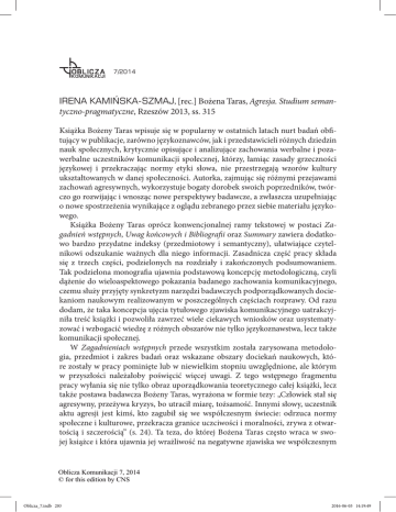 7/2014 IRENA KAMIŃSKA-SZMAJ, [rec.] Bożena Taras, Agresja. Studium semantyczno-pragmatyczne, Rzeszów 2013, ss. 315 Książka Bożeny Taras wpisuje się w popularny w ostatnich latach nurt badań obfitujący w publikacje, zarówno językoznawców, jak i przedstawicieli różnych dziedzin nauk społecznych, krytycznie opisujące i analizujące zachowania werbalne i pozawerbalne uczestników komunikacji społecznej, którzy, łamiąc zasady grzeczności językowej i przekraczając normy etyki słowa, nie przestrzegają wzorów kultury ukształtowanych w danej społeczności. Autorka, zajmując się różnymi przejawami zachowań agresywnych, wykorzystuje bogaty dorobek swoich poprzedników, twórczo go rozwijając i wnosząc nowe perspektywy badawcze, a zwłaszcza uzupełniając o nowe spostrzeżenia wynikające z oglądu zebranego przez siebie materiału językowego. Książka Bożeny Taras oprócz konwencjonalnej ramy tekstowej w postaci Zagadnień wstępnych, Uwag końcowych i Bibliografii oraz Summary zawiera dodatkowo bardzo przydatne indeksy (przedmiotowy i semantyczny), ułatwiające czytelnikowi odszukanie ważnych dla niego informacji. Zasadnicza część pracy składa się z trzech części, podzielonych na rozdziały i zakończonych podsumowaniem. Tak podzielona monografia ujawnia podstawową koncepcję metodologiczną, czyli dążenie do wieloaspektowego pokazania badanego zachowania komunikacyjnego, czemu służy przyjęty synkretyzm narzędzi badawczych podporządkowanych dociekaniom naukowym realizowanym w poszczególnych częściach rozprawy. Od razu dodam, że taka koncepcja ujęcia tytułowego zjawiska komunikacyjnego uatrakcyjniła treść książki i pozwoliła zawrzeć wiele ciekawych wniosków oraz usystematyzować i wzbogacić wiedzę z różnych obszarów nie tylko językoznawstwa, lecz także komunikacji społecznej. W Zagadnieniach wstępnych przede wszystkim została zarysowana metodologia, przedmiot i zakres badań oraz wskazane obszary dociekań naukowych, które zostały w pracy pominięte lub w niewielkim stopniu uwzględnione, ale którym w przyszłości należałoby poświęcić więcej uwagi. Z tego wstępnego fragmentu pracy wyłania się nie tylko obraz uporządkowania teoretycznego całej książki, lecz także postawa badawcza Bożeny Taras, wyrażona w formie tezy: „Człowiek stał się agresywny, przeżywa kryzys, bo utracił miarę, tożsamość. Innymi słowy, uczestnik aktu agresji jest kimś, kto zagubił się we współczesnym świecie: odrzuca normy społeczne i kulturowe, przekracza granice uczciwości i moralności, zrywa z otwartością i szczerością” (s. 24). Ta teza, do której Bożena Taras często wraca w swojej książce i która ujawnia jej wrażliwość na negatywne zjawiska we współczesnym Oblicza Komunikacji 7, 2014 © for this edition by CNS Oblicza_7.indb 203 2016-06-03 14:19:49 204 RECENZJE I OMÓWIENIA świecie, może jednak budzić pewne zastrzeżenia ze względu na ograniczoną diagnozę zachowań agresywnych, obecnych przecież nie tylko we współczesnym życiu społecznym i na które ma wpływ wiele innych czynników. Ponadto we wstępnych zagadnieniach w pierwszym podrozdziale Bożena Taras bardzo skrótowo i wybiórczo zwraca uwagę na uwarunkowania zachowań agresywnych, przesuwając punkt ciężkości na współczesne przejawy przemocy fizycznej w postaci nieustających konfliktów zbrojnych i aktów terrorystycznych, zaledwie wspominając o zmieniającym się świecie wartości, o przyzwoleniu na akty agresji w życiu rodzinnym i towarzyskim itp. Jest to raczej szkic wprowadzający w problematykę badań, a nie poważne naukowe rozpoznanie zjawiska agresji wraz ze wskazaniem jego różnorodnych uwarunkowań. Jednak, na szczęście, pogłębione rozważania na ten temat Bożena Taras zawarła w części pierwszej monografii, w której znalazła się charakterystyka psychologiczno-socjologiczna zachowań agresywnych oraz przegląd prac językoznawczych poświęconych agresji wraz ze szczegółową analizą uwarunkowań komunikacyjnych oraz form i wykładników agresji językowej. Ta część książki zawiera krytyczne omówienie dorobku poprzedników, a przede wszystkim jest dobrym wprowadzeniem teoretycznym do dwóch kolejnych części empirycznych. Druga część pracy poświęcona jest rozważaniom semantycznym, których zwieńczenie stanowi eksplikacja wyrażenia agresja, w której zostaje wykorzystana rama afektywna czuję oraz rama wolicjonalna chcę spowodować. Zaproponowana eksplikacja prowokuje do dyskusji i zapewne wywoła ją w środowisku językoznawców (moją wątpliwość budzą dwa człony eksplikacji: czują się dobrze z tego powodu; wiedzą, że są to złe rzeczy). Do ważnych osiągnięć przeprowadzonych analiz zebranego materiału językowego zaliczyłabym ustalenie cech konotacyjnych leksemu agresja, umiejscowienie jego znaczeń w kontekście pragmatyczno-komunikacyjnym i pokazanie poszerzenia zakresu użycia we współczesnej polszczyźnie. Semantyczne dociekania wzbogacają badania ankietowe, które zostały wykorzystane do pokazania różnic w konceptualizacji pojęcia agresja przez współczesnych użytkowników języka. Niedosyt budzi fakt, że do badań ankietowych wybrano jedynie studentów, uczniów i więźniów, co nie pozwoliło w pełni uchwycić zróżnicowania w pojmowaniu i aksjologizacji badanego pojęcia oraz zarysowujących się w ostatnich latach zmian nacechowania emocjonalnego tego leksemu, na które niewątpliwie ma wpływ wiele innych parametrów socjologicznych (Bożena Taras zdaje sobie sprawę z ograniczoności zebranego materiału ankietowego, pisząc na s. 152–153 o potrzebie uwzględnienia w badaniach innych grup zawodowych). Duże uznanie budzi ostatnia część pracy ze względu na wielość poruszanych problemów, szeroką perspektywę badawczą oraz niezwykle bogaty materiał językowy ilustrujący tezy autorki. Pragmalingwistyczna perspektywa analizy