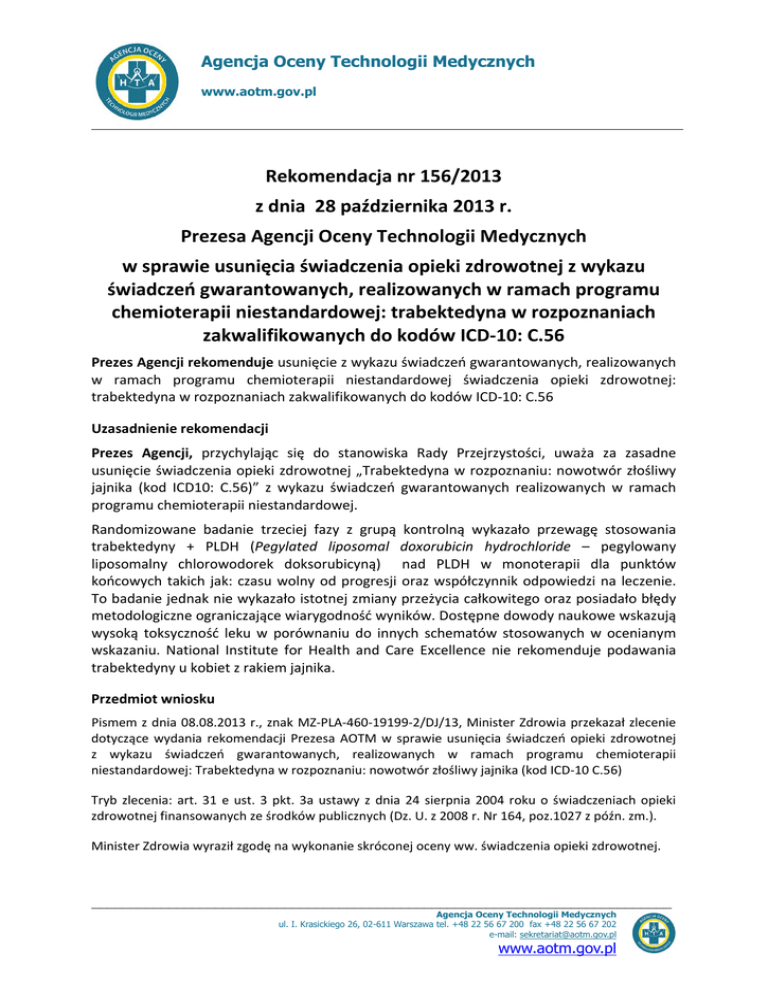 Agencja Oceny Technologii Medycznych www.aotm.gov.pl Rekomendacja nr 156/2013 z dnia 28 października 2013 r. Prezesa Agencji Oceny Technologii Medycznych w sprawie usunięcia świadczenia opieki zdrowotnej z wykazu świadczeń gwarantowanych, realizowanych w ramach programu chemioterapii niestandardowej: trabektedyna w rozpoznaniach zakwalifikowanych do kodów ICD-10: C.56 Prezes Agencji rekomenduje usunięcie z wykazu świadczeń gwarantowanych, realizowanych w ramach programu chemioterapii niestandardowej świadczenia opieki zdrowotnej: trabektedyna w rozpoznaniach zakwalifikowanych do kodów ICD-10: C.56 Uzasadnienie rekomendacji Prezes Agencji, przychylając się do stanowiska Rady Przejrzystości, uważa za zasadne usunięcie świadczenia opieki zdrowotnej „Trabektedyna w rozpoznaniu: nowotwór złośliwy jajnika (kod ICD10: C.56)” z wykazu świadczeń gwarantowanych realizowanych w ramach programu chemioterapii niestandardowej. Randomizowane badanie trzeciej fazy z grupą kontrolną wykazało przewagę stosowania trabektedyny + PLDH (Pegylated liposomal doxorubicin hydrochloride – pegylowany liposomalny chlorowodorek doksorubicyną) nad PLDH w monoterapii dla punktów końcowych takich jak: czasu wolny od progresji oraz współczynnik odpowiedzi na leczenie. To badanie jednak nie wykazało istotnej zmiany przeżycia całkowitego oraz posiadało błędy metodologiczne ograniczające wiarygodność wyników. Dostępne dowody naukowe wskazują wysoką toksyczność leku w porównaniu do innych schematów stosowanych w ocenianym wskazaniu. National Institute for Health and Care Excellence nie rekomenduje podawania trabektedyny u kobiet z rakiem jajnika. Przedmiot wniosku Pismem z dnia 08.08.2013 r., znak MZ-PLA-460-19199-2/DJ/13, Minister Zdrowia przekazał zlecenie dotyczące wydania rekomendacji Prezesa AOTM w sprawie usunięcia świadczeń opieki zdrowotnej z wykazu świadczeń gwarantowanych, realizowanych w ramach programu chemioterapii niestandardowej: Trabektedyna w rozpoznaniu: nowotwór złośliwy jajnika (kod ICD-10 C.56) Tryb zlecenia: art. 31 e ust. 3 pkt. 3a ustawy z dnia 24 sierpnia 2004 roku o świadczeniach opieki zdrowotnej finansowanych ze środków publicznych (Dz. U. z 2008 r. Nr 164, poz.1027 z późn. zm.). Minister Zdrowia wyraził zgodę na wykonanie skróconej oceny ww. świadczenia opieki zdrowotnej. ___________________________________________________________________________ Agencja Oceny Technologii Medycznych ul. I. Krasickiego 26, 02-611 Warszawa tel. +48 22 56 67 200 fax +48 22 56 67 202 e-mail: [email protected] www.aotm.gov.pl Rekomendacja nr 156/2013 Prezesa AOTM z dnia 21 października 2013 r. Problem zdrowotny W 2010 roku na raka jajnika zachorowało 3587 osób. Ponad 95% nowotworów złośliwych jajnika ma pochodzenie nabłonkowe (rak). Do najważniejszych czynników ryzyka występowania raka jajnika należą: • zespoły dziedzicznego raka jajnika i piersi oraz dziedzicznego raka jajnika; • nosicielstwo mutacji genów BRCA1 i BRCA2 (dotyczy do 13% wszystkich przypadków raka jajnika); • rodzinne występowanie dziedzicznego niepolipowatego raka jelita grubego (zespół Lyncha) • wczesny niepolipowaty rak jelita grubego, rak endometrium, rak górnego odcinka układu pokarmowego, rak urotelialny moczowodu); • bezdzietność, nieskuteczne stymulacje owulacji. W raku jajnika nie ma objawów patognomonicznych, ale u większości chorych ponad rok przed rozpoznaniem nowotworu występują niespecyficzne objawy dyspeptyczne. U części chorych jajniki mogą być prawidłowej wielkości lub jedynie nieznacznie powiększone, mimo rozsiewu raka w jamie brzusznej. Zastosowanie w leczeniu chorych na raka jajnika we wszystkich fazach tej choroby ma chemioterapia. Celem terapii jest głównie łagodzenie objawów choroby i wydłużenie czasu do nawrotu czy progresji, a bardzo rzadko wydłużenie czasu przeżycia. U chorych platyno-wrażliwych w dobrym stanie ogólnym, wydolnych hematologicznie, należy rozważyć chemioterapię dwulekową. Opis wnioskowanego świadczenia Trabektedyna wiąże się z dużym rowkiem DNA zginając helisę do głównego rowka. Takie wiązanie z DNA uwalnia kaskadę zdarzeń wpływających na szereg czynników transkrypcyjnych, białka wiążące DNA i ścieżki naprawy DNA powodując zaburzenia cyklu komórkowego. Wykazano antyproliferacyjne działanie trabektedyny in vitro i in vivo wobec szeregu ludzkich linii komórek raka i guzów doświadczalnych, w tym złośliwych takich jak mięsaki, rak piersi, niedrobnokomórkowy rak płuc, rak jajnika i czerniak złośliwy. W leczeniu mięsaka tkanek miękkich zalecana dawka wynosi 1,5 mg/m2 pc. podawana we wlewie dożylnym trwającym 24 godziny, z trzytygodniową przerwą pomiędzy cyklami. Zdecydowanie zaleca się podawanie leku przez cewnik założony do żyły centralnej. Wszystkim pacjentom należy podać kortykosteroidy w celu profilaktyki przeciwwymiotnej, ale również w związku z ochronnym działaniem tego leku na wątrobę. W razie potrzeby można podać dodatkowe leki przeciwwymiotne. Alternatywna technologia medyczna Według opinii ekspertów komparatorami dla trabektedyny we wskazaniu ICD-10 C59 są pochodne platyny (karboplatyna, cisplatyna) i topotekan stosowane w monoterapii albo razem z innym lekiem (PLD, paklitaksel, cyklofosfamid, gemcytabina). Skuteczność kliniczna Odnaleziono jedno randomizowane kontrolowane badanie kliniczne trzeciej fazy dotyczące podawania trabektedyny OVA-301. Badanie to zostało włączone do przeglądu systematycznego BMJTechnology Assessment Group. Metaanaliza badan dotyczących terapii lekami będącymi pochodnymi platyny wykazała, że stosowanie zarówno PLDH w monoterapii jak i trabektedyny + PLDH wiąże się ze znacznym wydłużeniem przeżycia całkowitego w porównaniu do topotekanu w monoterapii. Trabektedyna stosowana razem z PLDH wykazała się również statystycznie istotną poprawą czasu wolnego od progresji w por