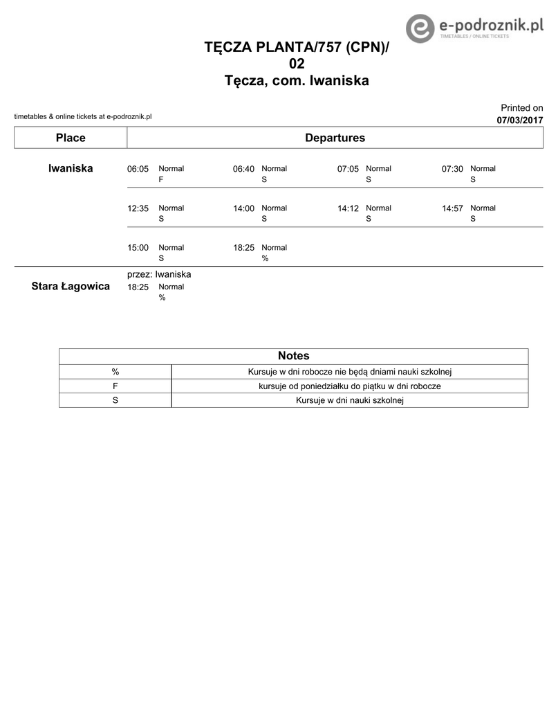 TĘCZA PLANTA/757 (CPN)/ 02 Tęcza, com. Iwaniska Printed on 07/03/2017 timetables & online tickets at e-podroznik.pl Place Departures Iwaniska 06:05 12:35 15:00 Normal F 06:40 Normal Normal S 14:00 Normal Normal S 18:25 Normal 07:05 Normal S 07:30 Normal S 14:12 Normal S S 14:57 Normal S % przez: Iwaniska Stara Łagowica 18:25 Normal % Notes % Kursuje w dni robocze nie będą dniami nauki szkolnej F kursuje od poniedziałku do piątku w dni robocze S Kursuje w dni nauki szkolnej S