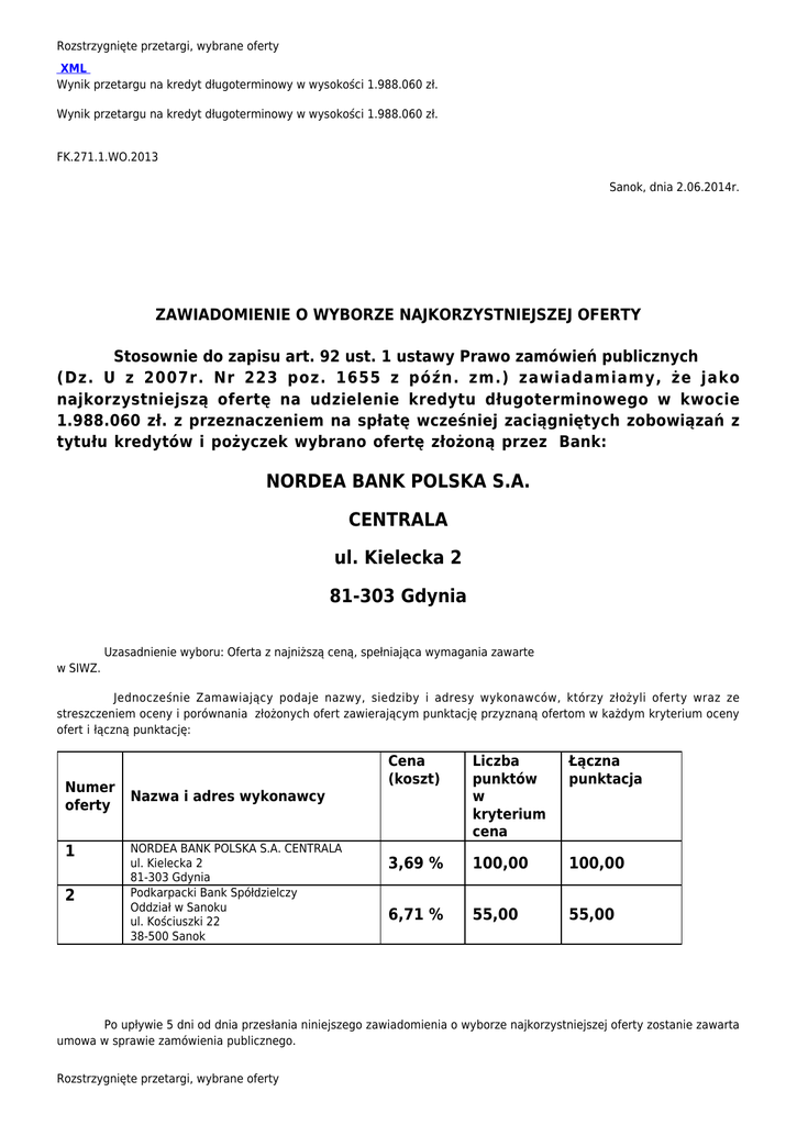 Rozstrzygnięte przetargi, wybrane oferty XML Wynik przetargu na kredyt długoterminowy w wysokości 1.988.060 zł. Wynik przetargu na kredyt długoterminowy w wysokości 1.988.060 zł. FK.271.1.WO.2013 Sanok, dnia 2.06.2014r. ZAWIADOMIENIE O WYBORZE NAJKORZYSTNIEJSZEJ OFERTY Stosownie do zapisu art. 92 ust. 1 ustawy Prawo zamówień publicznych (Dz. U z 2007r. Nr 223 poz. 1655 z późn. zm.) zawiadamiamy, że jako najkorzystniejszą ofertę na udzielenie kredytu długoterminowego w kwocie 1.988.060 zł. z przeznaczeniem na spłatę wcześniej zaciągniętych zobowiązań z tytułu kredytów i pożyczek wybrano ofertę złożoną przez Bank: NORDEA BANK POLSKA S.A. CENTRALA ul. Kielecka 2 81-303 Gdynia Uzasadnienie wyboru: Oferta z najniższą ceną, spełniająca wymagania zawarte w SIWZ. Jednocześnie Zamawiający podaje nazwy, siedziby i adresy wykonawców, którzy złożyli oferty wraz ze streszczeniem oceny i porównania złożonych ofert zawierającym punktację przyznaną ofertom w każdym kryterium oceny ofert i łączną punktację: Numer oferty 1 2 Cena (koszt) Liczba punktów w kryterium cena Łączna punktacja 3,69 % 100,00 100,00 6,71 % 55,00 55,00 Nazwa i adres wykonawcy NORDEA BANK POLSKA S.A. CENTRALA ul. Kielecka 2 81-303 Gdynia Podkarpacki Bank Spółdzielczy Oddział w Sanoku ul. Kościuszki 22 38-500 Sanok Po upływie 5 dni od dnia przesłania niniejszego zawiadomienia o wyborze najkorzystniejszej oferty zostanie zawarta umowa w sprawie zamówienia publicznego. Rozstrzygnięte przetargi, wybrane oferty Rozstrzygnięte przetargi, wybrane oferty Podmiot publikujący Urząd Miasta w Sanoku Wytworzył Publikujący 2014-06-02 - Rozstrzygnięte przetargi, wybrane oferty