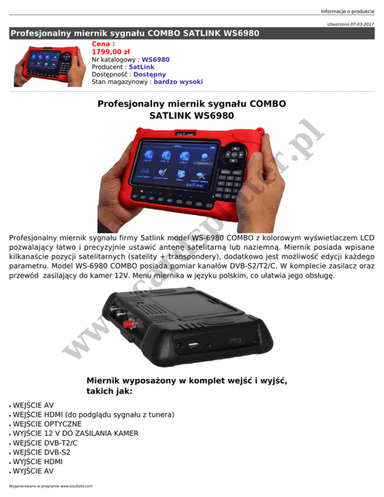 Informacje o produkcie Utworzono 07-03-2017 Profesjonalny miernik sygnału COMBO SATLINK WS6980 Cena : 1799,00 zł Nr katalogowy : WS6980 Producent : SatLink Dostępność : Dostępny Stan magazynowy : bardzo wysoki sp lit te r .p l Profesjonalny miernik sygnału COMBO SATLINK WS6980 w w w .c ar d Profesjonalny miernik sygnału firmy Satlink model WS-6980 COMBO z kolorowym wyświetlaczem LCD pozwalający łatwo i precyzyjnie ustawić antenę satelitarną lub naziemną. Miernik posiada wpisane kilkanaście pozycji satelitarnych (satelity + transpondery), dodatkowo jest możliwość edycji każdego parametru. Model WS-6980 COMBO posiada pomiar kanałów DVB-S2/T2/C. W komplecie zasilacz oraz przewód zasilający do kamer 12V. Menu miernika w języku polskim, co ułatwia jego obsługę. Miernik wyposażony w komplet wejść i wyjść, takich jak: ● ● ● ● ● ● ● ● WEJŚCIE AV WEJŚCIE HDMI (do podglądu sygnału z tunera) WEJŚCIE OPTYCZNE WYJŚCIE 12 V DO ZASILANIA KAMER WEJŚCIE DVB-T2/C WEJŚCIE DVB-S2 WYJŚCIE HDMI WYJŚCIE AV Wygenerowano w programie www.oscGold.com ● ● ● sp lit te r .p l ● PORT USB WEJŚCIE NA ZASILACZ LATARKA GŁOŚNIKI w .c ar d MIERNIK WS6980 UMOŻLIWIA POMIAR WIDMA ORAZ KONSTELACJI DLA DVB-S2/T2/C w w WYŚWIETLANIE PARAMETRÓW SYGNAŁU JEST BARDZO CZYTELNE Specyfikacja: ● ● ● ● ● ● miernik DVB-S2 DVB-T2 DVB-C HD Mpeg4 combo wskazanie siły i jakości sygnału procentowe wskazanie jakości sygnału sygnał dźwiękowy znalezienia satelity (możliwość wyłączenia) bateria LI-ION (7,4V 3000mAh) możliwość edycji satelity, transpondera, częstotliwości Informacje o produkcie ● ● obsługa DiSEqC: 1.0, 1.1, 1.2 oraz 22 kHz możliwość zaktualizowania oprogramowania poprzez złącze USB łatwy w przenoszeniu ● ● ● ● ● ● ● ● ● ● ● ● ● ● ● ● ● ● ● ● ● ● ● ● ● ● ● ● ● ar d ● w .c ● Standards: DVB-S2/S, DVB-T/T2 DVB-C Connector Type F Type Input Frequency 950 to 2150 MHz Signal Input Level - 65 to -25 dBm Band Switch Control 22KHz LNB Supply 13V/18V, IMax 400mA Demodulation Type QPSK, 8PSK, 16APSK Symbol Rate 2 Connector Type FEMALE Type Input Frequency 48 to 862 MHz Signal Input Level -79.5dBm (MAX) ANT Supply 5V, 12V/17V Imax 100mA Demodulation Type QPSK, 16QAM.64QAM, 256QAM LCD Type TFT TRANSMISSIVE Number of Dots 480(RGB) x272 Activearea (WxH) 95.04x53.86 mm2 Connector Type 3.5 mm jack Video Output CVBS, Audio output Stereo Audio L/R output HDMI output connecter Format HDMI 1.3a Connector Type 3.5 mm jack Video input CVBS, Audio input Stereo Audio L/R input Video decompression MPEG-2 MP@HL, MPEG-1 Decoding, MPEG-4 ASP@L5 HD resolution, H.264 MP&HP@L4, HW JPEG decoding Resolving rate PAL-25 frame@720*576, NTSC-30 frame@720*480, Signal compatibility Support conversion for different video formats Video Format 4:3, 16:9, By Pan & Scan and Letter Box conversion Audio decompression MPEG-1 Layer I/II, MPEG-2 Layer I/II, Audio output mode Stereo, Mono,R/L Connector USB Data protocol USB2.0 interface w w ● sp lit te r Product Description: .p l ● Wygenerowano w programie www.oscGold.com ● ● ● ● .p l ● sp lit te r ● ar d ● File management system NTFS, FAT32, FAT16 File format wma, mp3, mp4, avi, jpg, jpeg, bmp, img Microprocessor NOVATEK Clock Frequency 500MHz SDRAM Memory 1Gbit DDR3 Li-Ion Battery 7.4V/3000mAh (The machine behind labeling shall prevail) Adapter OUTPUT: DC12V/1.5A, INTUPT: 100-240VAC 50/60Hz(Will be subject to actual configuration) Power consumption Max. 10W Size (W x D x H) 9.5x15.5x4.5 (cm3) w .c ● w w ●