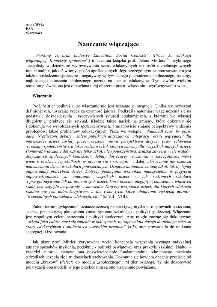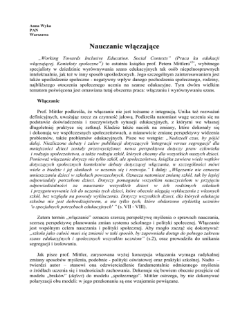 Anna Wyka PAN Warszawa Nauczanie włączające „Working Towards Inclusive Education. Social Contexts” (Praca ku edukacji włączającej. Konteksty społeczne∗1) to ostatnia książka prof. Petera Mittlera∗2∗, wybitnego specjalisty w dziedzinie wyrównywania szans edukacyjnych tak osób niepełnosprawnych intelektualnie, jak też w inny sposób upośledzonych. Jego szczególnym zainteresowaniem jest także upośledzenie społeczne - negatywny wpływ danego pochodzenia społecznego, rodziny, najbliższego otoczenia społecznego ucznia na szanse edukacyjne. Tym dwóm wielkim tematom poświęcona jest omawiana tutaj obszerna praca: włączaniu i wyrównywaniu szans. Włączanie Prof. Mittler podkreśla, że włączanie nie jest tożsame z integracją. Unika też rozważań definicyjnych, uważając rzecz za czynność jałową. Podkreśla natomiast wagę uczenia się na podstawie doświadczenia i rzeczywistych sytuacji edukacyjnych, z którymi we własnej długoletniej praktyce się zetknął. Kładzie także nacisk na zmiany, które dokonały się i dokonują we współczesnych społeczeństwach, a mianowicie zmianę perspektywy widzenia problemów, także problemów edukacyjnych. Pisze we wstępie: „Nadszedł czas, by pójść dalej. Niezliczone debaty i zalew publikacji dotyczących 'integracji versus segregacji' dla mniejszości dzieci zostały przezwyciężone; nowa perspektywa dotyczy praw człowieka i rodzaju społeczeństwa, a także rodzaju szkół, których chcemy dla wszystkich naszych dzieci. Ponieważ włączanie dotyczy nie tylko szkół, ale społeczeństwa, książka zawiera wiele wątków dotyczących społecznych kontekstów debaty dotyczącej włączania, w szczególności mówi wiele o biedzie i jej skutkach w uczeniu się i rozwoju.” I dalej: „Włączanie nie oznacza umieszczania dzieci w szkołach powszechnych. Oznacza natomiast zmianę szkół, tak by lepiej odpowiadały potrzebom dzieci. Dotyczy pomagania wszystkim nauczycielom w przyjęciu odpowiedzialności za nauczanie wszystkich dzieci w ich rodzimych szkołach i przygotowywanie ich do uczenia tych dzieci, które obecnie ulegają wykluczeniu z własnych szkół, bez względu na powody wykluczenia. Dotyczy wszystkich dzieci, dla których edukacja szkolna nie jest dobrodziejstwem, a nie tylko tych, które obdarzono etykietką uczniów 'o specjalnych potrzebach edukacyjnych' ” (s. VII - VIII). Zatem termin „włączanie” oznacza szerszą perspektywę myślenia o sprawach nauczania, szerszą perspektywę planowania zmian systemu szkolnego i polityki społecznej. Włączanie jest wspólnym celem nauczania i polityki społecznej. Aby mogło zacząć się dokonywać: „szkoła jako całość musi się zmienić w taki sposób, by zapewniała dostęp do pełnego zakresu szans edukacyjnych i społecznych wszystkim uczniom” (s.2), oraz prowadziła do unikania segregacji i izolowania. Jak pisze prof. Mittler, zarysowana wyżej koncepcja włączania wymaga radykalnej zmiany sposobów myślenia, podobnie - polityki oświatowej oraz praktyki szkolnej. Nadto – twierdzi autor – stanowi ona odzwierciedlenie fundamentalnie odmiennego myślenia o źródłach uczenia się i trudnościach zachowania. Dokonuje się bowiem obecnie przejście od modelu „braków” (defect) do modelu „społecznego”. Mittler ostrzega, by nie dokonywać polaryzacji obu modeli: w jego przekonaniu są one wzajemnie powiązane. Model „braków”, model „wnętrza dziecka” oparty jest na założeniu, że źródła trudności szkolnych tkwią głównie wewnątrz dziecka. Stąd w filozofii i praktyce pedagogicznej długo utrzymywało się podejście „diagnostyczne”: przebadania, na czym owe trudności w każdym wypadku się zasadzały, oraz zaplanowania, jaki rodzaj interwencji edukacyjnej w przypadku konkretnego dziecka okaże się potrzebny. Nie znajdujemy tu śladu założenia, że to: „szkoła wymaga zmiany, tak by to ona dostosowała się do poszczególnego dziecka lub by odpowiadała na większy zakres różnorodności, którą przynosi populacja jej uczniów” (s.3). Zatem model ten zakładał jako cel przystosowanie pojedynczego dziecka do zastanego systemu i korzystania z tego, co szkoła już oferuje. Inaczej wygląda model „społeczny”. Opiera się on na założeniu, że społeczeństwo i jego instytucje są opresyjne, dyskryminacyjne i upośledzające. Dlatego kładzie się tu nacisk na eliminowanie przeszkód uniemożliwiających osobom upośledzonym (pod różnymi względami) uczestnictwo w życiu społecznym. Eliminowanie przeszkód może się wyrażać zmienianiem instytucji, prawa i postaw społecznych, które przyczyniają się do wytwarzania i utrzymywania się mechanizmów wykluczających. Model społeczny zakłada zatem głównie zmiany środowiska, otoczenia, w którym nauczanie ma przebiegać. Podobnie - taką zmianę przygotowania do zawodu nauczyciela, by jego praktykowanie umożliwiało pozostanie w szkole wszystkim uczniom . Ta ostatnia kwestia wydaje się szczególnie ważna, gdyż z analizy badań wynika, że jedną z najważniejszych przeszkód dla włączania jest sposób postrzegania sprawy przez nauczycieli. Zasadza się on na przekonaniu, jakoby uczniowie niepełnosprawni byli w jakiś sposób odmienni, w związku z czym nauczanie ich wymaga jakichś specyficznych umiejętności, specjalnego wyposażenia, specjalnego przygotowania, w końcu - szkół specjalnych. Jak dodaje Mittler, na szczęście postawy takie zmieniają się w miarę tego, gdy nauczyciel osobiście przejdzie przez doświadczenie włączenia dziecka (lub dzieci) niepełnosprawnych do swej klasy. Inne przeszkody tkwią w samym języku, w którym i obecnie mówi się o wyłączaniu. Autor zadaje pytanie, czy jeśli używa się terminu „specjalne potrzeby edukacyjne”, można jednocześnie dążyć ku temu, by szkoły stały się bardziej włączające? Mittler uważa ów termin za sam w sobie dyskryminujący (i a