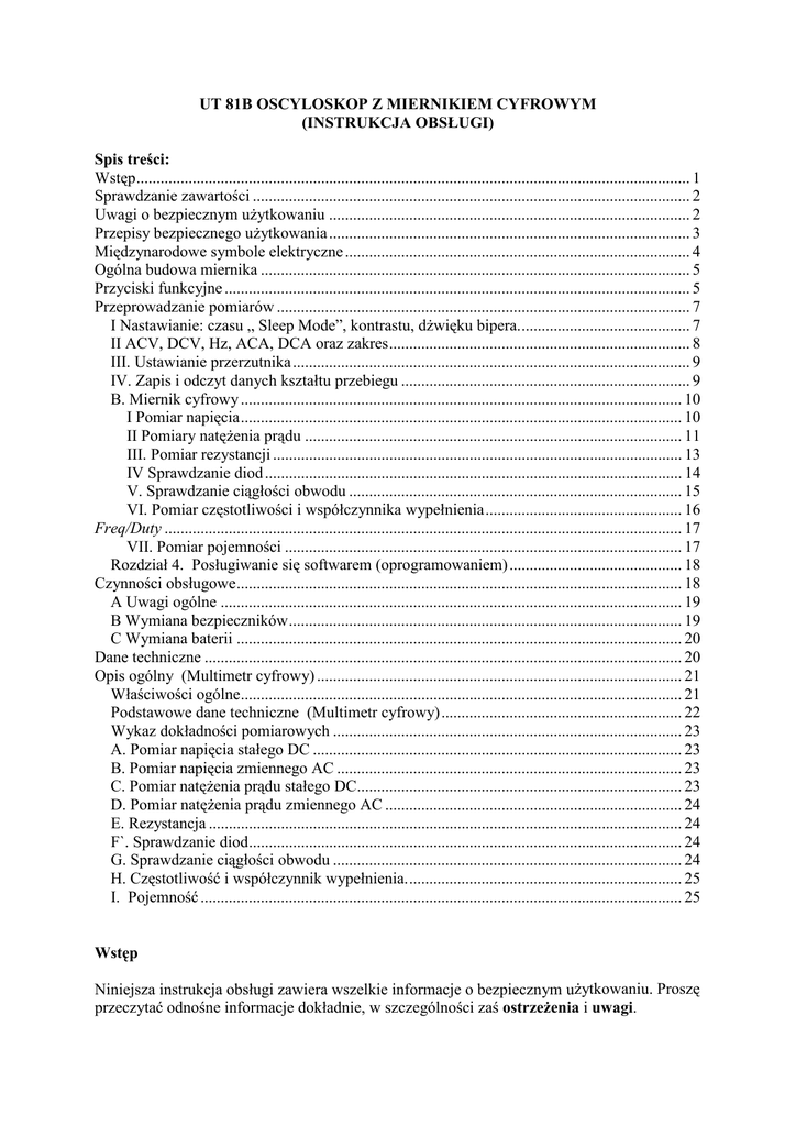 UT 81B OSCYLOSKOP Z MIERNIKIEM CYFROWYM (INSTRUKCJA OBSŁUGI) Spis treści: Wstęp.......................................................................................................................................... 1 Sprawdzanie zawartości ............................................................................................................. 2 Uwagi o bezpiecznym uŜytkowaniu .......................................................................................... 2 Przepisy bezpiecznego uŜytkowania .......................................................................................... 3 Międzynarodowe symbole elektryczne ...................................................................................... 4 Ogólna budowa miernika ........................................................................................................... 5 Przyciski funkcyjne .................................................................................................................... 5 Przeprowadzanie pomiarów ....................................................................................................... 7 I Nastawianie: czasu „ Sleep Mode”, kontrastu, dŜwięku bipera........................................... 7 II ACV, DCV, Hz, ACA, DCA oraz zakres........................................................................... 8 III. Ustawianie przerzutnika ................................................................................................... 9 IV. Zapis i odczyt danych kształtu przebiegu ........................................................................ 9 B. Miernik cyfrowy .............................................................................................................. 10 I Pomiar napięcia.............................................................................................................. 10 II Pomiary natęŜenia prądu .............................................................................................. 11 III. Pomiar rezystancji ...................................................................................................... 13 IV Sprawdzanie diod ........................................................................................................ 14 V. Sprawdzanie ciągłości obwodu ................................................................................... 15 VI. Pomiar częstotliwości i współczynnika wypełnienia................................................. 16 Freq/Duty ................................................................................................................................. 17 VII. Pomiar pojemności ................................................................................................... 17 Rozdział 4. Posługiwanie się softwarem (oprogramowaniem) ........................................... 18 Czynności obsługowe............................................................................................................... 18 A Uwagi ogólne ................................................................................................................... 19 B Wymiana bezpieczników.................................................................................................. 19 C Wymiana baterii ............................................................................................................... 20 Dane techniczne ....................................................................................................................... 20 Opis ogólny (Multimetr cyfrowy) ........................................................................................... 21 Właściwości ogólne.............................................................................................................. 21 Podstawowe dane techniczne (Multimetr cyfrowy)............................................................ 22 Wykaz dokładności pomiarowych ....................................................................................... 23 A. Pomiar napięcia stałego DC ............................................................................................ 23 B. Pomiar napięcia zmiennego AC ...................................................................................... 23 C. Pomiar natęŜenia prądu stałego DC................................................................................. 23 D. Pomiar natęŜenia prądu zmiennego AC .......................................................................... 24 E. Rezystancja ...................................................................................................................... 24 F`. Sprawdzanie diod............................................................................................................ 24 G. Sprawdzanie ciągłości obwodu ....................................................................................... 24 H. Częstotliwość i współczynnik wypełnienia..................................................................... 25 I. Pojemność ........................................................................................................................ 25 Wstęp Niniejsza instrukcja obsługi zawiera wszelkie informacje o bezpiecznym uŜytkowaniu. Proszę przeczytać odnośne informacje dokładnie, w szczególności zaś ostrzeŜenia i uwagi. ! OstrzeŜenie Aby uniknąć poraŜenia prądem elektrycznym lub zranienia, przeczytaj uwaŜnie „Uwagi o bezpiecznym uŜytkowaniu” oraz „Przepisy bezpiecznego uŜytkowania”, zanim zaczniesz uŜytkować miernik. Oscyloskopowy cyfrowy – miernik, Model UT81B (nazywany dalej „miernikiem”) jest przyrządem poręcznym w uŜytkowaniu, posiadającym 3 3/4 cyfrowy, zliczający do 3999 wyświetlacz. Wykorzystując cyfrową technikę sterowania w jednej obudowie skonstruowano dwa przyrządy pomiarowe: oscyloskop i multimetr. Oscyloskop posiada inteligentny system pomiarowy obejmujący sygnał wejś