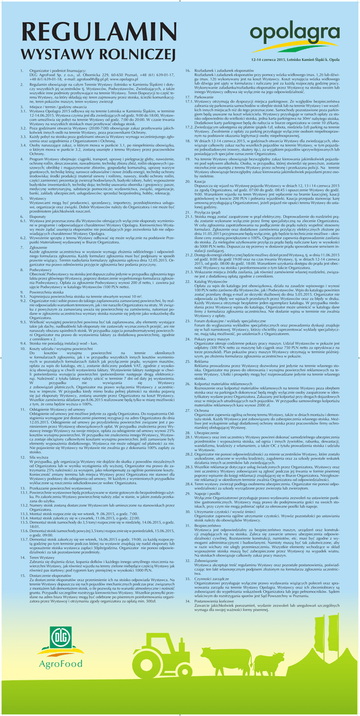 REGULAMIN WYSTAWY ROLNICZEJ 1. Organizator i podmiot finansujący: DLG AgroFood Sp. z o.o., ul. Obornicka 229, 60-650 Poznań, +48 (61) 639-01-17, +48 (61) 639-01-18, e-mail: [email protected]; www.opolagra.pl 2. Regulamin obowiązuje na całym Terenie Wystawy (lotnisko w Kamieniu Śląskim) i dotyczy wszystkich jej uczestników tj. Wystawców, Podwystawców, Zwiedzających, a także wszystkie inne podmioty przebywające na terenie Wystawy. Teren Ekspozycji to część terenu Wystawy, na który składają się: teren zajmowany przez stoiska, ścieżki komunikacyjne, teren pokazów maszyn, teren wystawy zwierząt 3. Miejsce / termin / godziny otwarcia 3.1. Wystawa Opolagra 2015 odbywa się na terenie Lotniska w Kamieniu Śląskim, w terminie 12-14.06.2015. Wystawa czynna jest dla zwiedzających od godz. 9:00 do 18:00, Wystawcom umożliwia się pobyt na terenie Wystawy od godz. 7:00 do 20:00. W czasie trwania Wystawy na wszystkich stoiskach musi przebywać obsługa stoisk. 3.2. Poza godzinami otwarcia Wystawy (20:00-7:00) obowiązuje zakaz przebywania jakichkolwiek innych osób na terenie Wystawy, poza pracownikami Ochrony. 3.3. Każdy pobyt na stoisku poza godzinami otwarcia Wystawy wymaga wcześniejszego zgłoszenia oraz uzgodnienia z Organizatorem i Ochroną. 3.4. Osoby naruszające zakaz, o którym mowa w punkcie 3.1, po niespełnieniu obowiązku, o którym mowa w punkcie 3.2, zostaną usunięte z terenu Wystawy przez pracowników Ochrony. 4. Program Wystawy obejmuje: ciągniki, transport, uprawę i pielęgnację gleby, nawożenie, ochronę roślin, deszczowanie, nawadnianie, technikę zbioru zbóż, roślin okopowych i paszowych; obróbkę i magazynowanie zbiorów, gospodarkę komunalną, uprawę warzyw gruntowych, technikę leśną; surowce odnawialne i nowe źródła energii, technikę ochrony środowiska; środki produkcji (materiał siewny i roślinny, nawozy, środki ochrony roślin, części zamienne); prezentację zwierząt hodowlanych, budynki (obory, hale); wyposażenie budynków inwentarskich, technikę doju; technikę usuwania obornika i gnojowicy; pasze, medycynę weterynaryjną, substancje pomocnicze; wydawnictwa, związki, organizacje, banki, zakłady ubezpieczeń, usługodawców; sprzedaż bezpośrednią, hobby, rekreację. 5. Wystawcy Wystawcami mogą być producenci, sprzedawcy, importerzy, przedsiębiorstwa usługowe, organizacje oraz związki. Dobór Wystawców należy do Organizatora i nie może być przedmiotem jakichkolwiek roszczeń. 6. Eksponaty 6.1. Wystawa jest przeznaczona dla Wystawców oferujących wyłącznie eksponaty wymienione w programie i odpowiadające charakterowi Wystawy Opolagra. Kierownictwo Wystawy może żądać usunięcia eksponatów nie posiadających jego zezwolenia lub nie odpowiadających charakterowi Wystawy Opolagra. 6.2. Wywożenie sprzętu z terenu Wystawy odbywać się może wyłącznie na podstawie Przepustki Materiałowej wydawanej w Biurze Organizatora. 7. Zgłoszenie Każde zgłoszenie uczestnictwa w wystawie wymaga złożenia oddzielnego i odpowiedniego formularza zgłoszenia. Każdy formularz zgłoszenia musi być podpisany w sposób prawnie wiążący. Termin nadsyłania formularzy zgłoszenia upływa dnia 12.05.2015. Organizator ma prawo odmówienia przyjęcie zgłoszenia bez podania przyczyny. 8. Podwystawcy Obecność Podwystawcy na stoisku jest dopuszczalna jedynie w przypadku zgłoszenia tego faktu przez głównego Wystawcę, poprzez dostarczenie wypełnionego formularza zgłoszenia Podwystawcy. Opłata za zgłoszenie Podwystawcy wynosi 200 zł netto, i zawiera już ujęcie Podwystawcy w katalogu Wystawców (100 PLN netto). 9. Powierzchnia stoiska 9.1. Najmniejsza powierzchnia stoiska na terenie otwartym wynosi 10 m². 9.2. Organizator rości sobie prawo do takiego zaplanowania zamawianej powierzchni, by realnie odpowiadało warunkom terenowym, jak i nie naraziło Organizatora na straty. W związku z powyższym za zamawianą uważa się powierzchnię na zamówieniu, natomiast podane w zgłoszeniu uczestnictwa wymiary stoiska rozumie się jedynie jako wskazówkę dla Organizatora. 9.3. Wielkość wynajętej powierzchni powinna być tak zaplanowana, aby elementy wystające takie jak dachy, nadbudówki lub eksponaty nie zastawiały wyznaczonych przejść, ani nie naruszały obszaru sąsiednich stoisk. W przypadku zajęcia ponadnormatywnej powierzchni Organizator ma prawo do wystawienia faktury za dodatkową powierzchnię, zgodnie z cennikiem x 2. 9.4. Stoiska nie posiadają instalacji wod – kan. 10. Koszty udziału / wynajmu powierzchni Do kosztów wynajmu powierzchni na terenie określonych w formularzach zgłoszenia, jak i w przypadku wszystkich innych kosztów wymienionych w pozostałych formularzach (takich jak przyłączenie prądu, wynajem masztów, opłata za wpis do katalogu, etc.), zostanie doliczony podatek VAT, zgodnie z wysokością obowiązującą w chwili wystawienia faktury. Wystawienie faktury następuje w chwili potwierdzenia wynajęcia powierzchni (potwierdzenie następuje drogą elektroniczną). Należność z tytułu faktury należy uiścić w terminie 7 dni od daty jej wystawienia. W przypadku nie wywiązania się Wystawcy z zobowiązań płatniczych, Organizator ma prawo wyłączenia Wystawcy z uczestnictwa w imprezie. W przypadku kiedy mimo braku pełnej płatności na stoisku pojawią się już eksponaty Wystawcy, zostaną usunięte przez Organizatora na koszt Wystawcy. Wszelkie zamówienia składane po 8.06.2015 realizowane będą tylko w miarę możliwości z tym, że cena będzie wyższa o 100%. 11. Odstąpienie Wystawcy od umowy Odstąpienie od umowy jest możliwe jedynie za zgodą Organizatora. Do rozpatrzenia Odstąpienia wymagane jest dostarczenie pisemnej rezygnacji na adres Organizatora do dnia 12.05.2015. Odstąpienie od umowy po przydzieleniu powierzchni związane jest z poniesieniem przez Wystawcę obowiązkowych opłat. W przypadku znalezienia przez Wystawcę innego Wystawcy na swoje mi