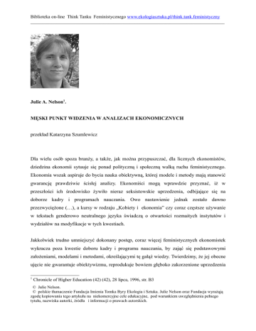 Biblioteka on-line Think Tanku Feministycznego www.ekologiasztuka.pl/think.tank.feministyczny __________________________________________________________________________________ Julie A. Nelson1. MĘSKI PUNKT WIDZENIA W ANALIZACH EKONOMICZNYCH przekład Katarzyna Szumlewicz Dla wielu osób spoza branży, a także, jak można przypuszczać, dla licznych ekonomistów, dziedzina ekonomii sytuuje się ponad polityczną i społeczną walką ruchu feministycznego. Ekonomia wszak aspiruje do bycia nauka obiektywną, której modele i metody mają stanowić gwarancję prawdziwie ścisłej analizy. Ekonomiści mogą wprawdzie przyznać, iż w przeszłości ich środowisko żywiło nieraz seksistowskie uprzedzenia, odbijające się na doborze kadry i programach nauczania. Owo nastawienie jednak zostało dawno przezwyciężone (…), a kursy w rodzaju „Kobiety i ekonomia” czy coraz częstsze używanie w tekstach genderowo neutralnego języka świadczą o otwartości rozmaitych instytutów i wydziałów na modyfikacje w tych kwestiach. Jakkolwiek trudno umniejszyć dokonany postęp, coraz więcej feministycznych ekonomistek wykracza poza kwestie doboru kadry i programu nauczania, by zająć się podstawowymi założeniami, modelami i metodami, określającymi tę gałąź wiedzy. Twierdzimy, że jej obecne ujęcie nie gwarantuje obiektywizmu, reprodukuje bowiem głęboko zakorzenione uprzedzenia 1 Chronicle of Higher Education (42) (42), 28 lipca, 1996, str. B3 © Julie Nelson. © polskie tłumaczenie Fundacja Imienia Tomka Byry Ekologia i Sztuka. Julie Nelson oraz Fundacja wyrażąją zgodę kopiowania tego artykułu na niekomercyjne cele edukacyjne, pod warunkiem uwzględnienia pełnego tytułu, nazwiska autorki, źródła i informacji o prawach autorskich. Biblioteka on-line Think Tanku Feministycznego www.ekologiasztuka.pl/think.tank.feministyczny __________________________________________________________________________________ płciowe. Weźmy ogólną definicję tej dyscypliny, wedle której ekonomia – przy użyciu technik opartych na matematyce - bada racjonalne wybory, podejmowane przez autonomiczne (wykreślone: indywidua) jednostki. Definicja ta opiera się na koncepcjach ludzkiej tożsamości i wiedzy, które są ściśle powiązane z kulturowymi wizjami męskości w naszej kulturze. Do jakiego stopnia owa definicja determinuje postępowanie ekonomistów nie dowie się nikt, kto nie śledzi bieżących akademickich analiz. Ktoś z zewnątrz mógłby na przykład oczekiwać, że dokument pt. „Zachowania pracowników w warunkach kapitalistycznej transformacji” będzie zawierać dane na temat faktycznych postaw ludzi podczas rynkowych przemian w Europie Wschodniej. Osoba zorientowana nie będzie zaskoczona ich brakiem i oparciem analizy na matematycznej teorii gier. Laicy mogliby spodziewać się po ekonomistach spędzania mnóstwa czasu na zbieraniu i studiowaniu danych, tak jak to robią przedstawiciele nauk przyrodniczych czy społecznych; wtajemniczeni wiedzą, że dążą oni do wykorzystywania wciąż na nowo tych samych pobocznych danych - jeśli w ogóle się do jakichś odwołują. Słowem, mimo że ludzie z zewnątrz mogą twierdzić, iż ekonomiści badają to, jak ludzie pracują, dzielą i konsumują dobra, osoby z wewnątrz rozumieją, że nazwa „gra” służy do tego, aby wszystko wytłumaczyć za pomocą pojęć z zakresu teorii racjonalnego wyboru. Rzecz jasna, wielu ekonomistów i ekonomistek robi użytek z empirycznych danych i z powodzeniem zajmuje się kwestiami politycznymi, lecz odbywa się to raczej pomimo niż z powodu otrzymanej edukacji i wpajanych w jej trakcie wartości, związanych z tak zwaną profesjonalną ekonomią. Ktoś mógłby bronić nacisku na abstrakcyjną teorię i odcieleśnione techniki statystyczne wskazując, że to właśnie one konstytuują „zręby nauki”. Nie uważamy, że fizycy teoretyczni zajmują się elektrycznością by naprawiać zepsute tostery; dlaczego zatem po akademickich ekonomistach oczekiwać ulepszania porządku społecznego? Problem z ową analogią polega na tym, że modele elektryczności muszą odpowiadać empirycznym obserwacjom (stanowiących między innymi podstawę działania tosterów), podczas gdy współczesna teoria ekonomiczna opiera się na szeregu przyjętych a priori postulatów, które koncentrują się na kilku wyizolowanych aspektach ludzkiego zachowania. Biblioteka on-line Think Tanku Feministycznego www.ekologiasztuka.pl/think.tank.feministyczny __________________________________________________________________________________ Dominujący model ekonomiczny ujmuje ludzi jako racjonalne, autonomiczne, skupione na własnej korzyści i wolne jednostki, zdolne wybierać pomiędzy różnymi opcjami postępowania. Logicznym przeciwieństwem tego ujęcia byłoby postrzegać ludzi jako powiązanych z innymi i zainteresowanych ich korzyścią; jako emocjonalnych, uzależnionych od czyichś decyzji oraz podlegających wpływom środowiska społecznego i naturalnego. Nie przypadkiem pierwszy zestaw cech był w zachodniej kulturze kojarzony ze stereotypową męskością, podczas gdy przez pryzmat drugiego tradycyjnie postrzegano kobiecość. Analogicznie, metody związane z wyizolowaniem, dedukcją matematyczną, formalizmem i abstrakcją wartościowane są pozytywnie i uznane za męskie, podczas gdy nieformalność, skupienie na konkretach, współzależność i werbalna komunikacja uważa się zwykle za mniej cenne i przypisuje kobietom. Feministyczne ekonomistki utrzymują, że wybór określonych modeli, tematów i metod właściwych ekonomii nie polega na racjonalnym rozważeniu ich względnej ważności czy efektywności, lecz wyłania się na skutek procesów silnie uzależnionych od tego, które cechy i typy działania jej przedstawiciele postrzegają jako męskie, a które jako kobiece. Tradycyjni ekonomiści lubią skupiać się na „twardych” obszarach życia publicznego (do jakich zaliczaj